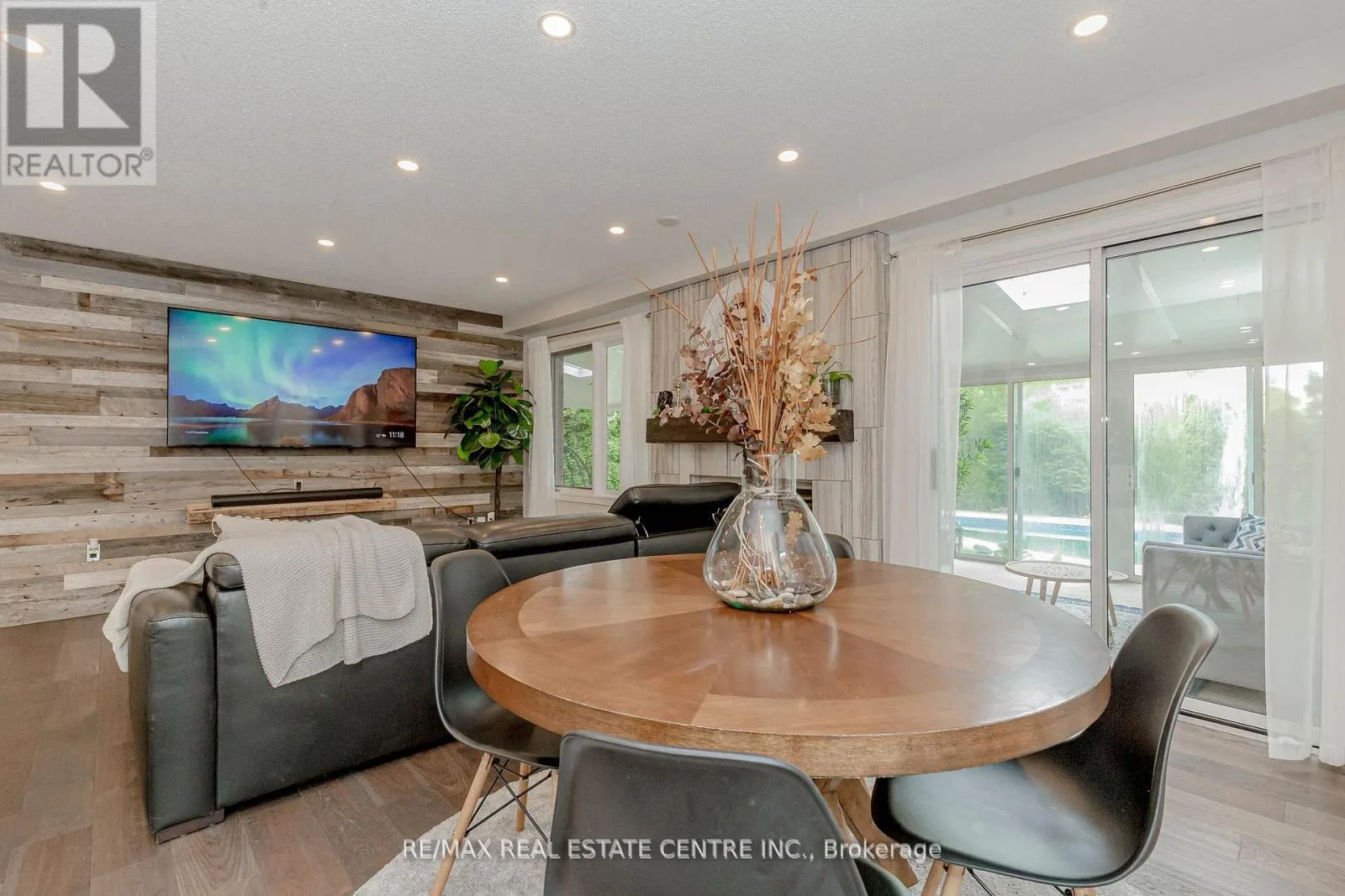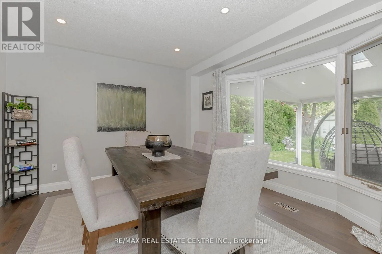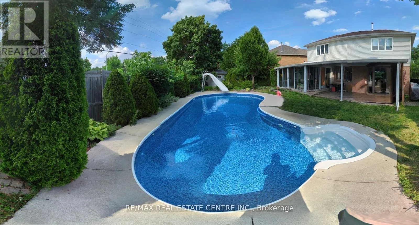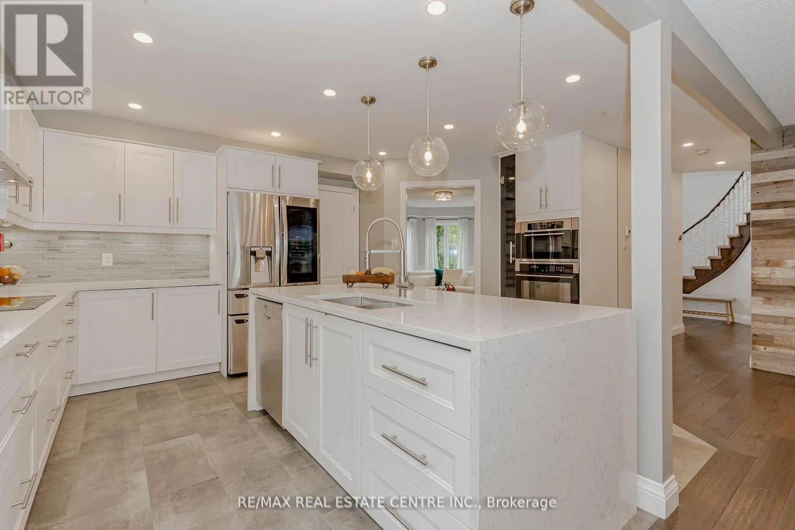 Parkside/Hollybush/Strathroy Stunning 3 bedrooms exec. double garage detached house 2566 sq. ft. (converted from 4 bedroom plan) on a premium 131' deep pie-shaped lot that is 61' wide across back of the house! Main floor has a bright & airy high ceiling foyer. New upgraded staircase and new wood flooring 2nd floor and landing areas (2026), upgraded wide-plank hardwood floors, formal liv. room with bay window, spacious dining room w/coffered ceiling & wainscotting, large family room w/rustic wood feature wall, gas fireplace w/porcelain tile surround & sliding door walk-out to sun room with skylight & walk-outs to back yard. Completely renovated designer kitchen w/custom white cabinetry, quartz counters, high-end built-in S/S appliances, large island with breakfast bar, open to family room. The professionally landscaped backyard oasis with covered interlock stone patio, BBQ area, lighting & inground heated saltwater pool w/newer liner (2019), new pool heater & pool pump (2025), great for time spend w/family and friends! (id:27476)