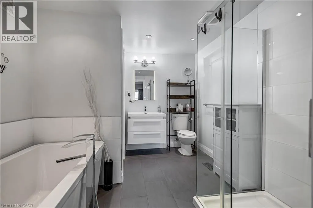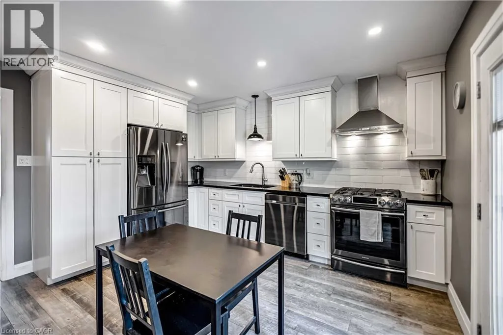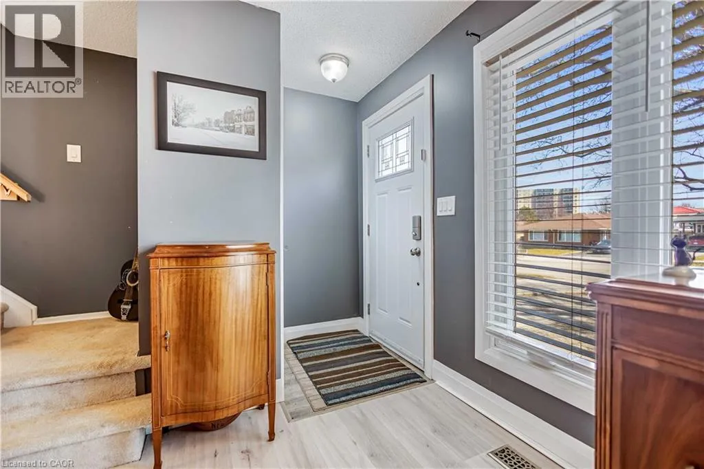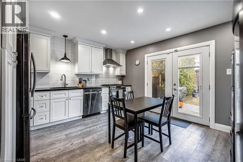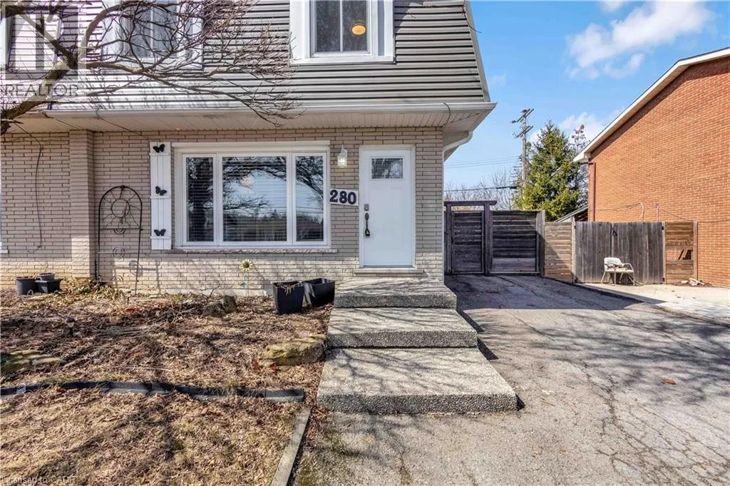 Take Greenhill Ave exit off the Red Hill Valley Parkway, then turn left onto Quigley Road. Welcome to 280 Quigley Road, a beautifully maintained and thoughtfully updated semi detached home in one of Hamiltonâs most desirable family friendly neighbourhoods, offering approximately 1200 sq ft of comfortable living space just minutes from top rated schools, parks, shopping, transit and easy highway access, along with a rare 5 car driveway providing ample parking for family and guests. Step inside to a bright and inviting main level featuring a spacious living room with durable laminate flooring and a large front bay window updated approximately 5 years ago that fills the space with natural light. The layout flows seamlessly into the updated kitchen completed in 2017, designed with both style and functionality in mind, showcasing white shaker style cabinetry, sleek dark quartz countertops, stainless steel appliances from 2017 and a classic subway tile backsplash, while French doors provide direct access to the backyard creating a perfect indoor outdoor flow for everyday living and entertaining, along with the convenience of a 2 piece bathroom just off the kitchen. Upstairs, the expansive primary bedroom offers a peaceful retreat with ensuite privilege to the beautifully renovated 4 piece bathroom updated in 2017, while two additional well sized bedrooms provide flexibility for family, guests or a home office. The fully finished basement adds valuable living space with a versatile recreation area ideal for a media room, playroom or workspace and features a side separate entrance off the stairs leading to the basement. Outside, enjoy a private fully fenced backyard designed for both relaxation and entertaining featuring a generous patio and garden shed. Additional updates include roof shingles in 2014, an owned tankless water heater from 2017 and windows updated approximately 9 years ago excluding the front bay window, making this move in ready home an exceptional opportunity in a sought after Hamilton location. (id:27476)