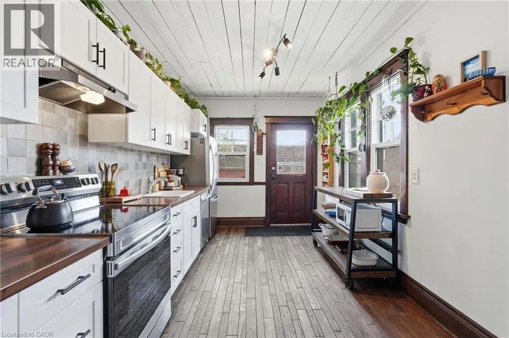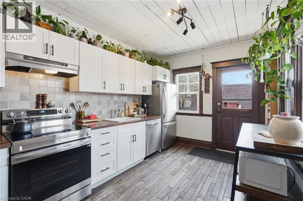 Left on Burris from Main St or left on Burris from King St Welcome to 16 Burris Street! This charming 3-bedroom, 1.5-bath home offers 1,514 sq ft of character, warmth and thoughtful updates throughout. The inviting main floor features a bright living space, convenient powder room and a cozy gas fireplace added in 2023. The refreshed kitchen includes new cabinet fronts (2026) and appliances (2025), blending modern convenience with timeless charm. Upstairs you'll find three spacious bedrooms and a refreshed full bathroom. The separate side entrance offers excellent in-law suite potential, while the basement provides additional storage. Outside, enjoy the welcoming front porch, newly paved driveway and private backyard. Major updates include windows throughout the entire home including the basement (2023/2024), roof, soffits and eaves (2023), asphalt driveway (2023), Furnace, A/C and hot water tank (2019). A rare opportunity to own a beautifully updated character-filled home in a convenient Hamilton location. (id:27476)