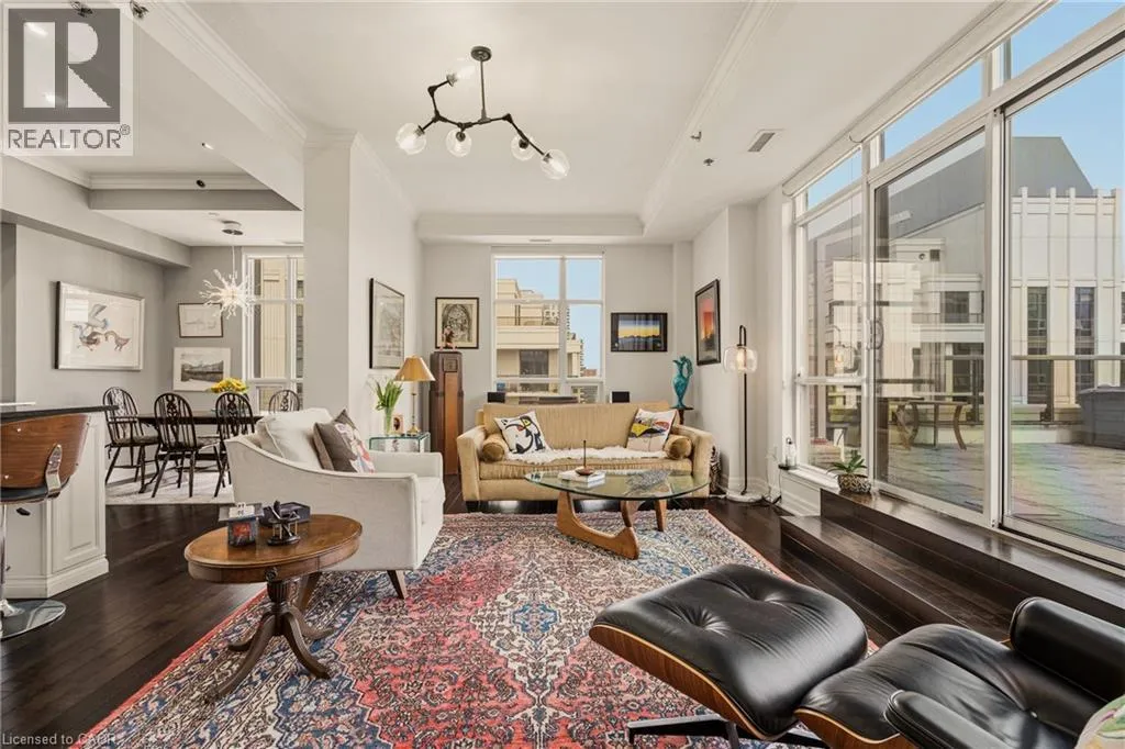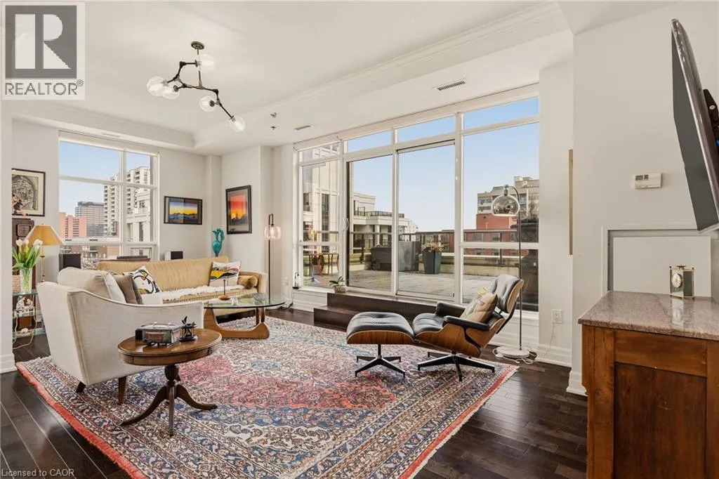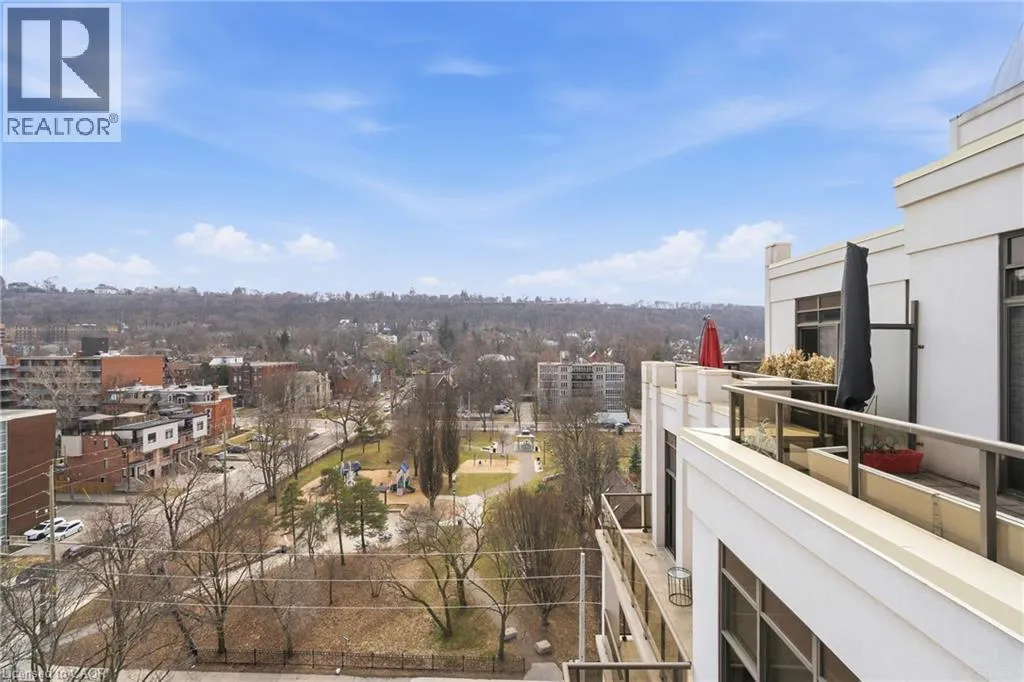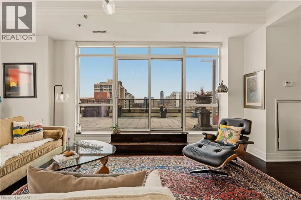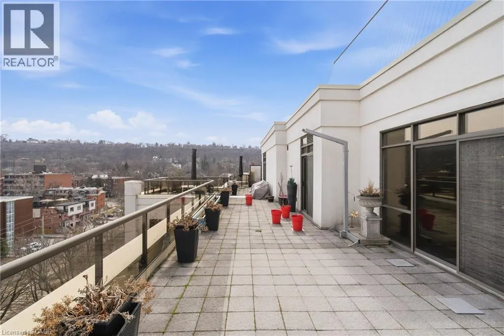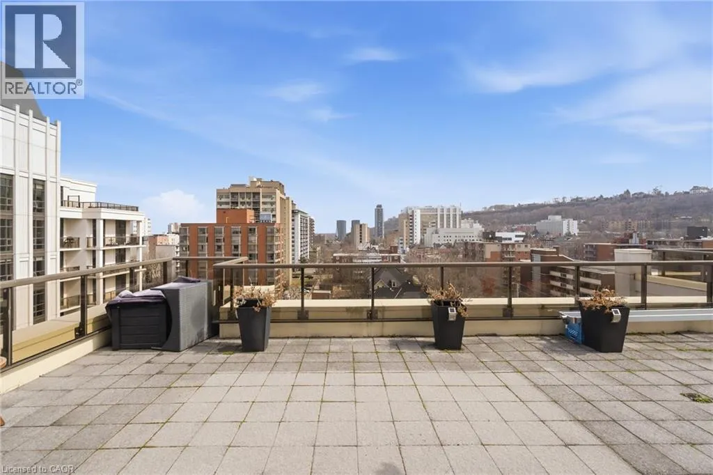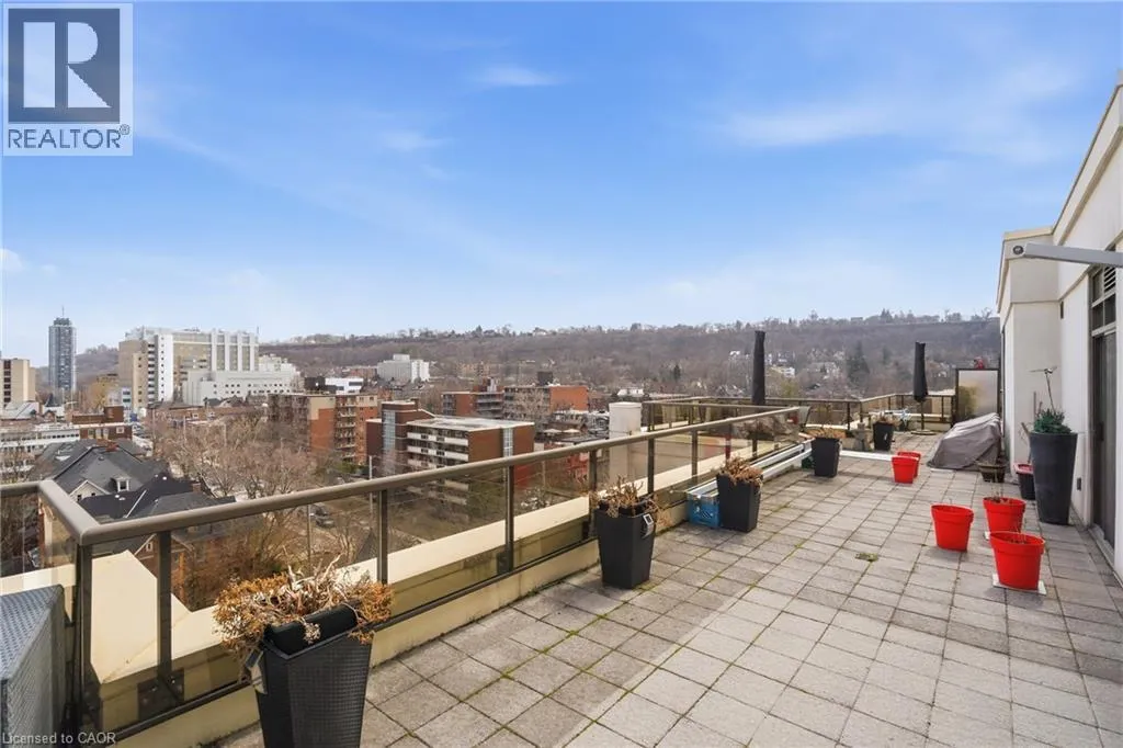 MAIN ST W TO PARK ST S TO CHARLTON AVE W Perched above the vibrant core of downtown Hamilton, this extraordinary penthouse redefines condo living with an unmatched blend of space, style, and outdoor luxury. Spanning an impressive 1,740 sq ft, this rare corner suite is bathed in natural light and showcases sweeping south-eastern views of the city skyline and the stunning escarpment from virtually every angle. Step inside to a thoughtfully designed open-concept layout that offers both flow and distinction, with unique living spaces that cater to everyday comfort and effortless entertaining. The living room and kitchen are the heart of the home, beautifully appointed with high-end finishes, striking stone countertops, and a generous island with bar seatingâperfect for gathering with friends or preparing meals in style. Floor-to-ceiling windows and a sliding glass walk-out seamlessly connect the indoors to an extraordinary outdoor experience. The crown jewel? An expansive private rooftop terrace of almost 1,400 sq ftâan entertainerâs dream and a true urban oasis accessible from the living room, den, and primary bedroom. Whether you're hosting summer soirées, enjoying morning coffee, or unwinding under the stars, this space delivers a lifestyle rarely found in condo living. The bright and spacious primary suite features a 3-piece ensuite and a large walk-in closet. A well-proportioned second bedroom offers its own private balcony retreat, while the versatile den is ideal for a home office or guest space. A 4-piece bathroom, and convenient in-suite laundry complete this exceptional offering. Residents also enjoy a Party Room, Exercise Room and dedicated Bike Room. All of this in a prime downtown location, steps to Hamiltonâs best dining, shopping, schools, and transitâwhere city living meets elevated comfort in a truly one-of-a-kind penthouse residence. (id:27476)