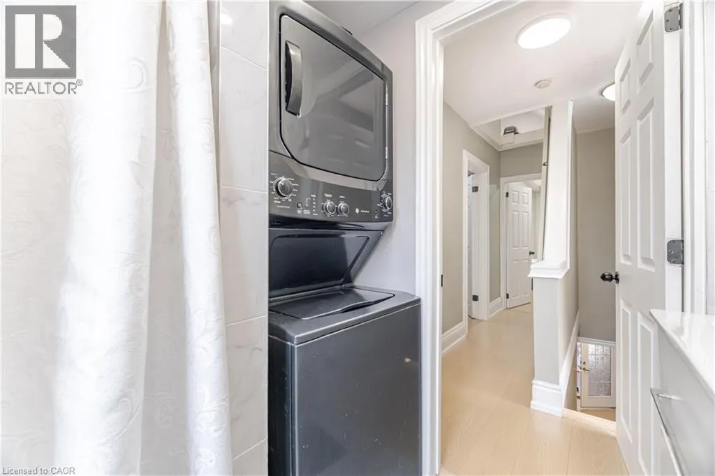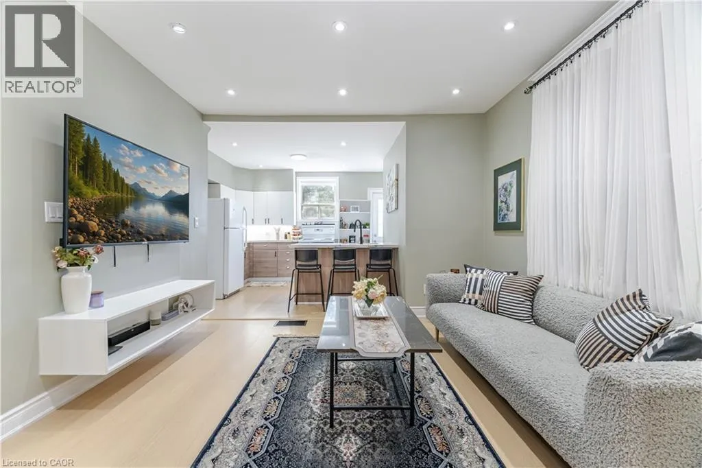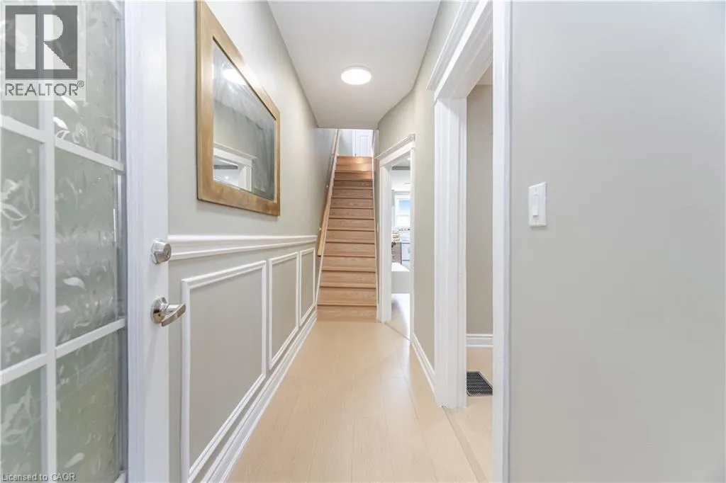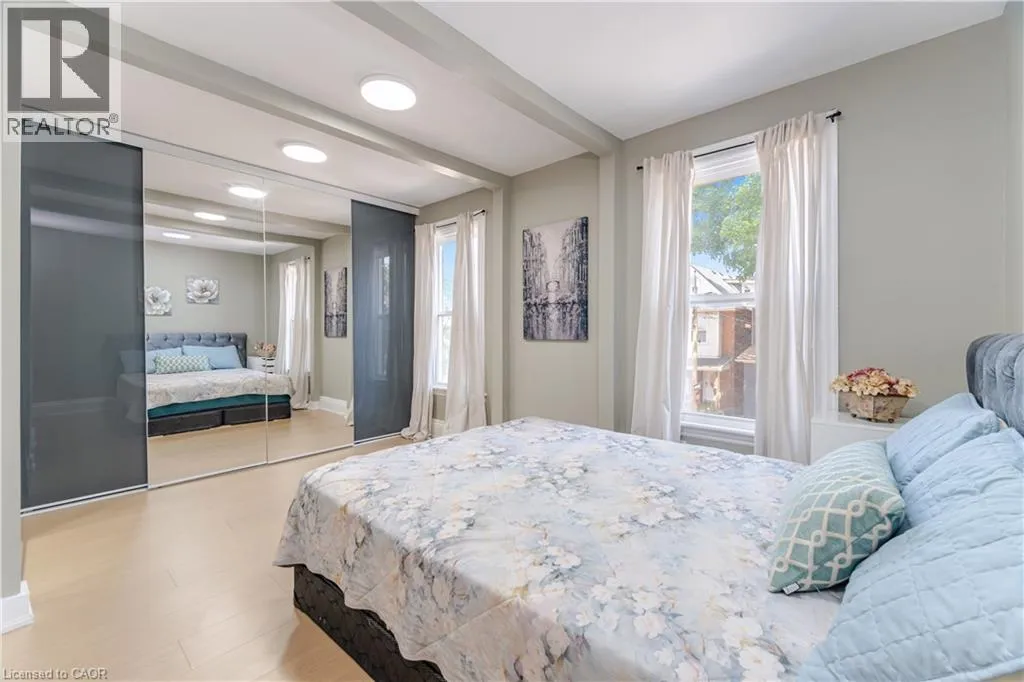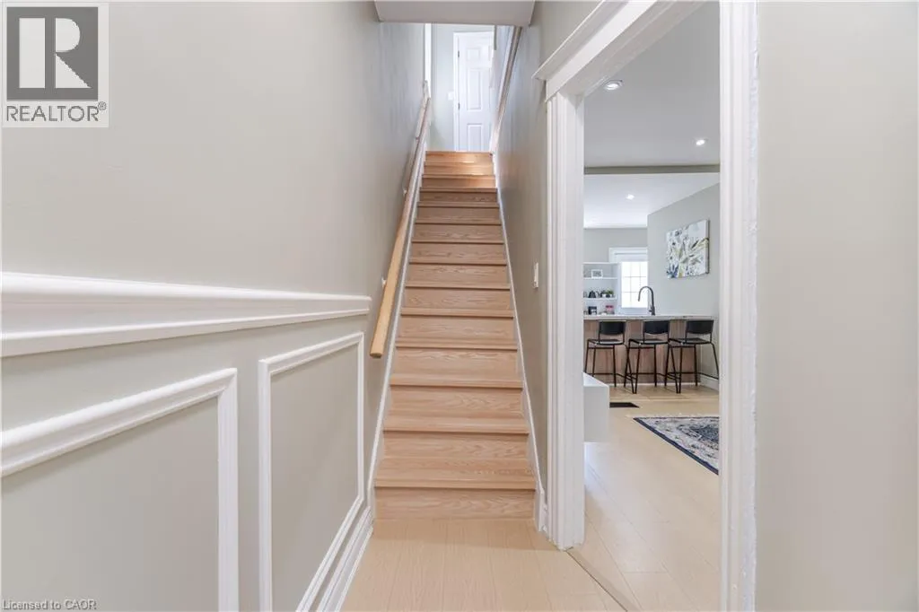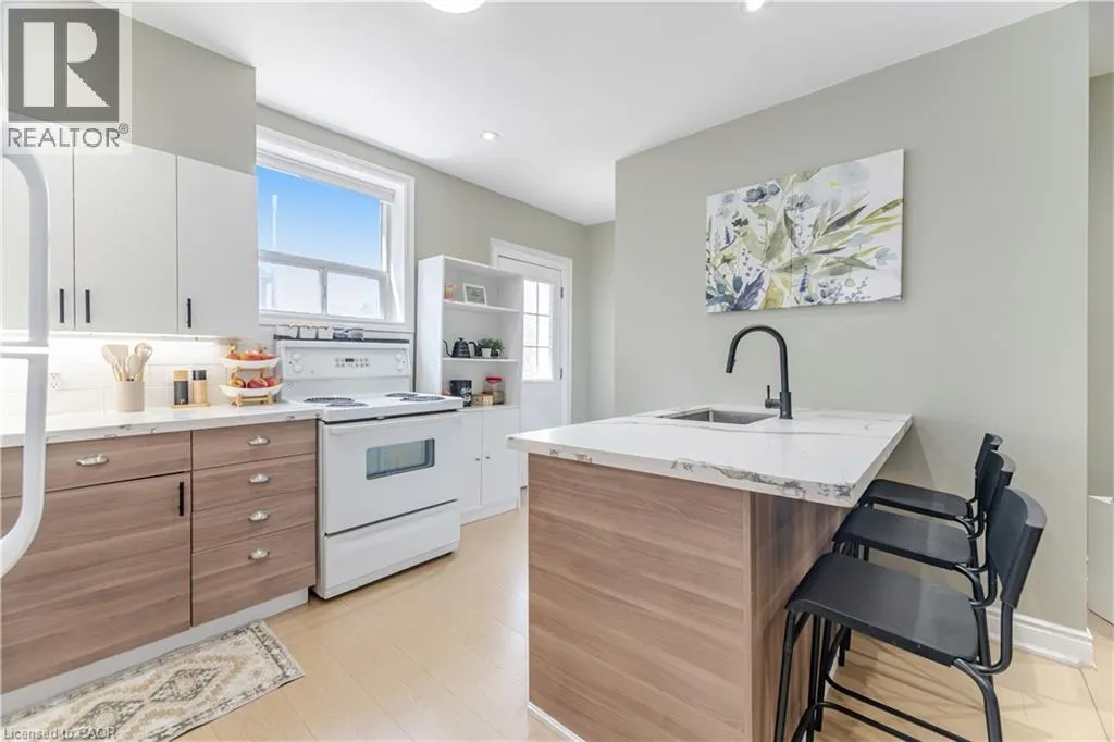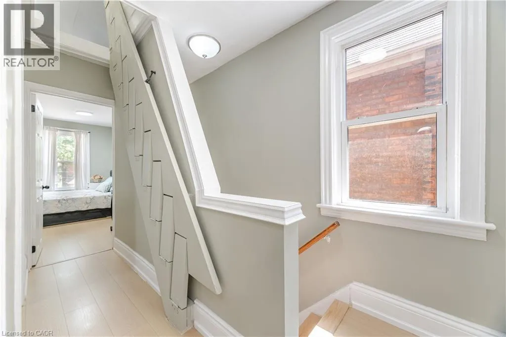 Wentworth St N to Wilson St to Stirton St Welcome to 61 Stirton St a beautifully renovated Victorian-style home in the heart of Hamilton, where timeless character meets modern upgrades. This move-in ready 3-bedroom, 2-bathroom detached double-brick home offers a bright interior and a functional layout ideal for everyday living. The main level features 9-foot ceilings, fresh paint, and durable waterproof laminate flooring. The open-concept kitchen is designed for both function and entertaining, complete with a modern island, valance lighting, and new quartz countertops and backsplash, overlooking a private, fully fenced backyard. The yard was professionally regraded with exposed concrete and stamped borders, perfect for outdoor enjoyment. Additional features include LED pot lights, second-floor laundry, an enclosed front porch, and new Red Oak stairs. The finished attic adds versatile living space. Major updates include: roof shingles (2023), central A/C (2022), gas furnace (2023), full interior waterproofing with lifetime warranty (2022), exterior waterproofing (2022), updated windows, and lead pipe removal (2021). Includes one parking space. A fantastic opportunity in a central Hamilton location-don't miss it! (id:27476)