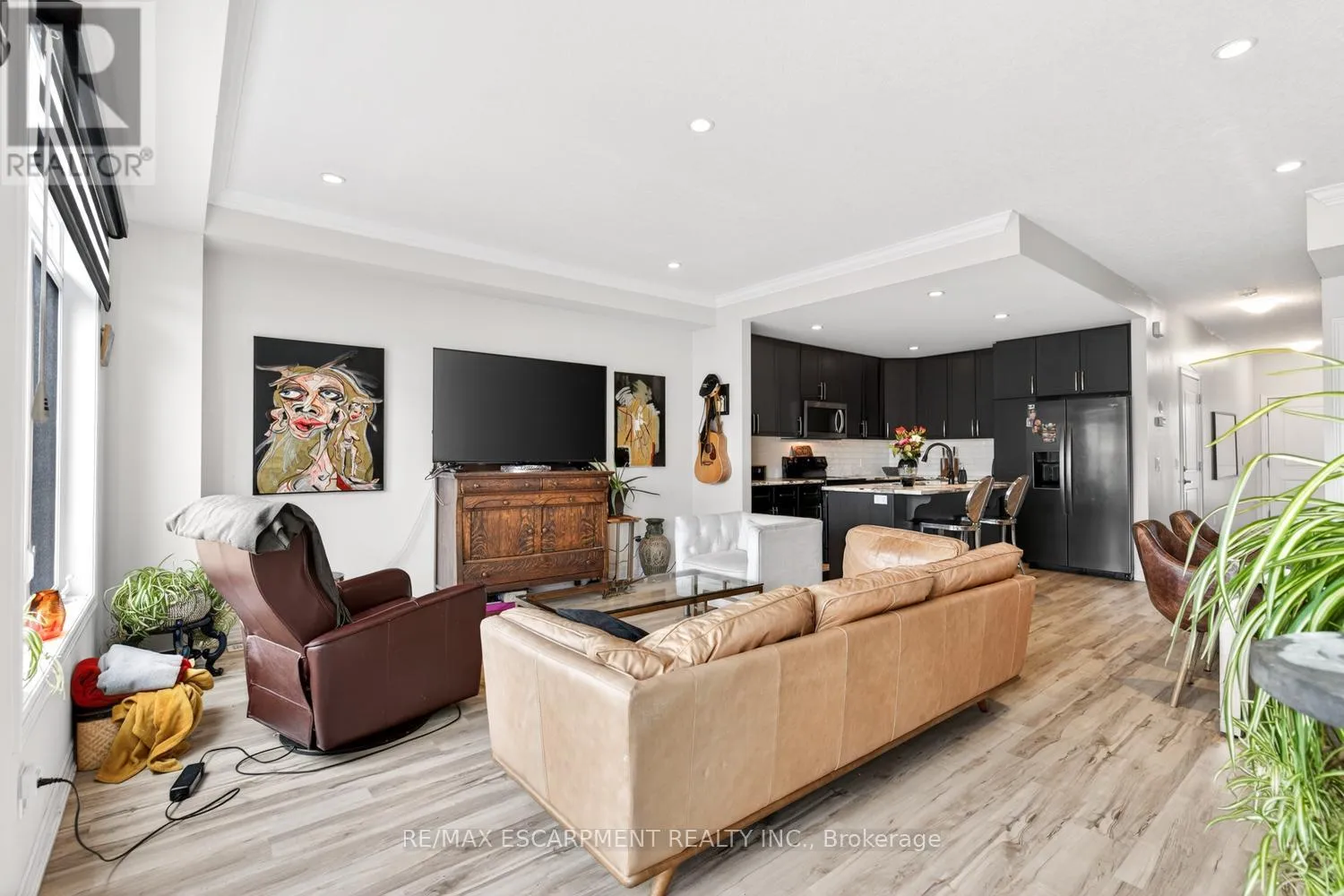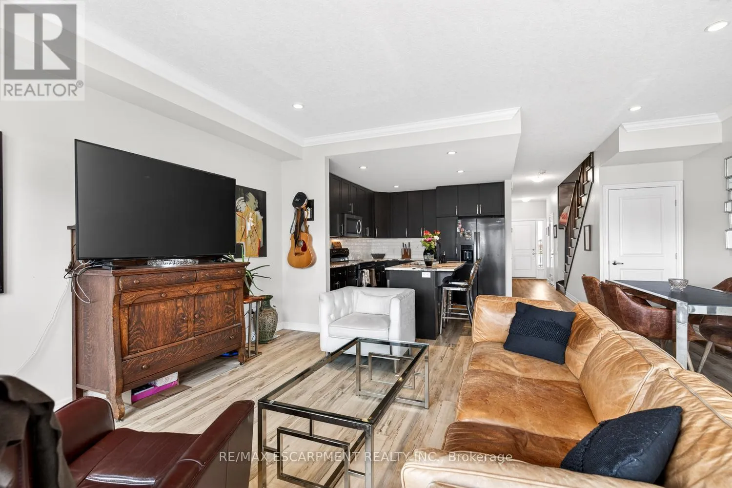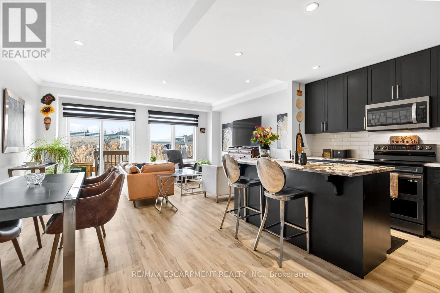 Cross Streets: Baseline Rd. ** Directions: Winona Rd - Baseline Rd. Beautiful 3 bedroom, 2.5 bathroom townhome with over 2,200 sq ft of finished living space. Bright open concept main floor with modern flooring, pot lights, and spacious living and dining areas. Stylish kitchen with dark cabinetry, stone countertops, stainless steel appliances, subway tile backsplash, and large island with breakfast bar. Upper level offers a generous primary bedroom, two additional bedrooms, and convenient second-floor laundry. Finished lower level provides extra living space for a rec room, office, or gym. Private fenced backyard with deck and patio area. Attached garage with driveway parking. Great location close to parks, schools, shopping, and quick highway access. (id:27476)