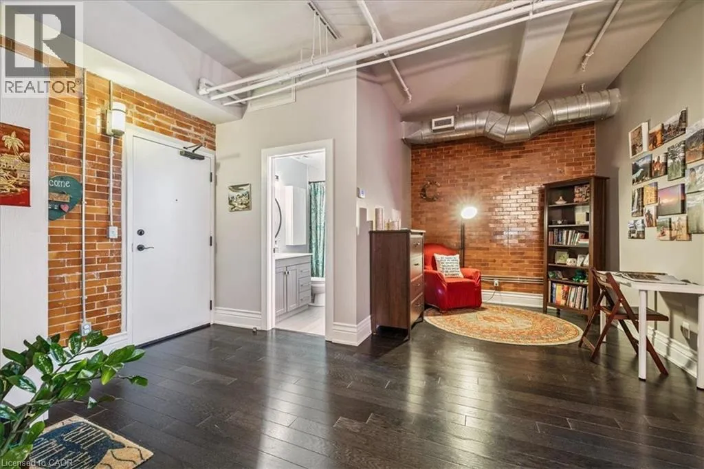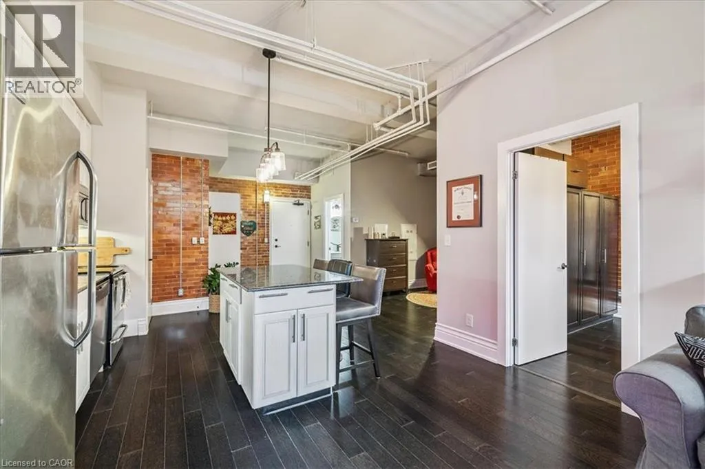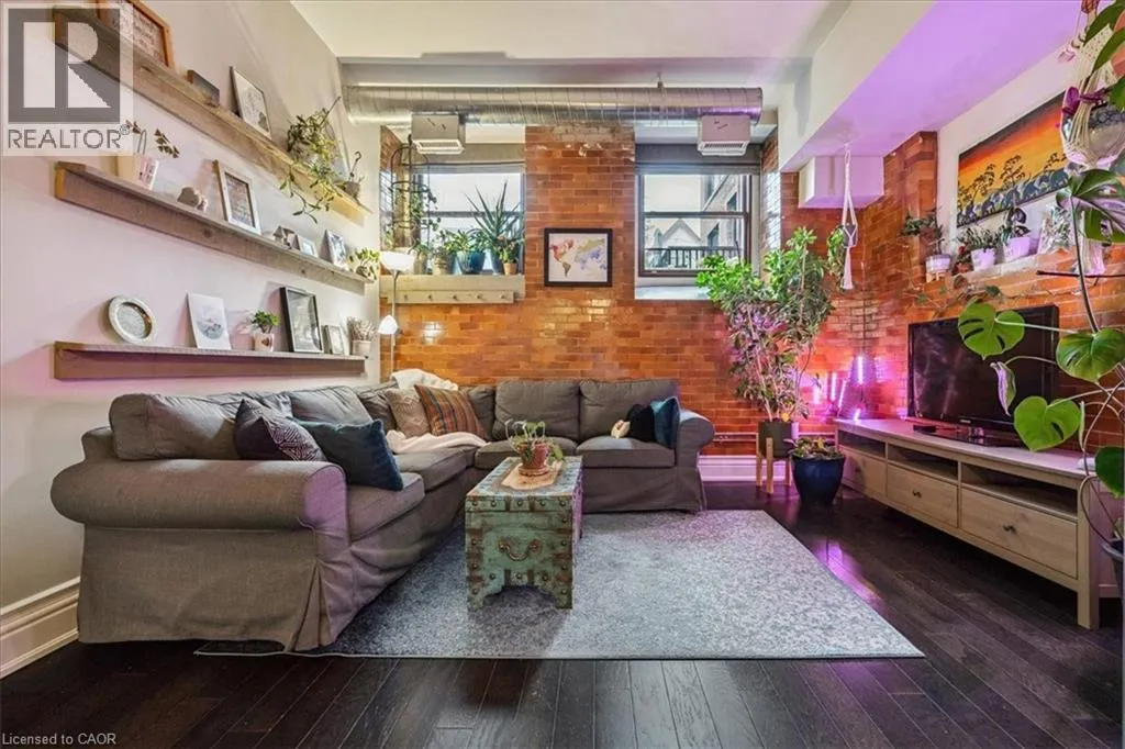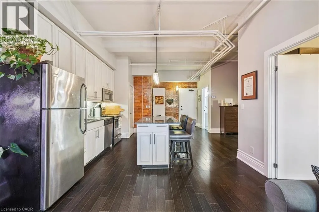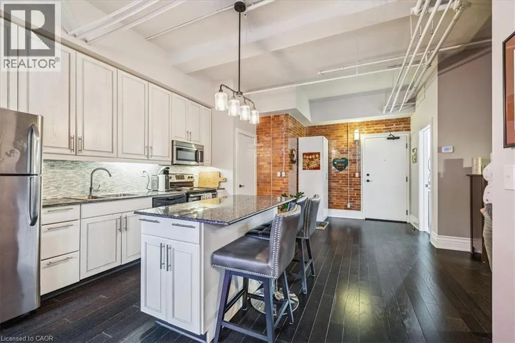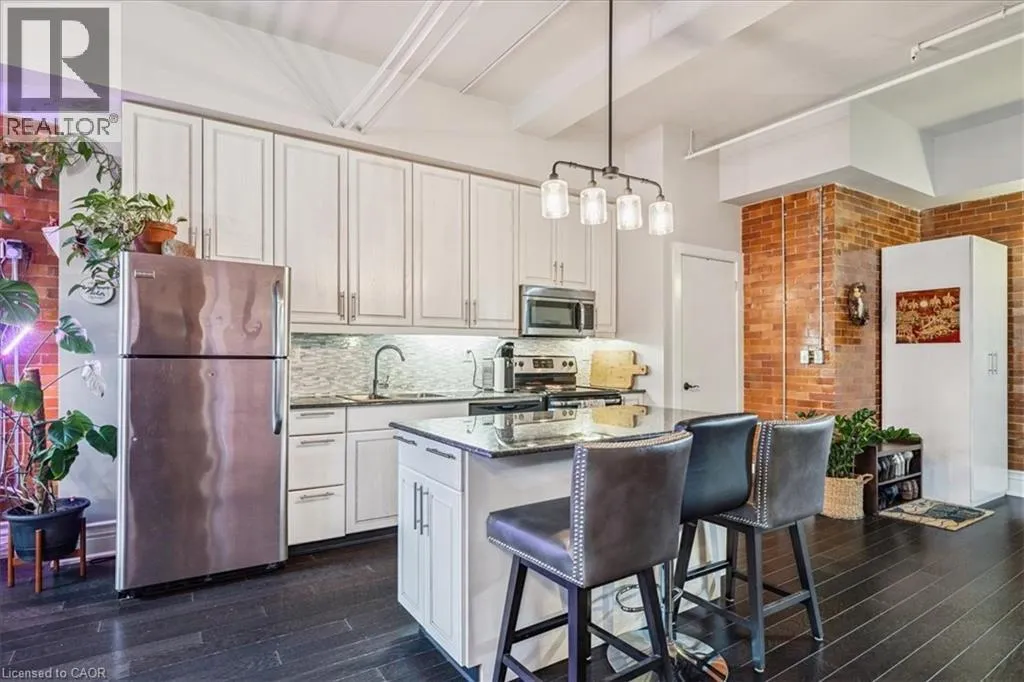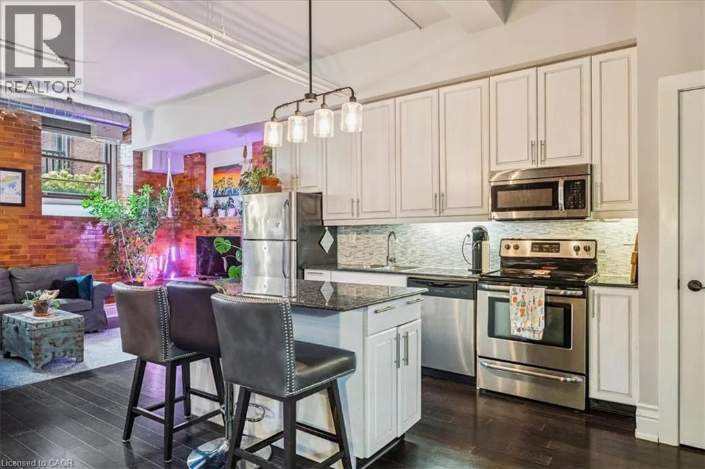 Charming loft-style condo in the heart of Hamilton, set within a beautifully converted schoolhouse dating back to 1894 and rich in architectural character. This spacious open-concept one bedroom, one bathroom offers an ideal blend of historic charm and modern updates. Featuring soaring 10' ceilings, large windows that flood the space with natural light, and glazed ceramic exposed brick accents, this carpet-free unit exudes warmth and style. The designer kitchen is complete with a centre island, granite countertops and stainless steel appliances which flows seamlessly into the living area. A versatile additional flex space offers the opportunity for a home office, den, library or separate dining area. Additional highlights include in-suite laundry, a renovated four-piece bathroom and hardwood flooring throughout. Perfect for professionals, first-time buyers, or downsizers. Conveniently located just minutes from the city centre with easy access to highways, transit, and a wide range of amenities. Don't miss it! (id:27476)
