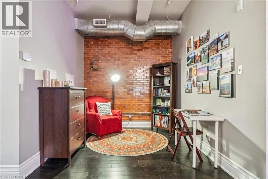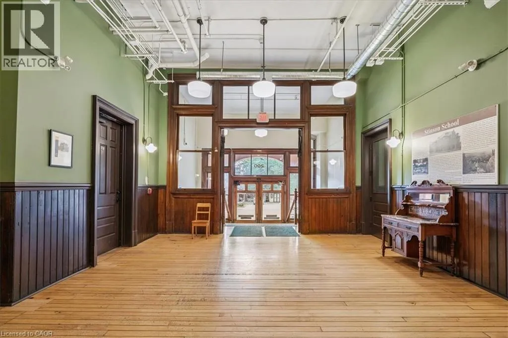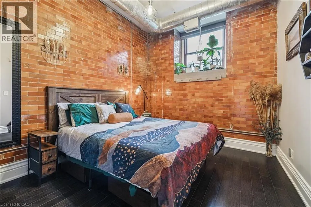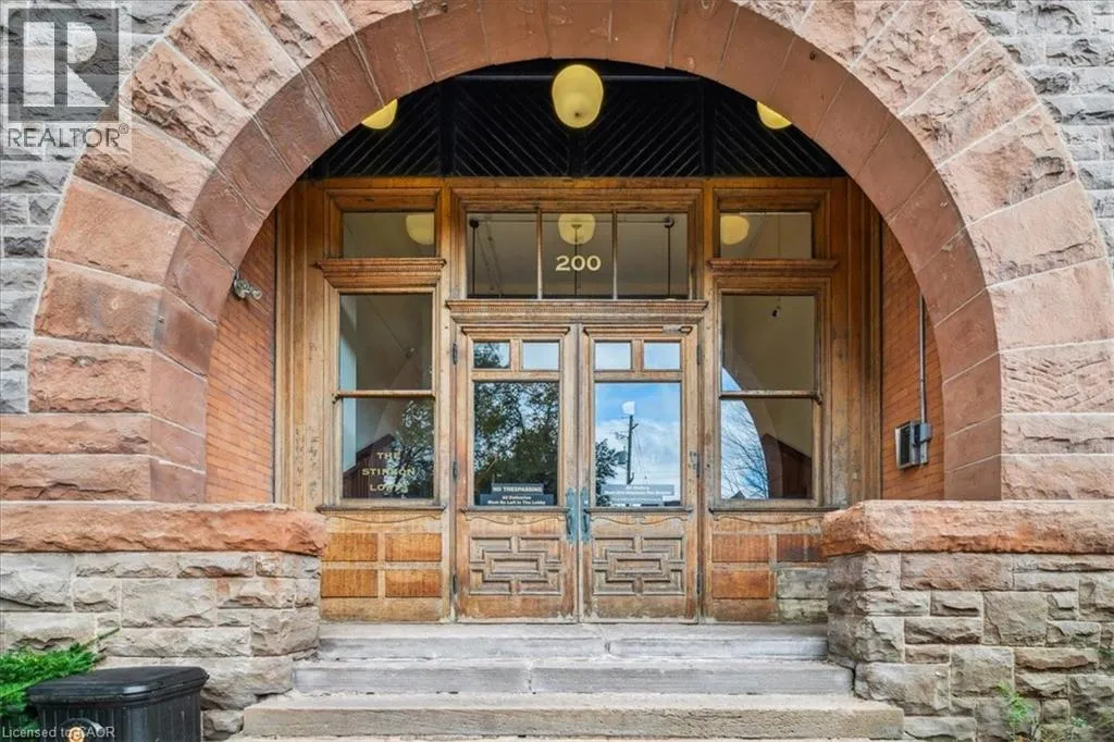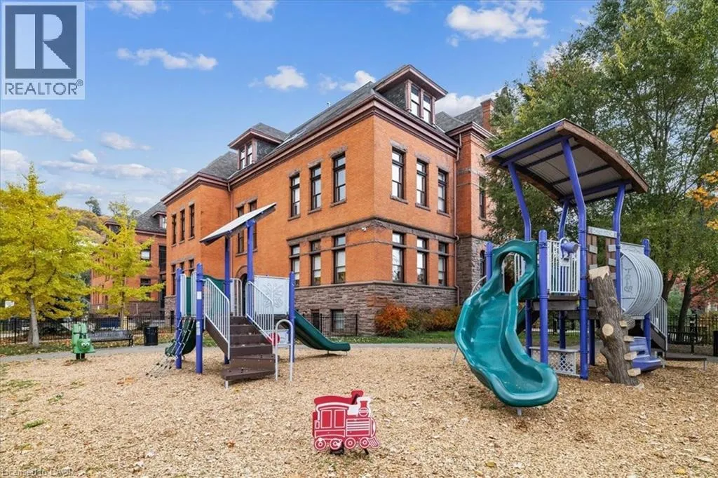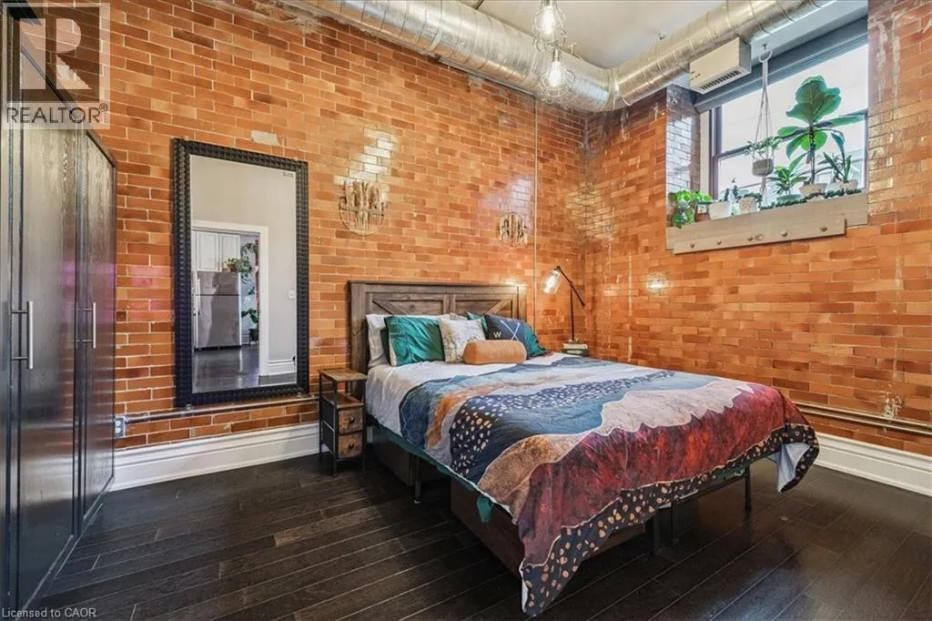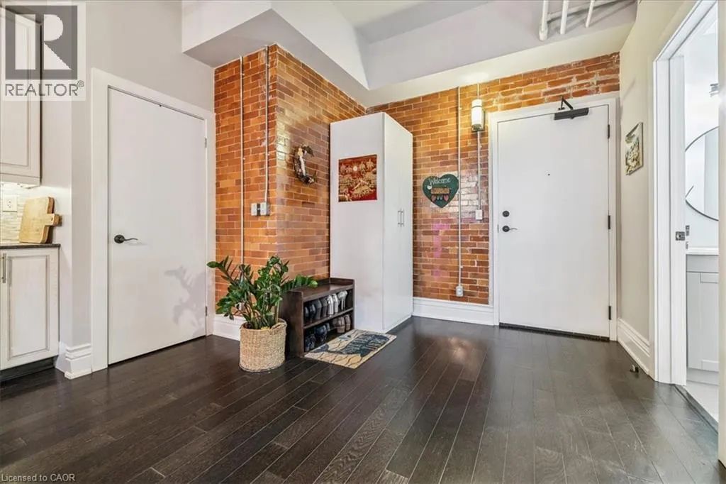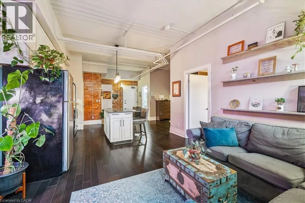 Charming loft-style condo in the heart of Hamilton, set within a beautifully converted schoolhouse dating back to 1894 and rich in architectural character. This spacious open-concept one bedroom, one bathroom offers an ideal blend of historic charm and modern updates. Featuring soaring 10' ceilings, large windows that flood the space with natural light, and glazed ceramic exposed brick accents, this carpet-free unit exudes warmth and style. The designer kitchen is complete with a centre island, granite countertops and stainless steel appliances which flows seamlessly into the living area. A versatile additional flex space offers the opportunity for a home office, den, library or separate dining area. Additional highlights include in-suite laundry, a renovated four-piece bathroom and hardwood flooring throughout. Perfect for professionals, first-time buyers, or downsizers. Conveniently located just minutes from the city centre with easy access to highways, transit, and a wide range of amenities. Don't miss it! (id:27476)