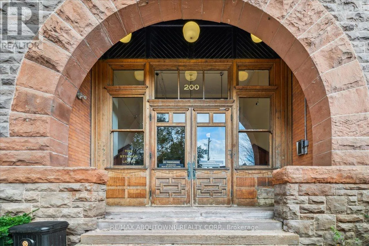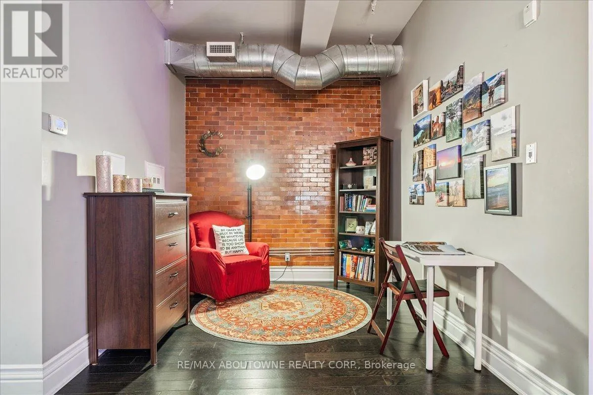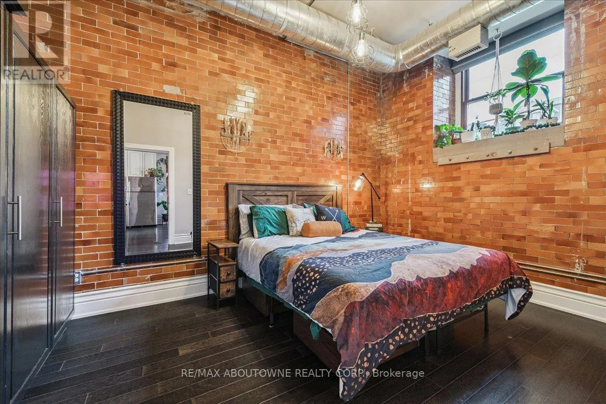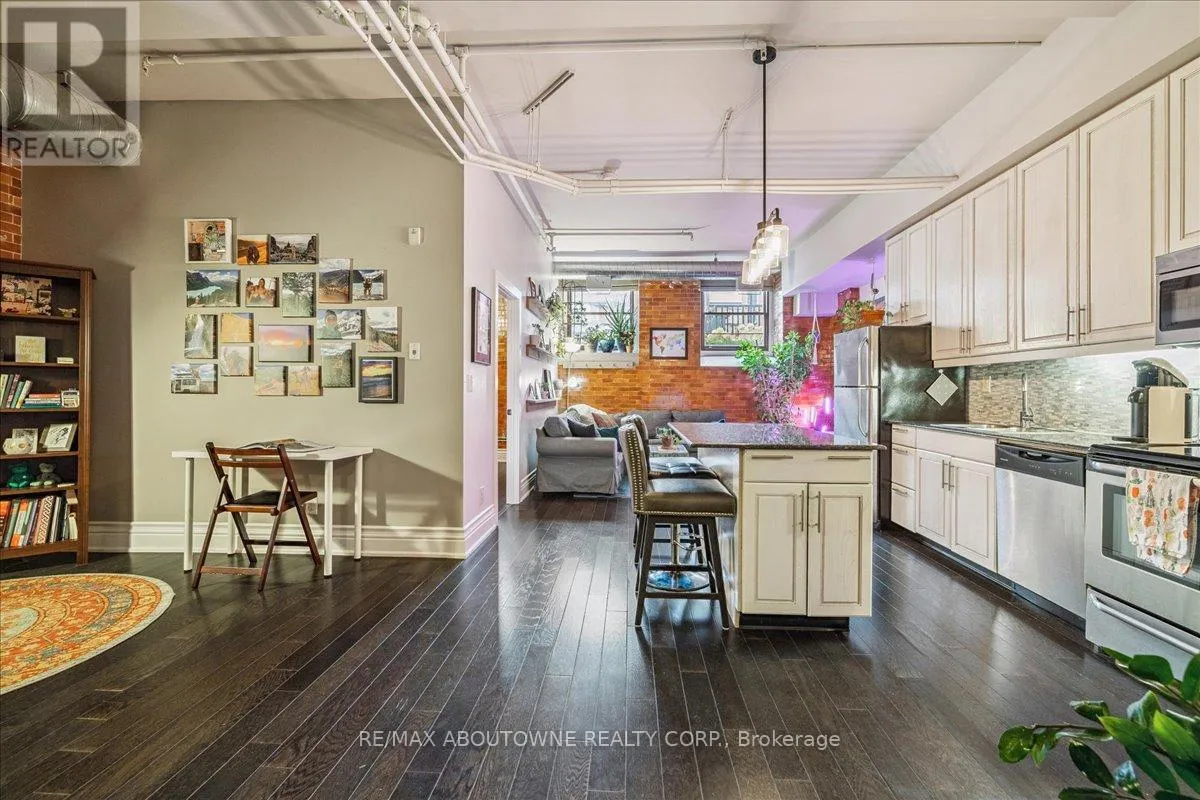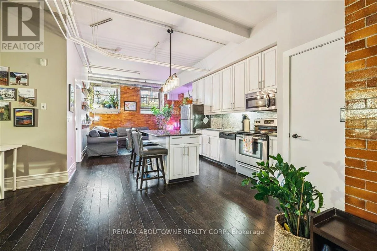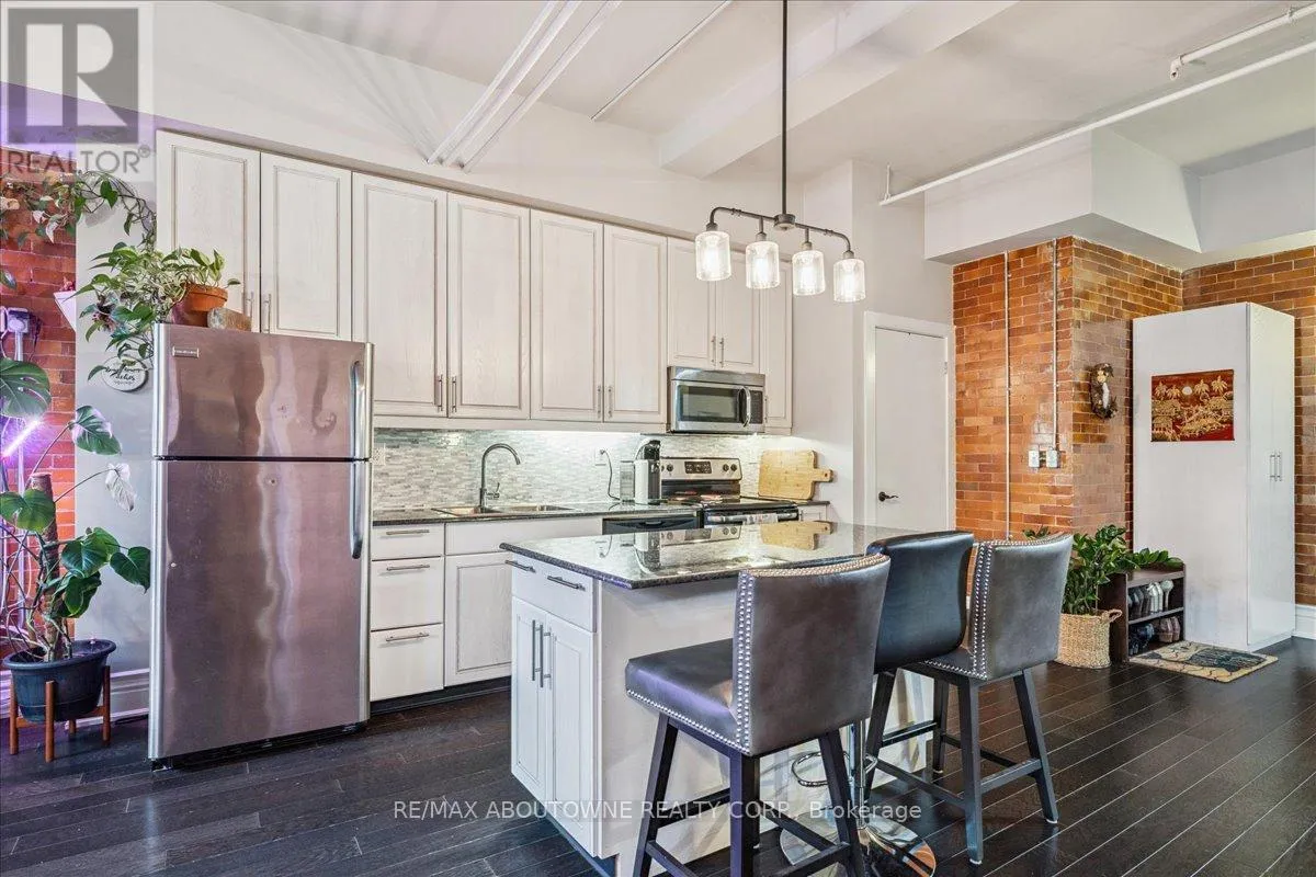 Cross Streets: Wentworth/Stinson. ** Directions: Wentworth St N/ West on Stinson. Charming loft-style condo in the heart of Hamilton, set within a beautifully converted schoolhouse dating back to 1894 and rich in architectural character. This spacious open-concept one bedroom, one bathroom offers an ideal blend of historic charm and modern updates. Featuring soaring 10' ceilings, large windows that flood the space with natural light, and glazed ceramic exposed brick accents, this carpet-free unit exudes warmth and style. The designer kitchen is complete with a centre island, granite countertops and stainless steel appliances which flows seamlessly into the living area. A versatile additional flex space offers the opportunity for a home office, den, library or separate dining area. Additional highlights include in-suite laundry, a renovated four-piece bathroom and hardwood flooring throughout. Perfect for professionals, first-time buyers, or downsizers. Conveniently located just minutes from the city centre with easy access to highways, transit, and a wide range of amenities. Don't miss it! (id:27476)