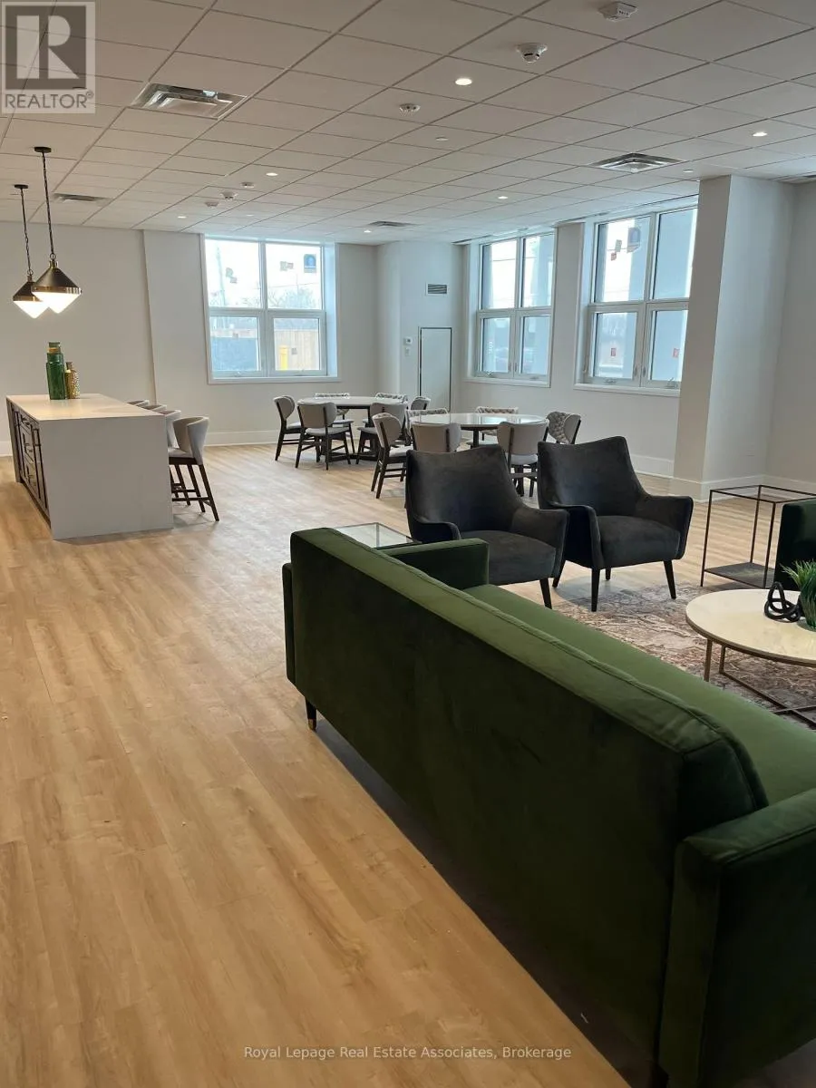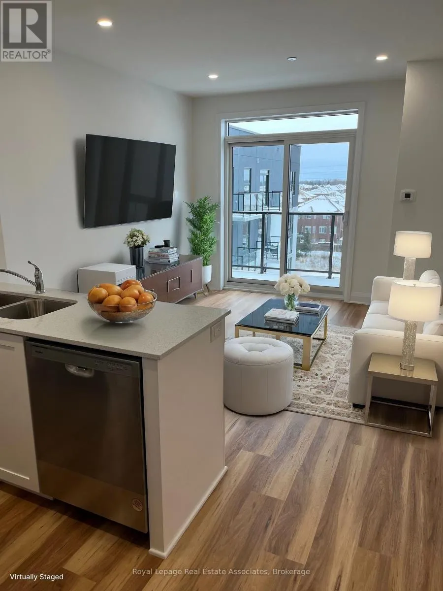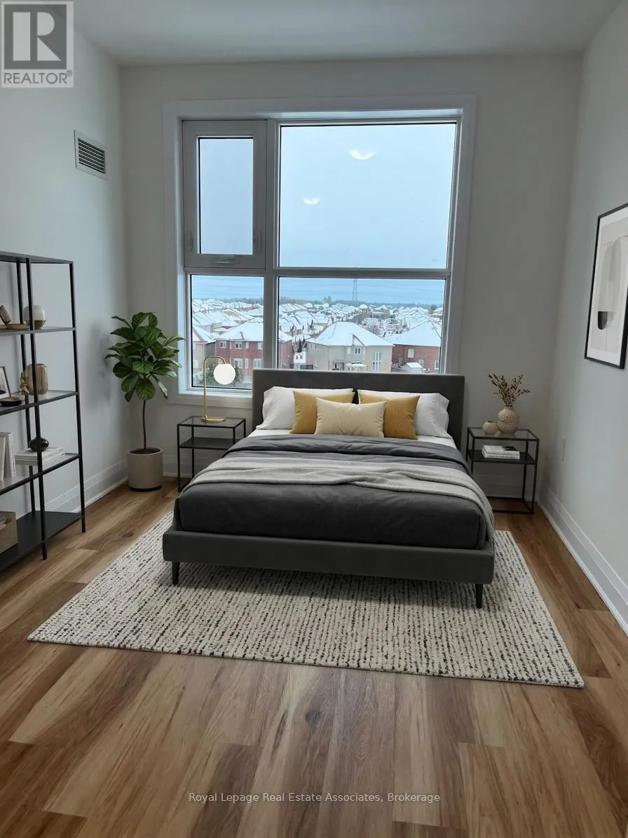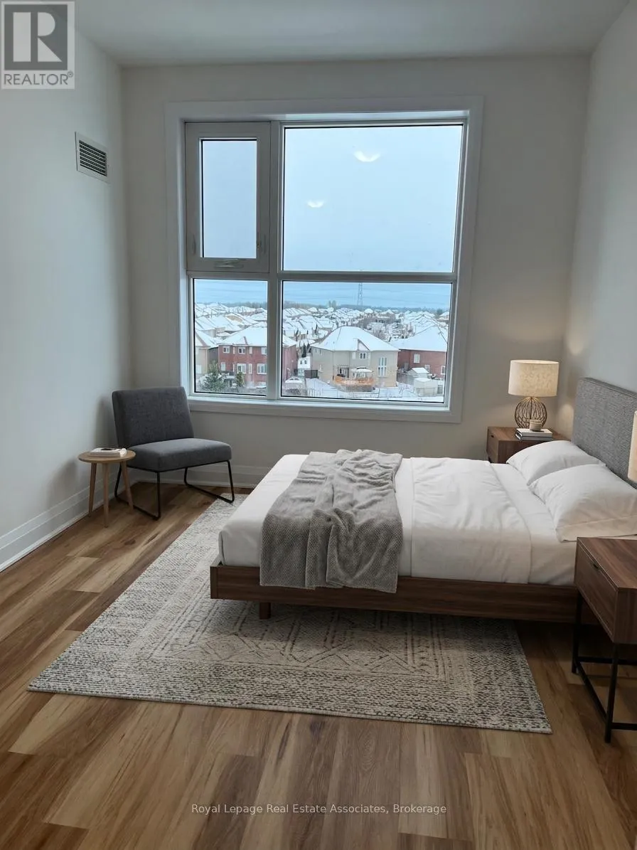 Cross Streets: Highway 20. ** Directions: Fletcher Road and Rymal Road East. Welcome to your luxury top floor condo! This brand-new, top-floor 1-bedroom + den, 1-bath suite offers 641 sq. ft. of modern living space plus a balcony with views of the pond perfect for enjoying your morning coffee or relaxing evenings. Step inside to a bright and airy open-concept layout, featuring a sleek white kitchen with stainless steel appliances, stone coutertops and ample cabinetry for storage, all overlooking the living and dining area. Gorgeous laminate flooring flows throughout, adding warmth and elegance to the space. The primary bedroom boasts a walk-in closet, providing plenty of storage, while the versatile den is ideal for a home office. Enjoy the convenience of in-suite laundry and modern finishes throughout. With one underground parking and a storage locker, this condo also offers exceptional amenities such as a bright well equipped exercise room, sophisticated party room, roof top patio and parcel pick up room. Easy access to shopping, dining, and more. (id:27476)