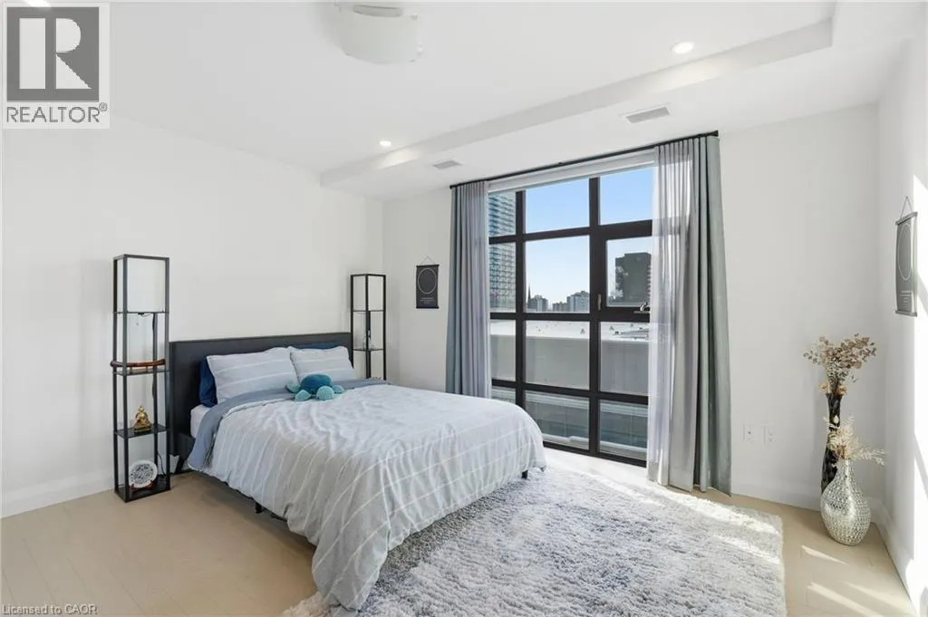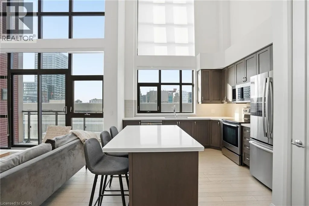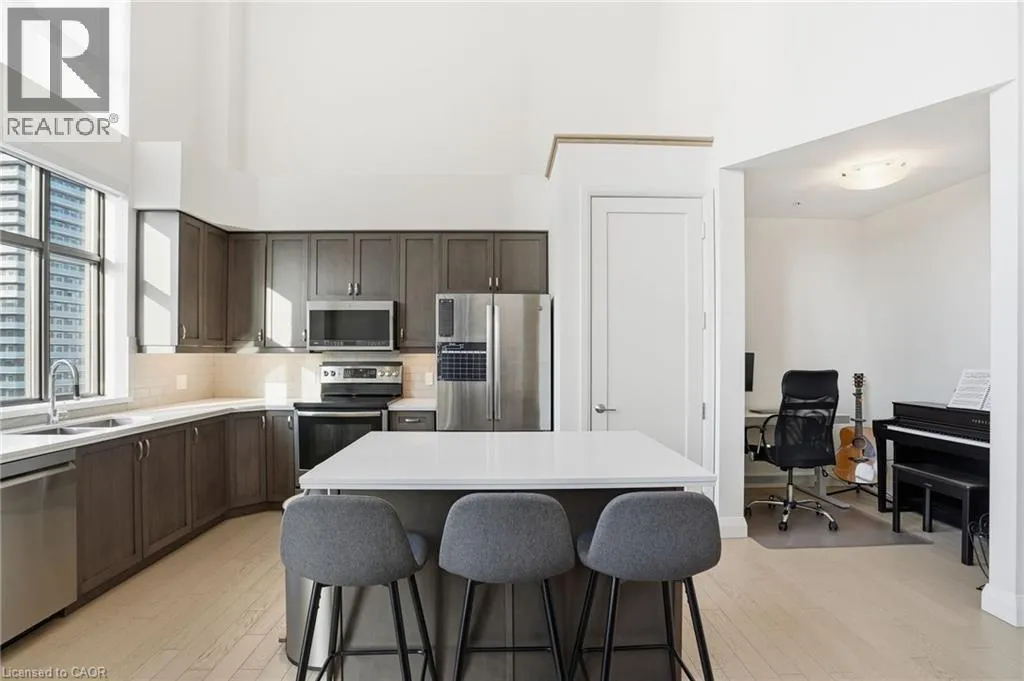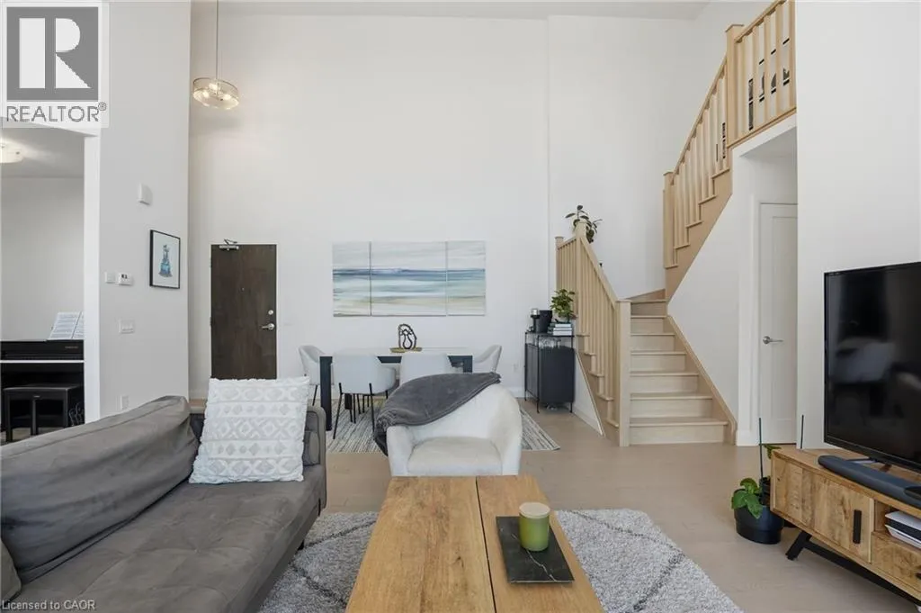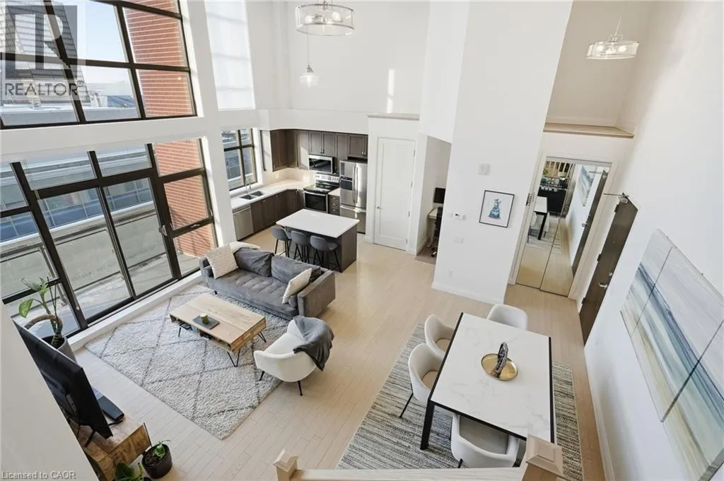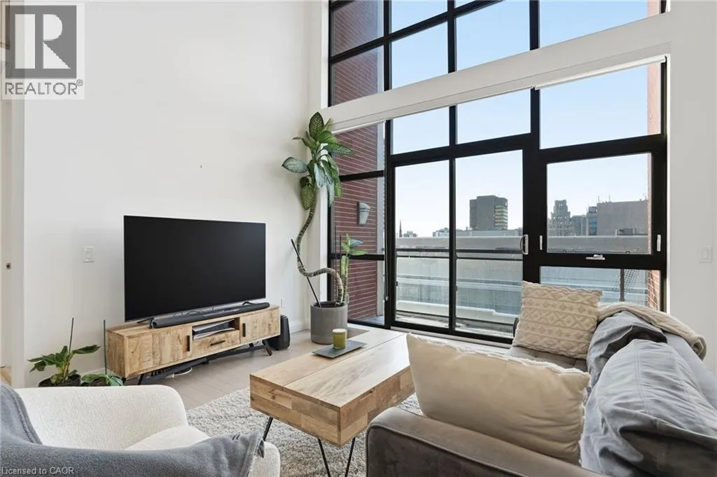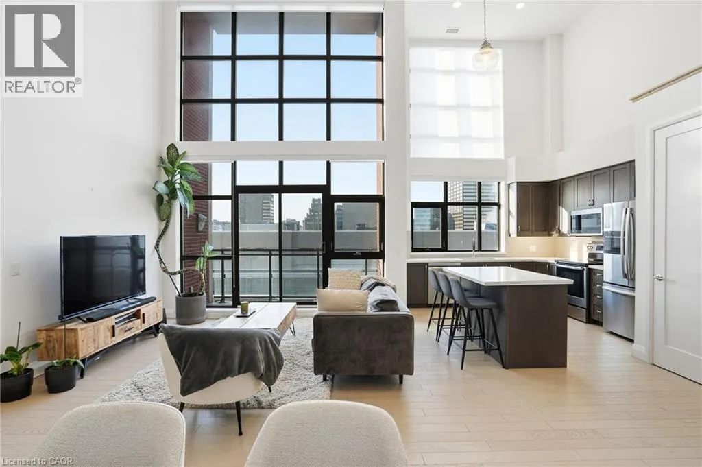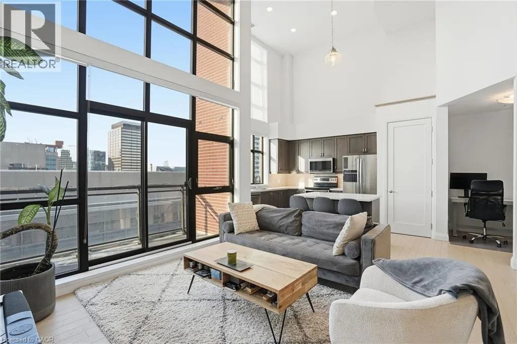 Step into elevated city living in this rare two-storey 2-bedroom, 2-bathroom, plus den lower penthouse at the iconic Residences of RoyalConnaught. This 1,267 sq ft west-facing suite features dramatic 18-foot ceilings, expansive floor-to-ceiling windows, and breathtaking,unobstructed views of the Escarpment, Gore Park, and Hamilton Harbour. The main level offers a bright open-concept living space with a den,laundry, and a spacious primary bedroom complete with walk-in closet and ensuite privileges, delivering true one-floor convenience. Upstairs, thesecond bedroom boasts its own 4-piece ensuite, ideal for guests or family. Thoughtful upgrades include quartz countertops, under-cabinetlighting, engineered hardwood floors, and custom motorized blinds. Enjoy your private balcony, ample storage throughout, and access topremium amenities including a rooftop terrace with fireplace and BBQs, party and media rooms, and a fully equipped gym. Starbucks isconveniently located between the two lobbies, just an elevator ride away. Unbeatable location steps to the GO Station, James Street North, KingWilliam Street, the Art Gallery of Hamilton, the Farmersâ Market, and more. Includes 1 underground parking and a storage locker located rightnext to the unit, with rental of a second parking spot available. Luxe, location, and lifestyle all in one. (id:27476)