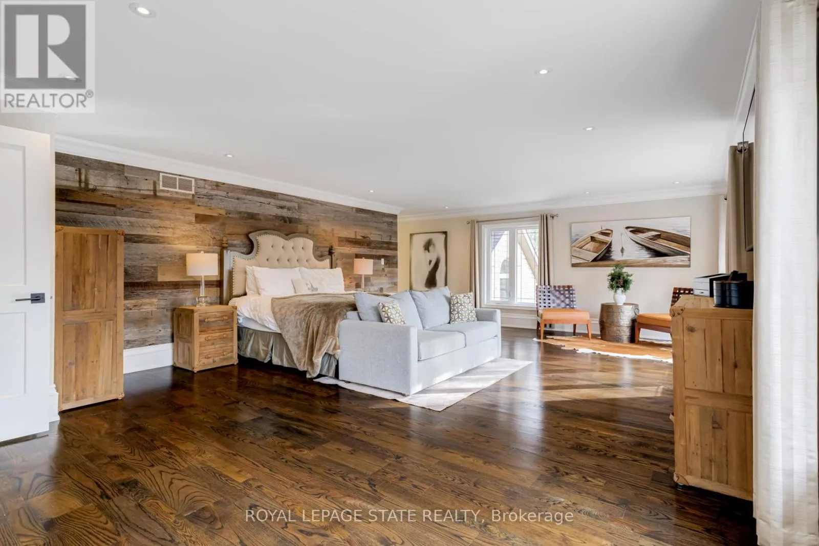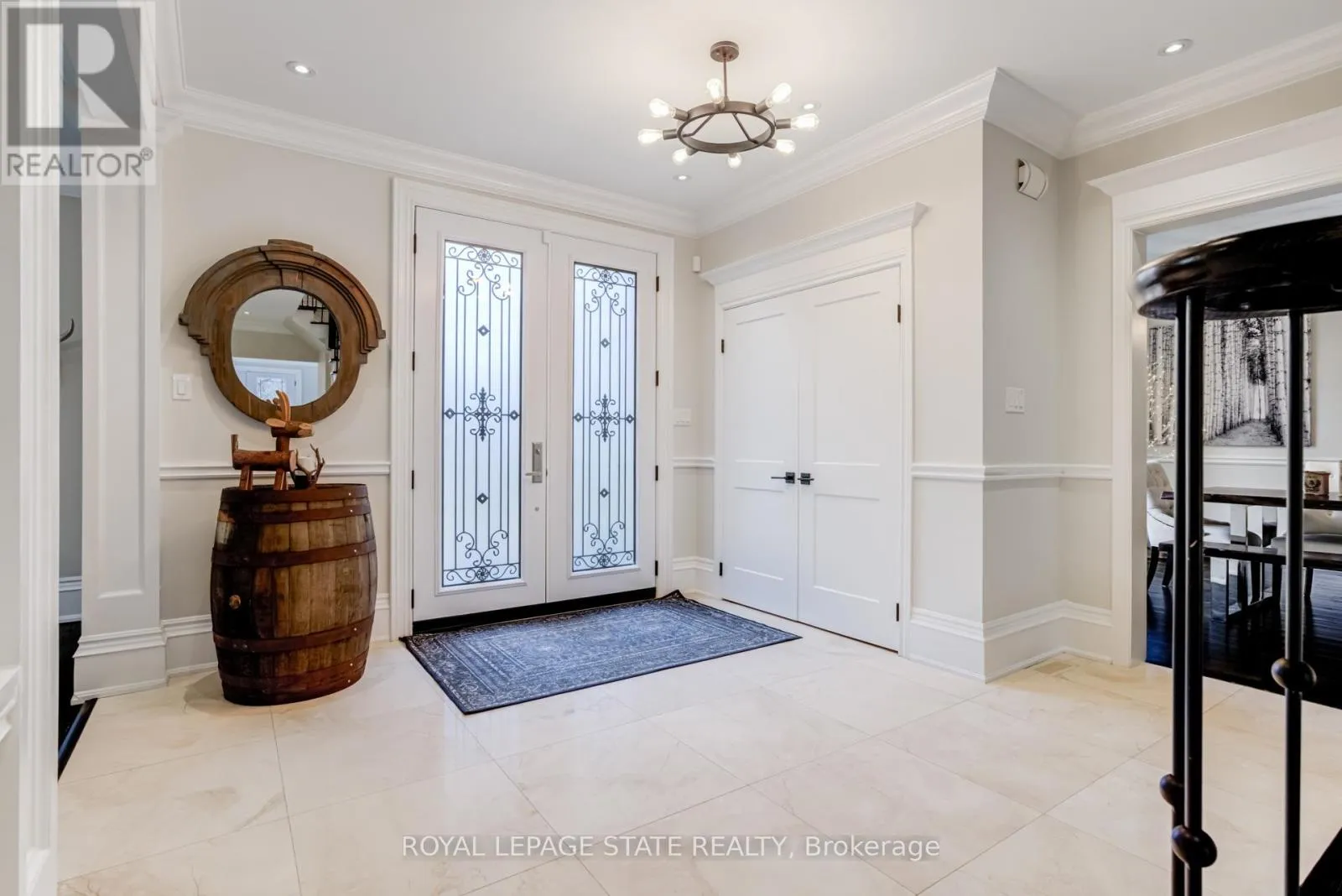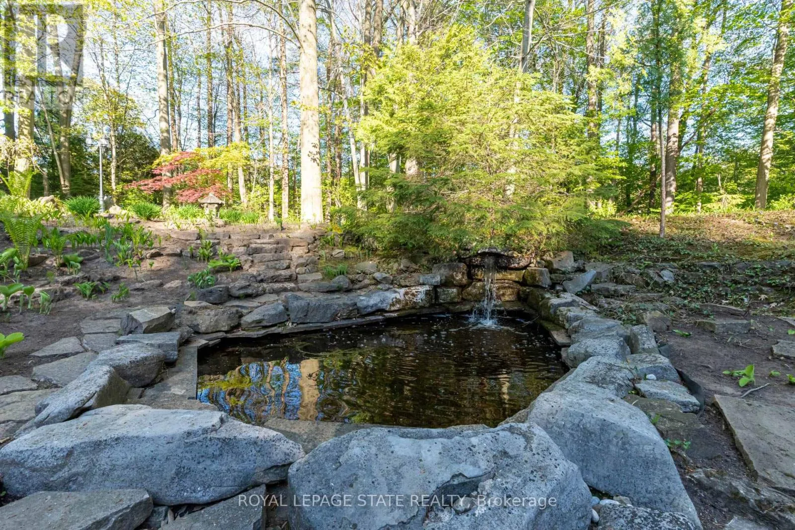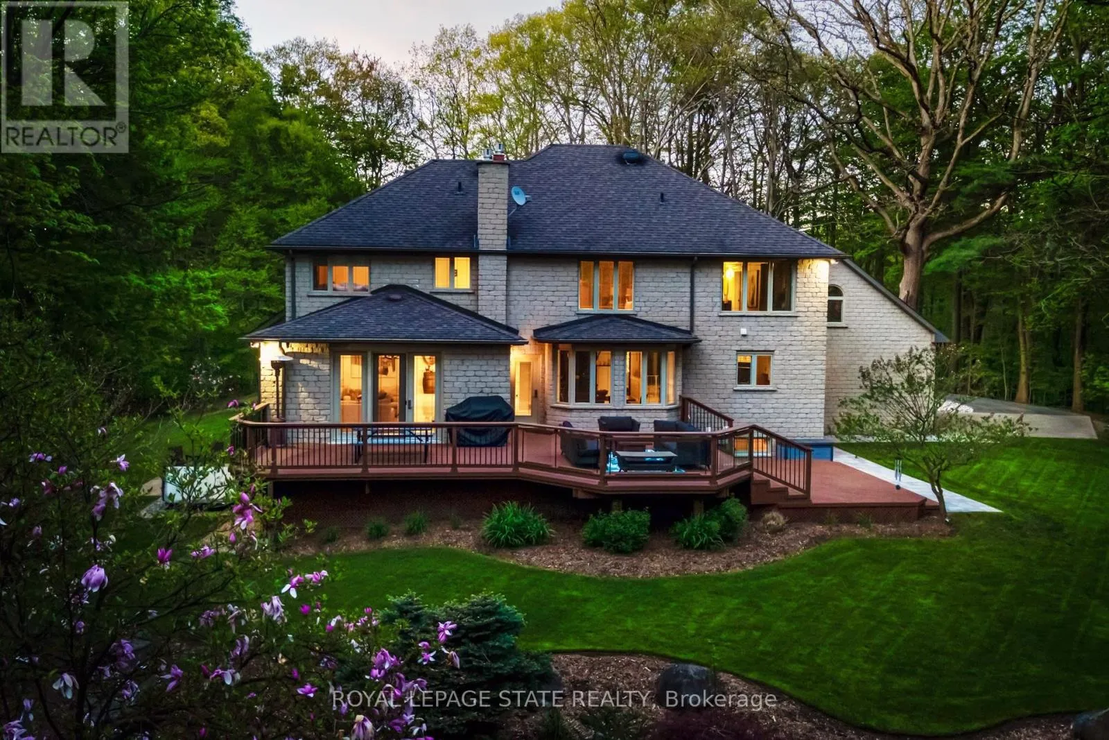 Cross Streets: Shaver Road. ** Directions: Shaver Road to Laurel Court to Elder Crescent. Experience unparalleled luxury in this fully renovated, nearly 7,000 sqft custom-designed executive home on a stunning 2.5-acre property in one of Ancaster's most exclusive enclaves. Surrounded by nature yet minutes from city conveniences, this home blends upscale living with serene privacy-you have to see it to believe it. New stone walkways and lush greenery create exceptional curb appeal. Inside, every detail has been meticulously crafted to maximize space and functionality. Upon entering, you're immediately captivated by the grand 'Scarlett O'Hara' staircase. The main level boasts formal living and dining areas, a private office, and two powder rooms. The spacious custom laundry/mudroom features garage access and a second staircase to the basement. The elegant family room is a true focal point, with a Valor gas fireplace and a stone feature wall. The gourmet eat-in kitchen is equipped with top-of-the-line appliances, custom cabinetry, granite countertops, and stone accents. Rich hardwood, marble tiles, and high-end fixtures flow throughout. Upstairs, the primary suite is a private oasis featuring a spa-inspired 5-piece ensuite with a curbless glass shower and a deep soaker tub, as well as an expansive walk-in dressing room with custom built-ins. Three additional bedrooms and two beautifully updated baths complete the upper level. The newly renovated walkout basement is the ultimate entertainment hub, offering a fifth bedroom, full bathroom, and a stylish kitchenette or wet bar. Relax in the media area with a Valor fireplace or workout in the state-of-the-art gym. Step outside to a private patio with a hot tub-perfect for unwinding in nature. This level also offers excellent in-law suite potential. Outside, serene ponds and breathtaking views create a peaceful, cottage-like atmosphere. A multi-tiered deck extends the home's living space, ideal for dining and entertaining. The expansive yard completes this one-of-a-kind luxury retreat. (id:27476)