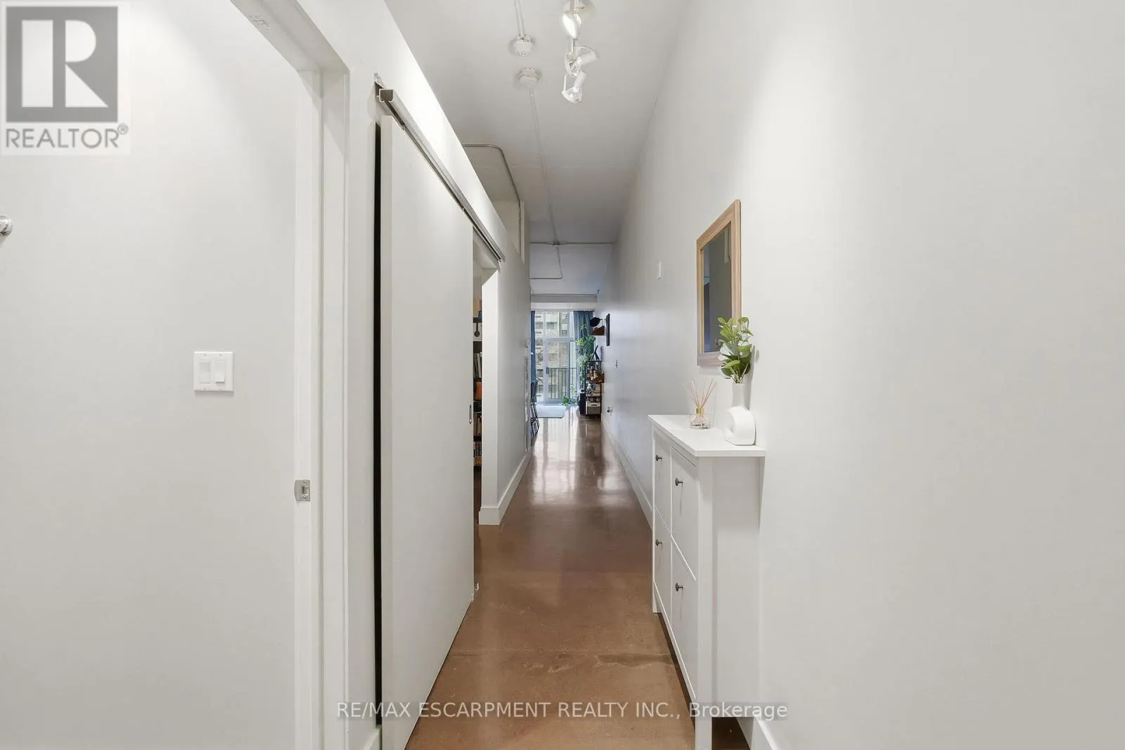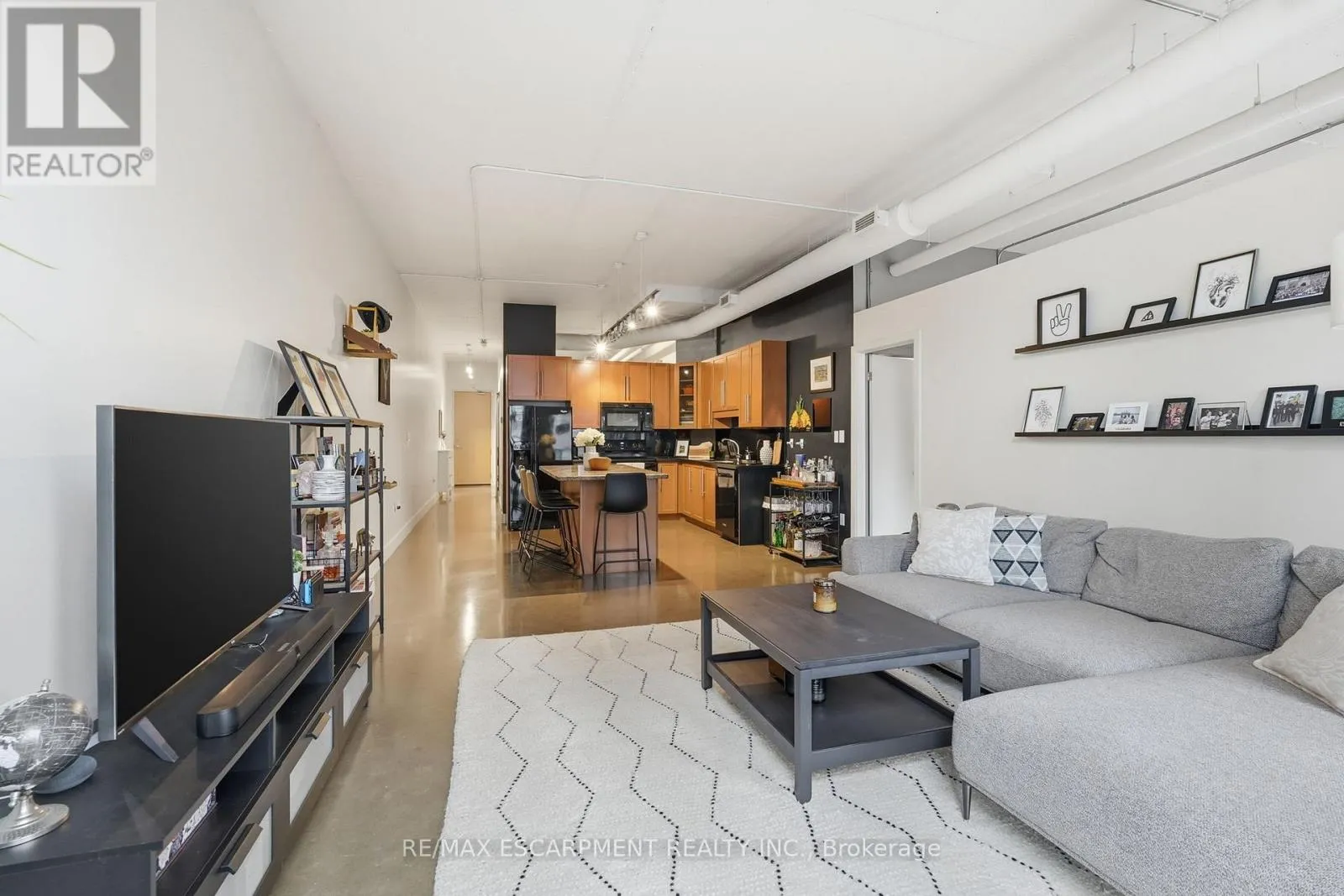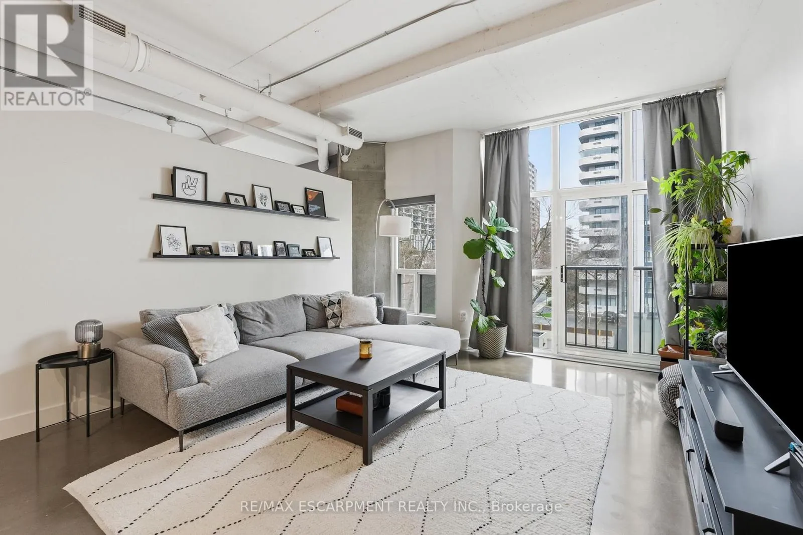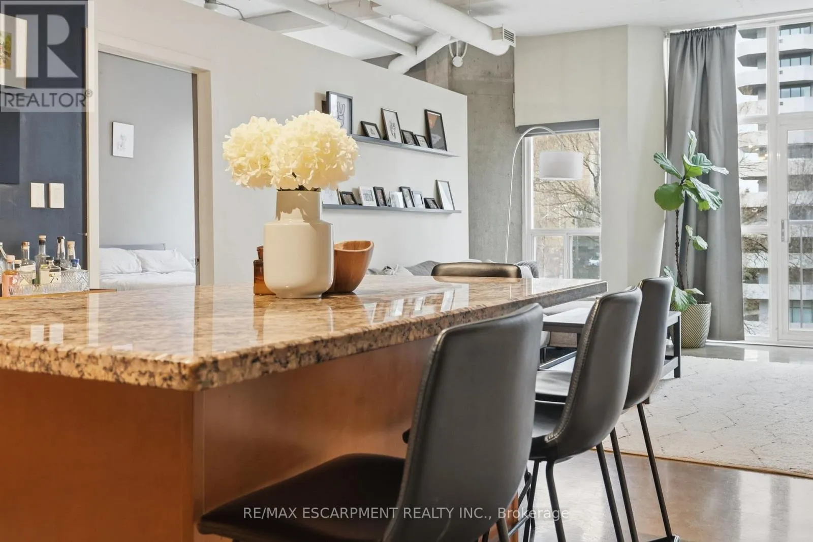 Cross Streets: JACKSON STREET W. ** Directions: JACKSON STREET W TO BAY STREET S. Welcome to Core Lofts, a unique conversion of the historic Bell Canada building in the heart of downtown Hamilton. This spacious Lincoln model offers approximately 1,100 square feet of loft-style living with 10+ ft ceilings, floor-to-ceiling windows and polished concrete floors that give the space its signature feel. Filled with great afternoon light from its west-facing exposure, the unit features a Juliet balcony and an open layout centred around a spacious kitchen with granite counters, newer appliances and an oversized island. Two well-sized bedrooms, updated bathrooms and in-suite laundry complete the space. Condo fees cover nearly everything, and a rented parking space is available for $200/month, with the option to assume. The building offers a rooftop patio with BBQs and city views, along with a gym and party room - all just steps to transit, the GO station, restaurants and everything downtown has to offer. RSA. (id:27476)