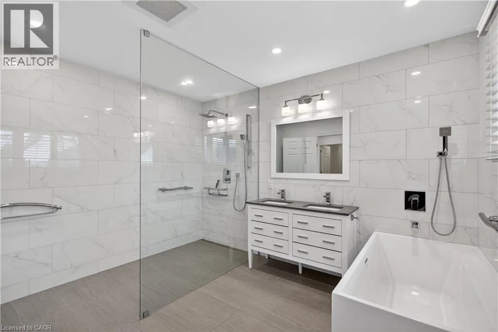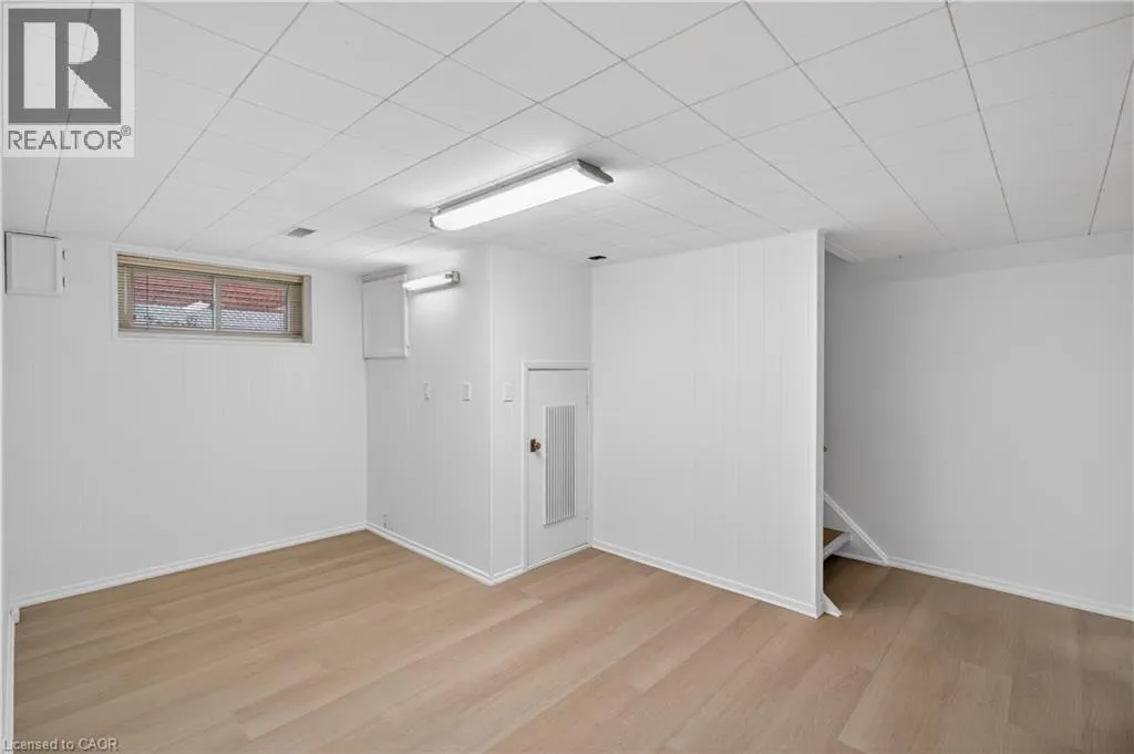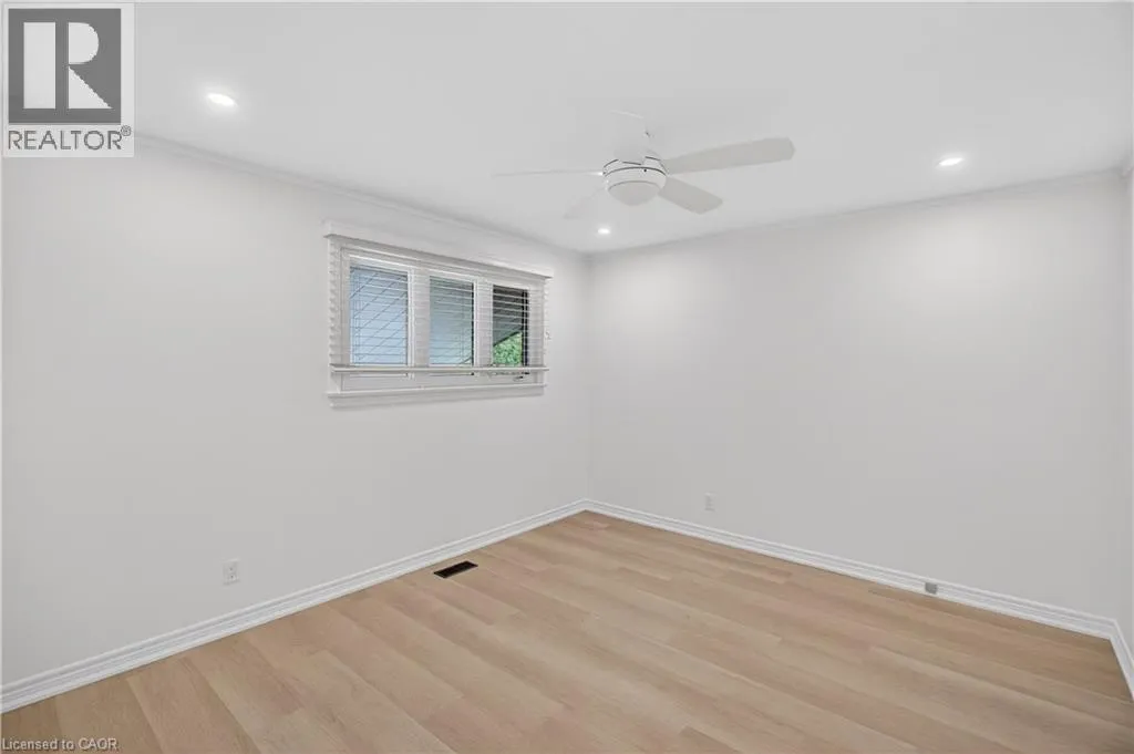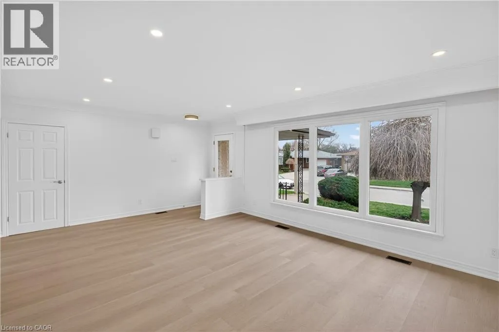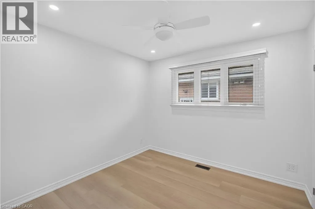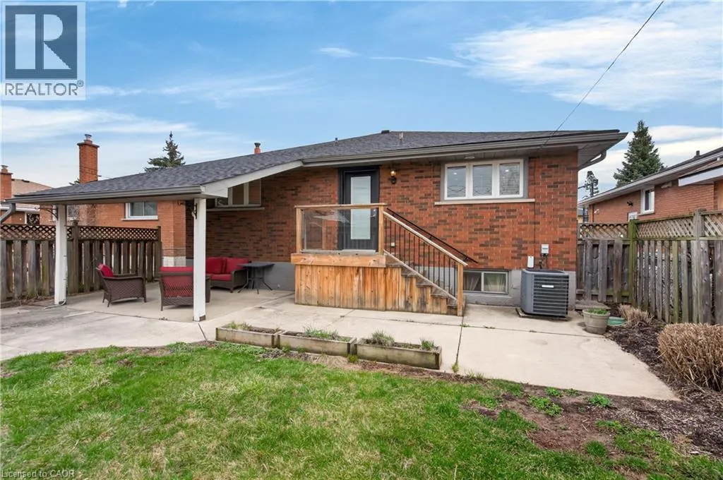 From Kenilworth S/Monterey, W on Monterey, S on Tuxedo S Nestled on a quiet cul-de-sac in the heart of Hamiltonâs sought-after Delta neighbourhood, this tastefully updated 2 bedroom, 2 bathroom bungalow offers comfort, convenience, and exceptional versatility. Featuring surfaced parking for 4 vehicles and a single garage with inside entry, this home delivers both function and ease from the moment you arrive. A covered front porch welcomes you into a spacious foyer complete with a convenient storage closet. The inviting living room is filled with natural light from an expansive front window and enhanced with pot lighting, creating a warm and airy atmosphere. The eat-in kitchen offers a charming dinette space, stainless steel appliances, and a skylight that floods the area with natural light. Two generously sized bedrooms feature oversized closets, while the recently renovated 5-piece bathroom is a standout - thoughtfully designed to be wheelchair accessible, complete with a glass shower, double vanity, and an oversized soaker tub. Main level laundry adds everyday convenience. The partially finished lower level expands your living space with a large recreation room, cold room, powder room, utility area, and a second laundry setup. A bonus side entrance provides direct access to both levels, offering excellent in-law or multi-generational living potential. Step outside to a private backyard retreat featuring a large concrete patio with veranda, a rear storage shed, gardens, and green space to enjoy. Additional updates include roof shingles (2021), recently installed flooring, upgraded lighting fixtures, fresh paint throughout & more. Located in the vibrant Delta community, enjoy close proximity to Gage Park, Ottawa Streetâs shops and restaurants, schools, transit, and quick highway access. A rare opportunity to own a turnkey bungalow in one of Hamiltonâs most established neighbourhoods. (id:27476)