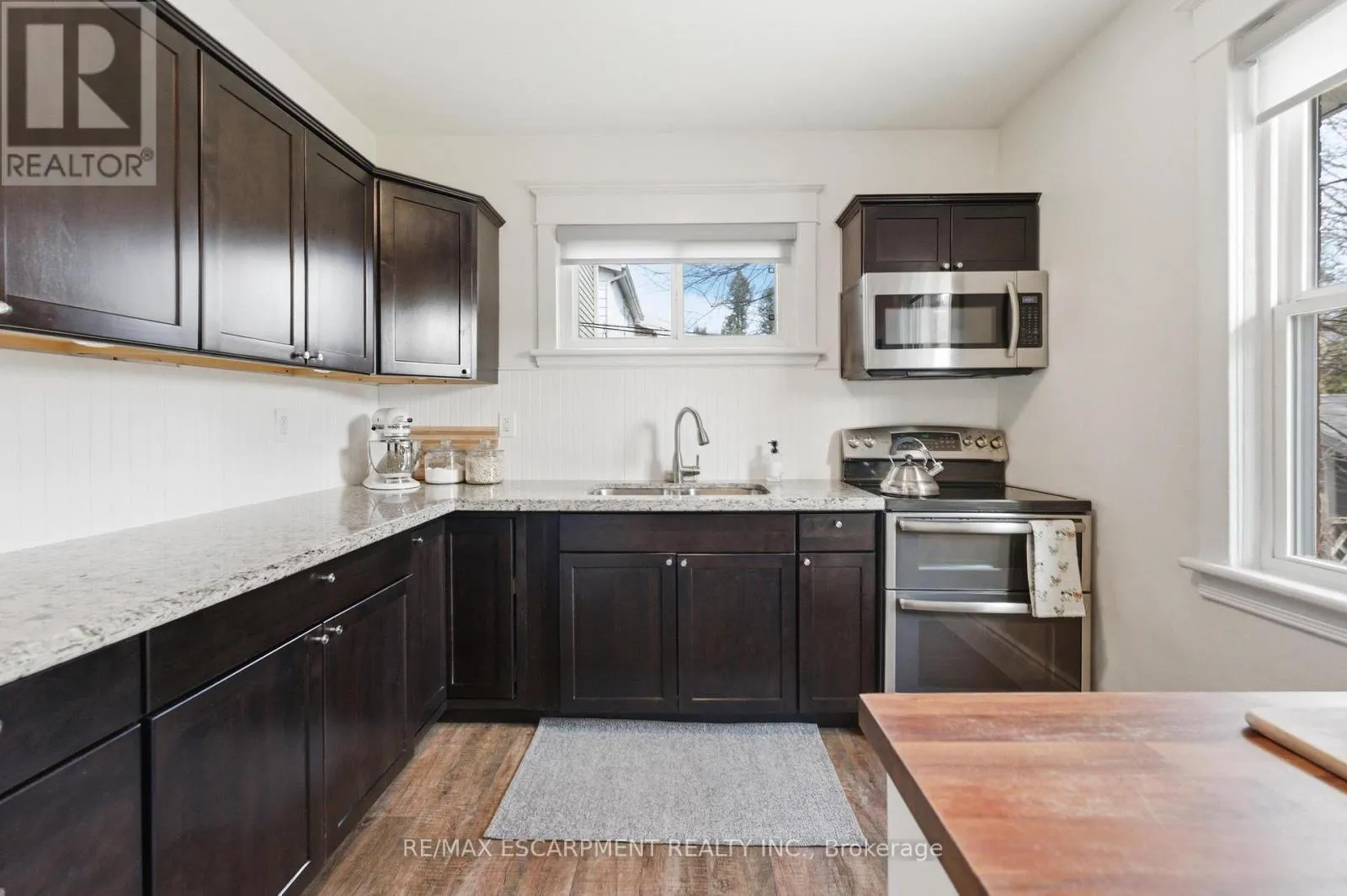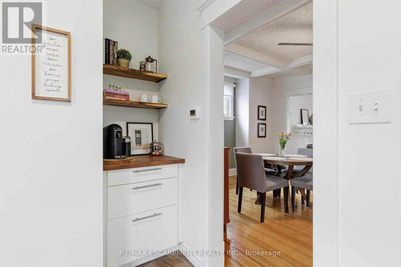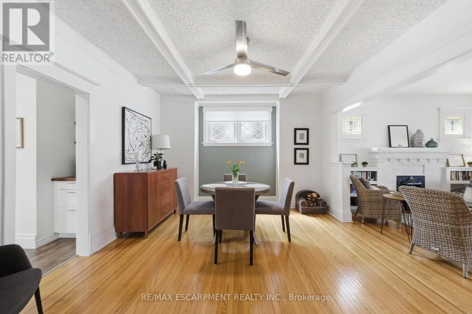 Cross Streets: Lawrence Road. ** Directions: Lawrence Rd to Kensington Ave S. Step into this beautifully updated character home, blending timeless charm with modern finishes, just steps to Gage Park and the shops, cafes, and restaurants of Ottawa Street. Enjoy escarpment views from your front porch. Original details include inlaid hardwood floors, mouldings, stained glass, and a decorative fireplace, complemented by a coffered dining room and cozy den with built-ins. The eat-in kitchen with a custom coffee bar overlooks a low-maintenance yard with perennial gardens and interlocking patio. Upstairs offers 3 bedrooms and a renovated 4-piece bath. Separate side entrance to a fully finished basement suite with kitchen, laundry, living space, and 4-piece bath (id:27476)