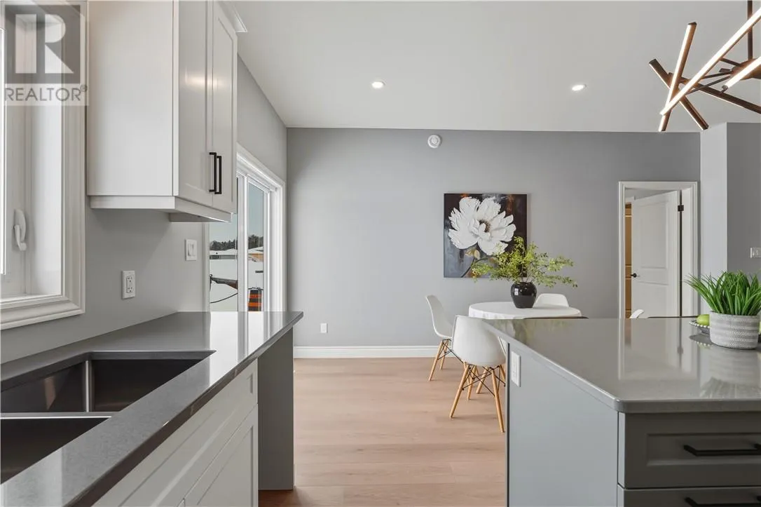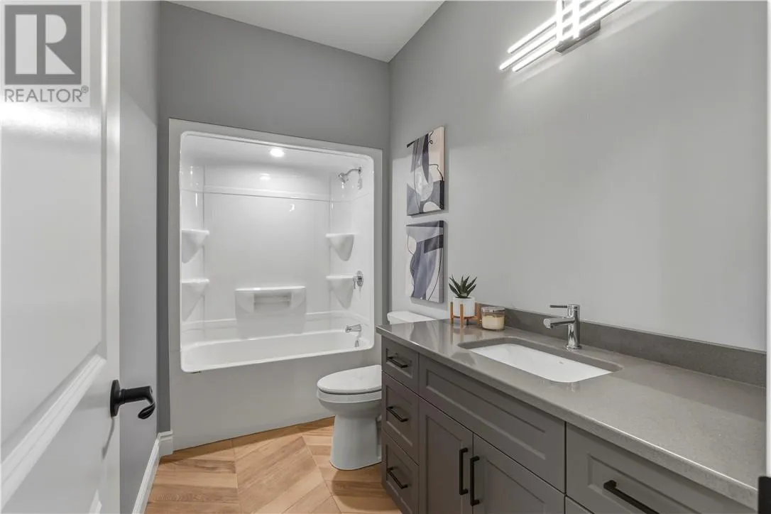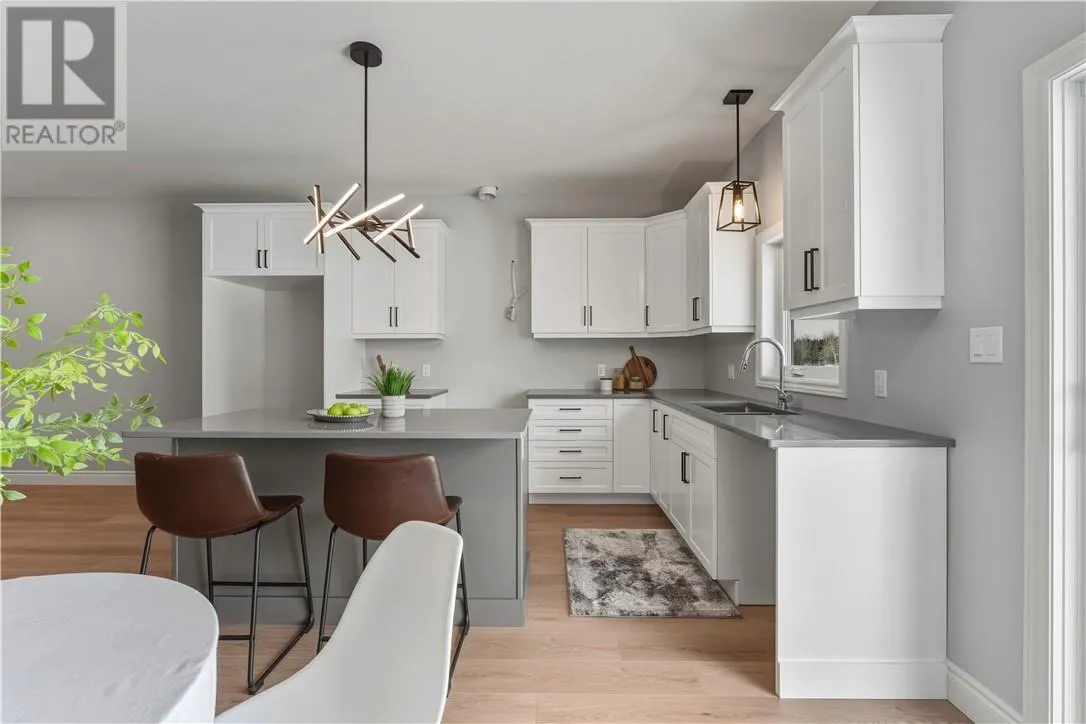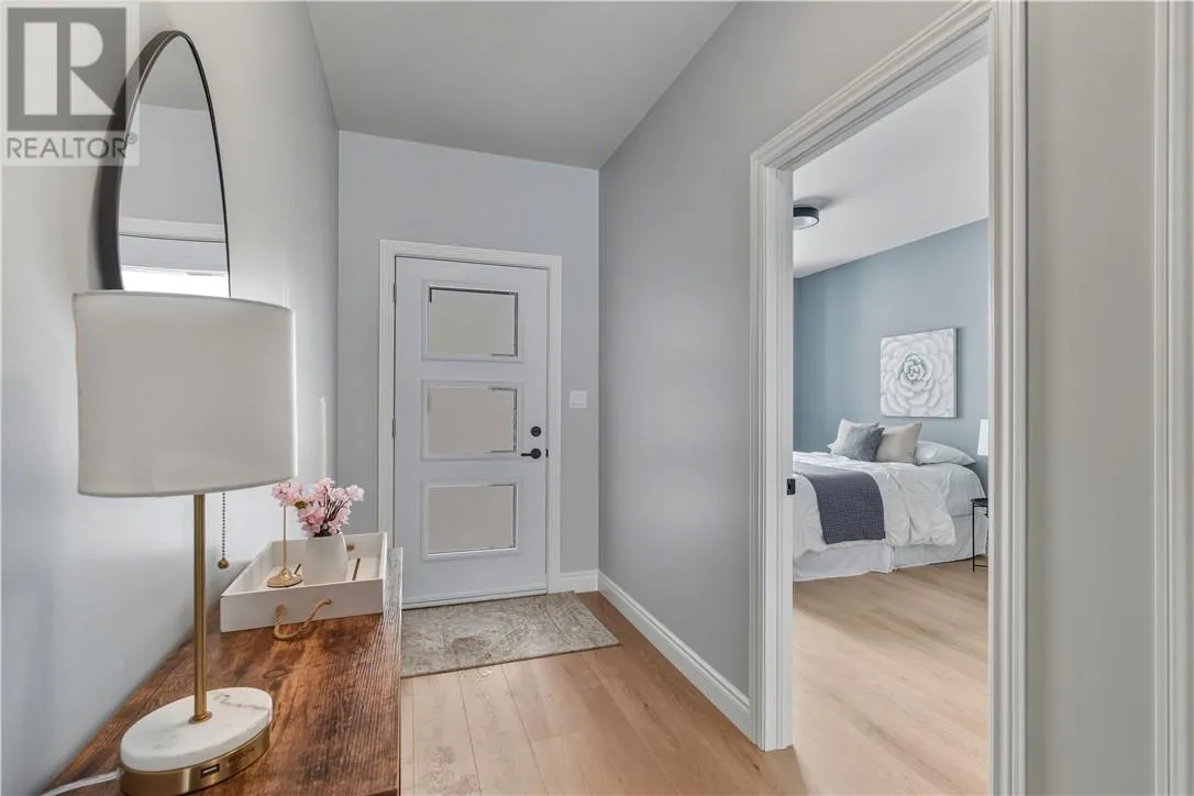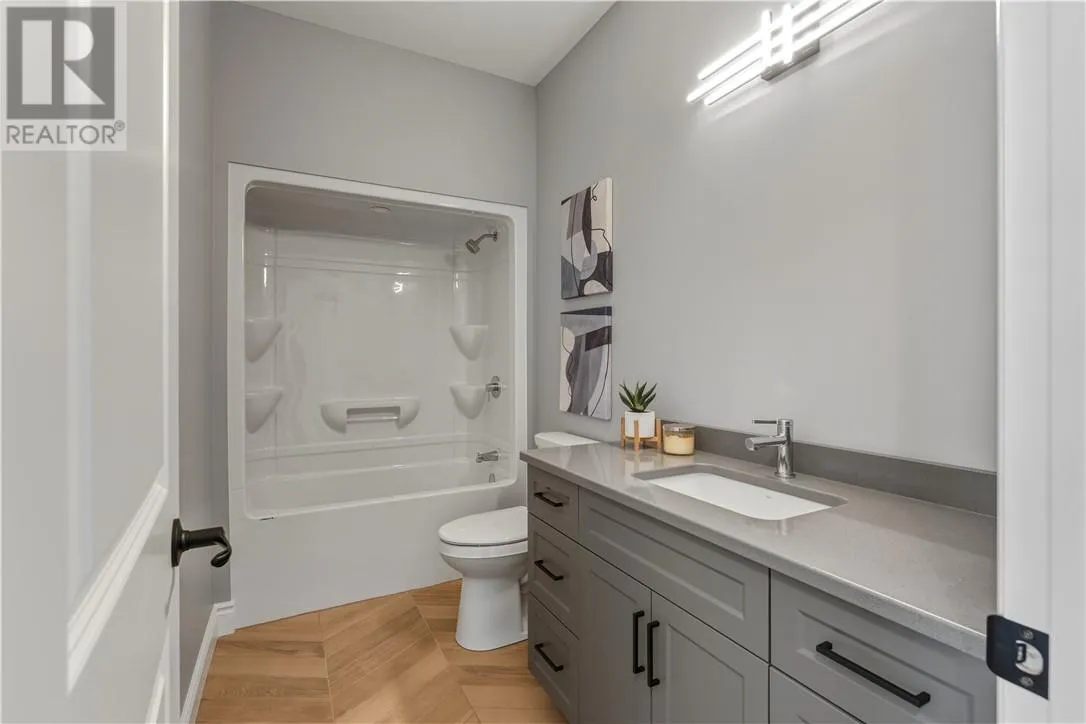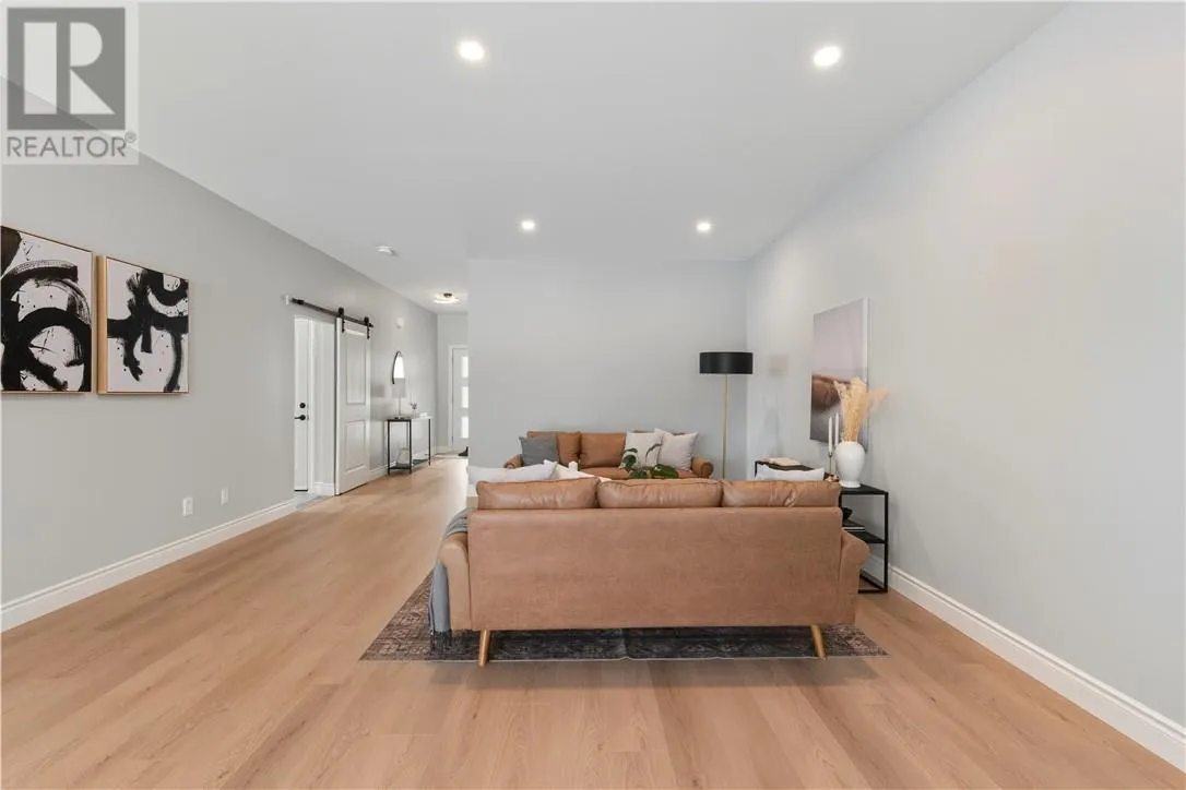 Introducing a newly constructed home by Belmar Builders in the sought-after New Dominion Park community. This beautifully crafted grade-entry residence offers more than 1,300 square feet of finished living space on the main floor, designed with an open layout, 9-foot ceilings, and a bright, contemporary feel. At the center of the home is a stylish kitchen featuring classic white shaker cabinets, quartz countertops, and durable finishes that are perfect for both daily living and hosting guests. The main level offers two generously sized bedrooms, including a spacious primary retreat with a walk-in closet and private full ensuite. Both bathrooms are upgraded with quartz surfaces, and the entire home is carpet-free, showcasing quality laminate and ceramic tile flooring throughout. Additional highlights include convenient main-floor laundry, ample storage space, and a 12â x 25â attached insulated garage. Constructed on a solid poured concrete foundation, the home is equipped with high-efficiency natural gas forced-air heating and central air conditioning for year-round comfort. It also comes backed by a 7-year Tarion New Home Warranty, providing added security and confidence. An excellent chance to own a brand-new home in a thriving, up-and-coming neighbourhood. (id:27476)