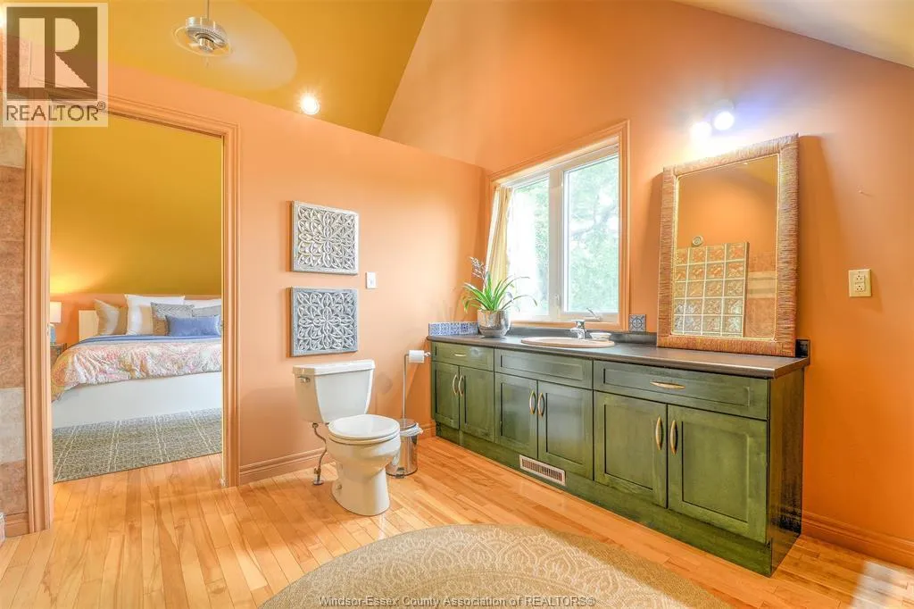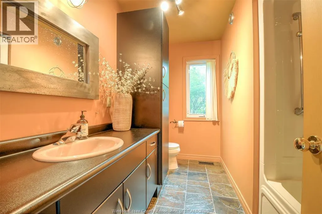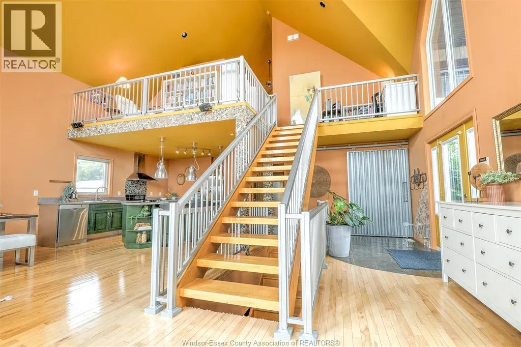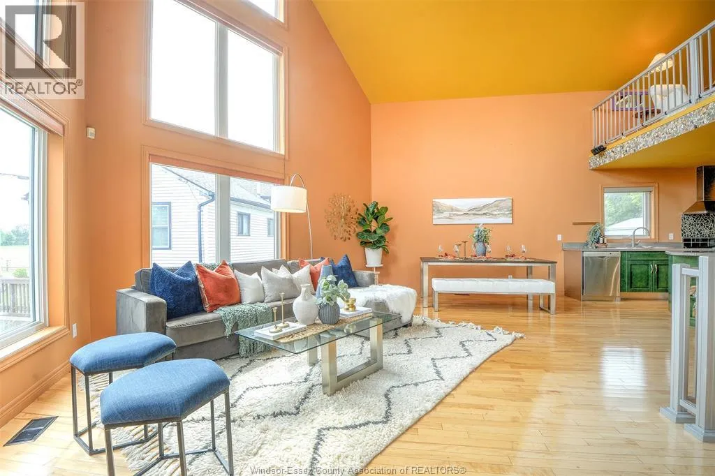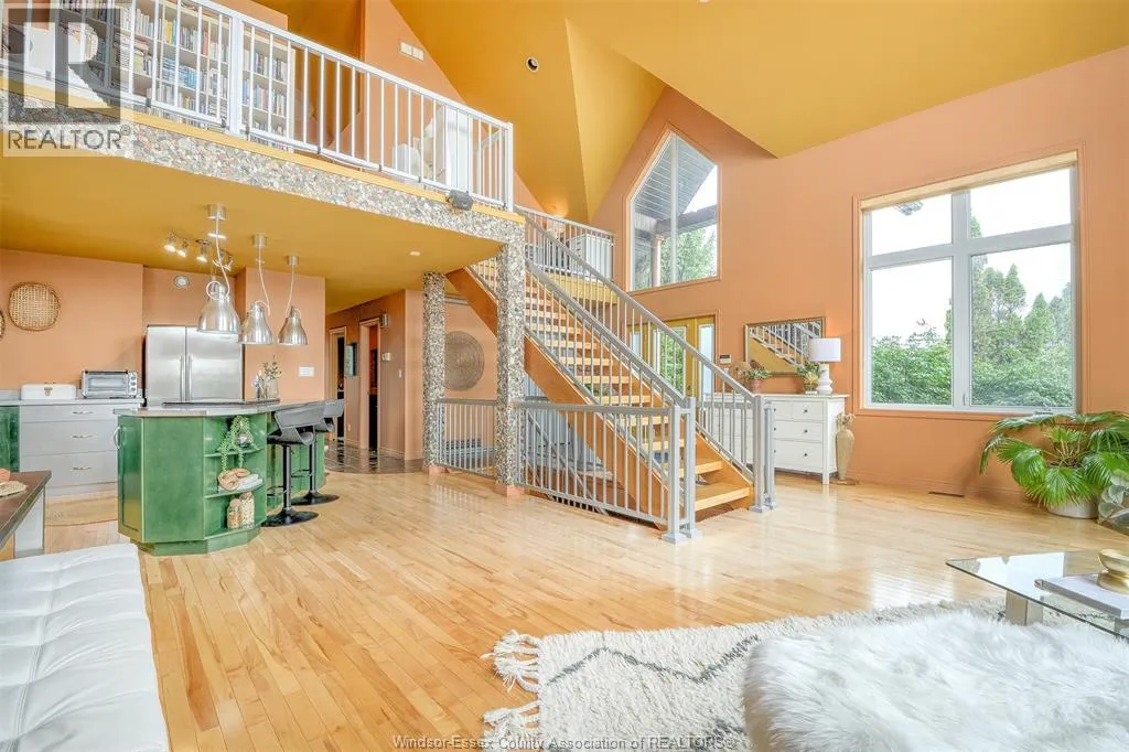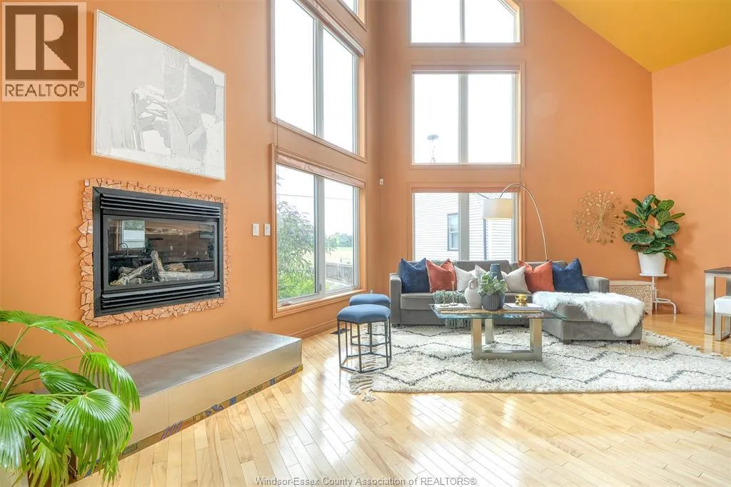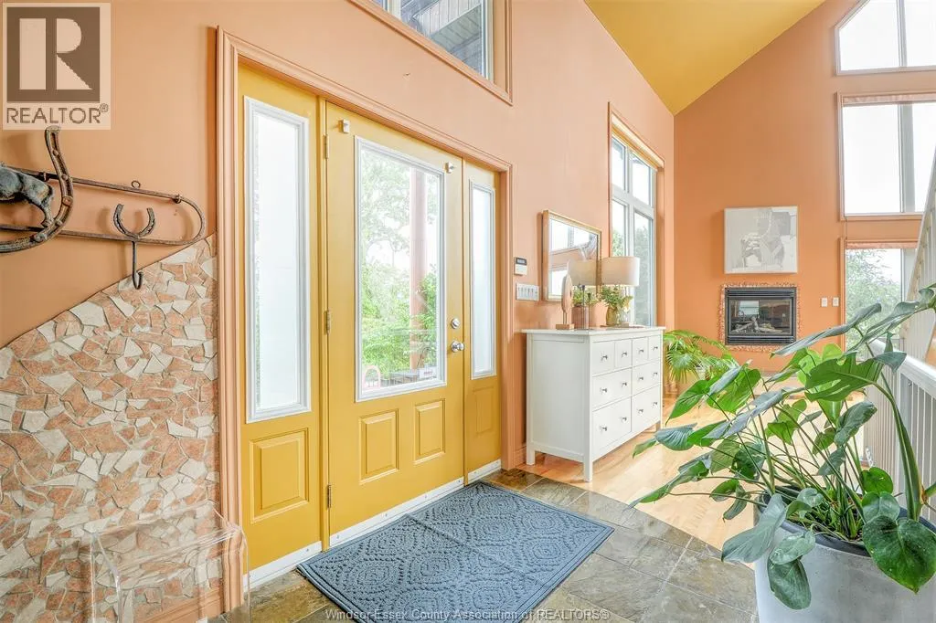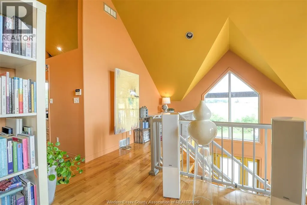 This impressive custom-built A-frame beauty is nestled in the charming town of Colchester, near Lake Erie beach and beautiful local vineyards. It features 2+1 bedrooms, 2 full bathrooms and a finished lower level with/ heated floors. As you enter, you will be greeted by soaring ceilings, an open-concept living room with a gas fireplace, a dining area, and a kitchen featuring stainless steel accents. Plenty of natural sunlight throughout. Main floor includes a bedroom that is currently used as an office and a 4-piece bathroom. A stunning open Tiger oak staircase leads to the upper floor, where you can relax in the den that overlooks the lower level. Elevate your senses with endless indoor and outdoor views from the floor-to-ceiling windows. The spacious primary bedroom features an en-suite with a walk-in shower. Lower level has heated floors, a 3rd bedroom, a family room, garage access, and a grade entrance that leads to a fenced backyard complete with a deck and a hot tub. Connected to Municipal sanitary sewer for your convenience. Come check it out! (id:27476)