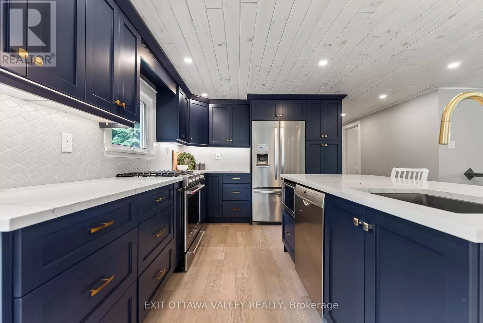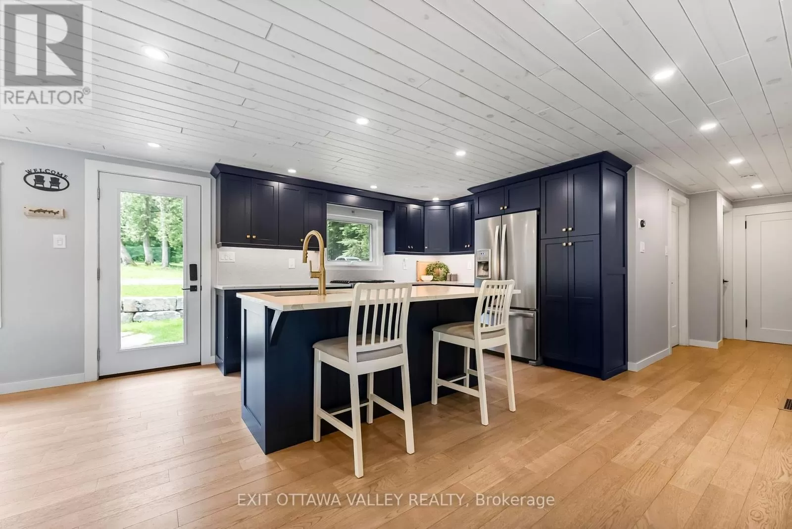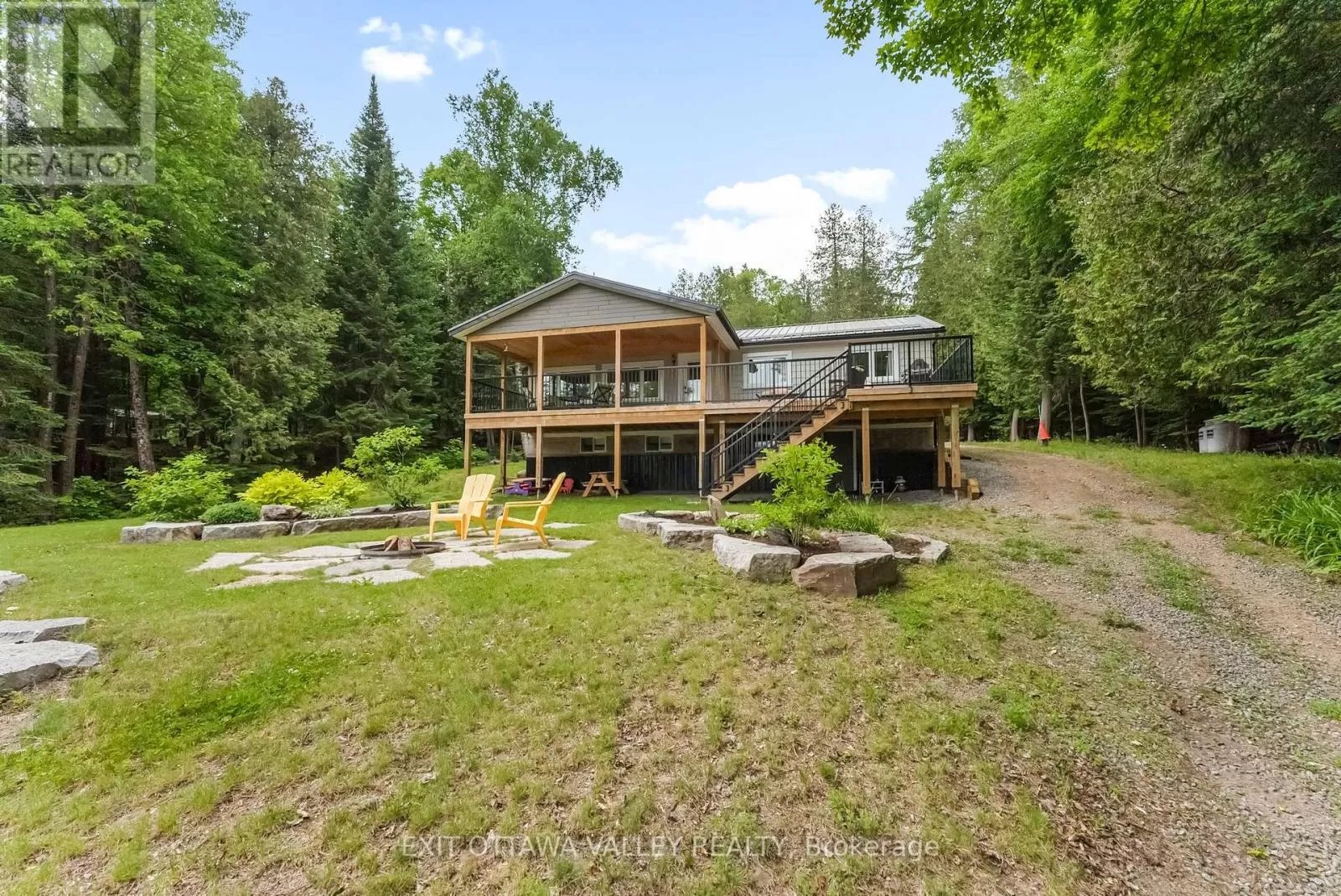 From Siberia rd take Kamaniskeg Lake rd. From Hwy 62 take Kamaniskeg Lake rd Welcome to your dream escape! 1478 Kamaniskeg Lake Rd is a beautifully renovated waterfront home that blends modern finishes with relaxed beach house charm! Nestled along the tranquil Madawaska River and just a short boat ride to the popular Kamaniskeg Lake, this property offers endless opportunities for boating, fishing, swimming, and exploring sandy beaches. Inside, you'll find a bright and airy open-concept main floor with engineered hardwood throughout. The space is perfect for entertaining or unwinding after a day on the water. The newly updated kitchen is finished with elegant stone countertops and equipped with stainless steel appliances, including a propane gas stove. The living area features walkout access to an elevated deck with a high-pitched roof, offering both sun and shade for relaxing or dining outdoors with a view. This home features three comfortable bedrooms and one stylish bathroom with a sleek glass stand-up shower. Step down from the deck into a beautifully landscaped yard, a cozy fire pit, and plenty of space for gathering under the stars. The finished basement adds even more living space, complete with a wood-burning stove, making it ideal for a rec room, guest space, or a quiet retreat during cooler evenings. For all your toys and gear, the double-car garage provides ample storage for motorized and off-road vehicles. Whether you're looking for a year-round residence or the perfect seasonal getaway, you don't want to miss out on this waterfront gem! (id:27476)