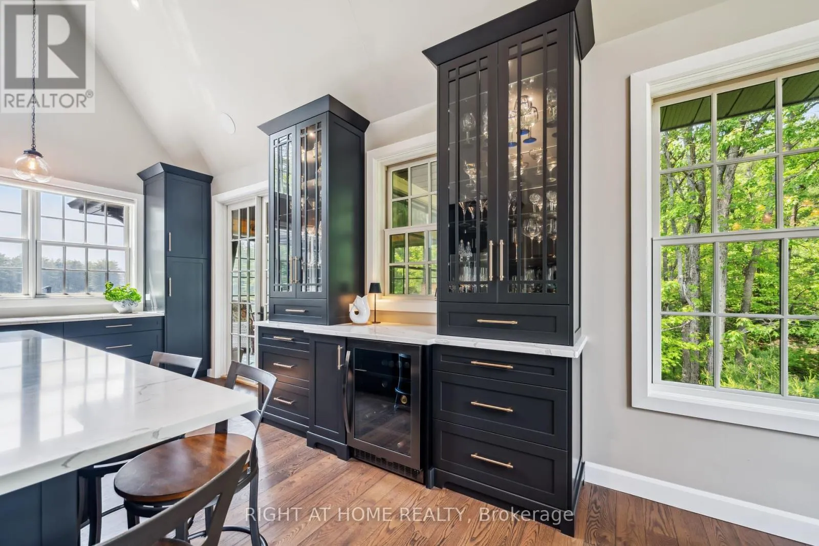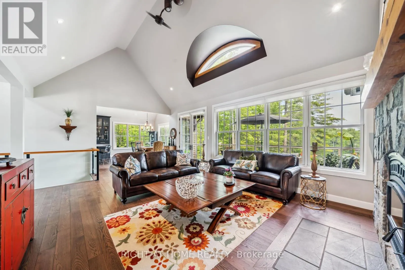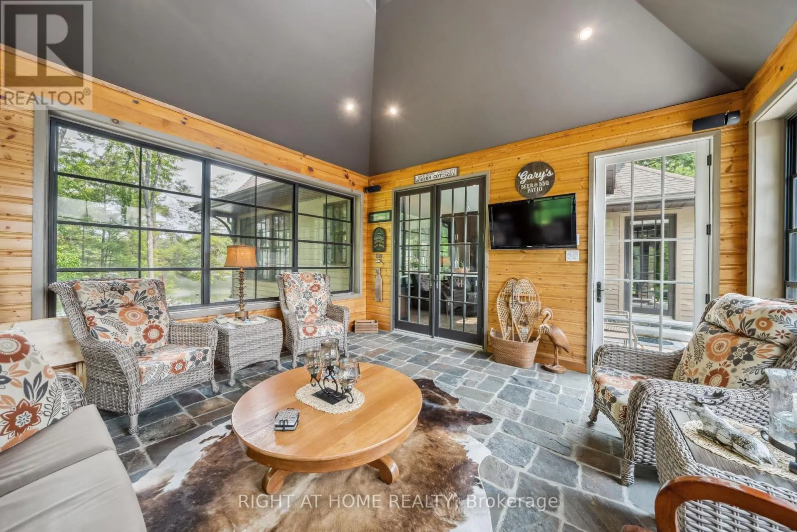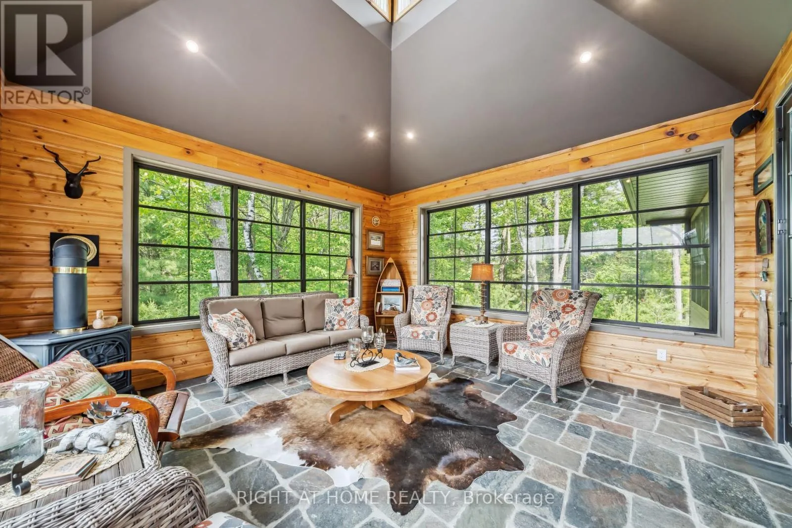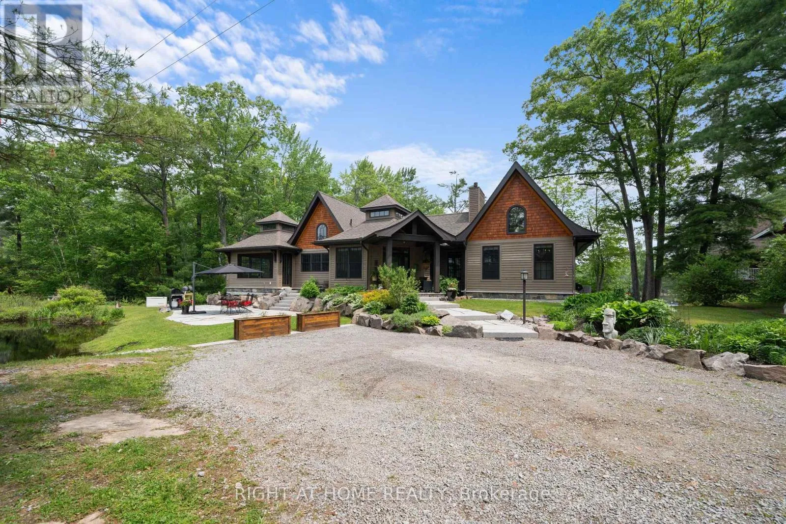 Cross Streets: County Road 6 & West Kosh. ** Directions: County Rd 6 to West Kosh, West Kosh to Blue Mountain, Blue Mountain to Fire Route 93. Turn right on 93 from Blue Mountain follow 93 through the gate (Hard to see metal gate) continue to fork, stay right to 93A, follow to the 1st laneway on left #302. Welcome to a truly rare gem 21.25 acres of unspoiled natural beauty, nestled on the shimmering shores of Kasshabog Lake. This custom-built 2014 cottage was thoughtfully designed to blend into the surrounding landscape, offering a peaceful retreat for those who seek quiet mornings, forest trails, and the timeless magic of waterfront living.Whether you are casting a line for Bass, Pickerel, or Muskie, or simply soaking in the breathtaking lake views from nearly every room, this property is a haven for outdoor enthusiasts and cottage lovers alike. Wander along the private trails through the woods, discover two serene ponds rich with wildlife, and listen to the gentle flow of a seasonal creek from the comfort of your sunroom.Enjoy sunset dinners on the pondside patio as turtles bask nearby and loons call in the distance. In fall, curl up beside the cozy gas woodstove as migrating birds pass overhead. The lakeside stone patio invites you to swim, paddle, or simply sit still and take it all in Inside, the heart of the home is a bright, modern kitchen made for gathering whether its weekend breakfasts or lakeside feasts. Two lower-level bedrooms provide private space for guests or family, while the main-floor and primary suite offers comfort and seclusion with 238 feet of private waterfront, a 768 sq. ft. garage with woodstove, perennial gardens, forest trails, and proximity to Crown Land, snowmobile and ATV trails, this property offers the best of both worlds: a vibrant cottage lifestyle and the soothing presence of untouched nature. If you dream of a place where the water sparkles, the pines whisper, and every season brings new beauty this is it. Note - an extra 1000 feet approximately of additional waterfront on the pond side of property. Additional features - Bell Roof & Bell room design on the house, Eye Brown Windows in living room & cupla windows in the entrance way and sunroom just look up to see the beauty (id:27476)