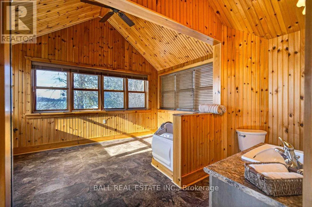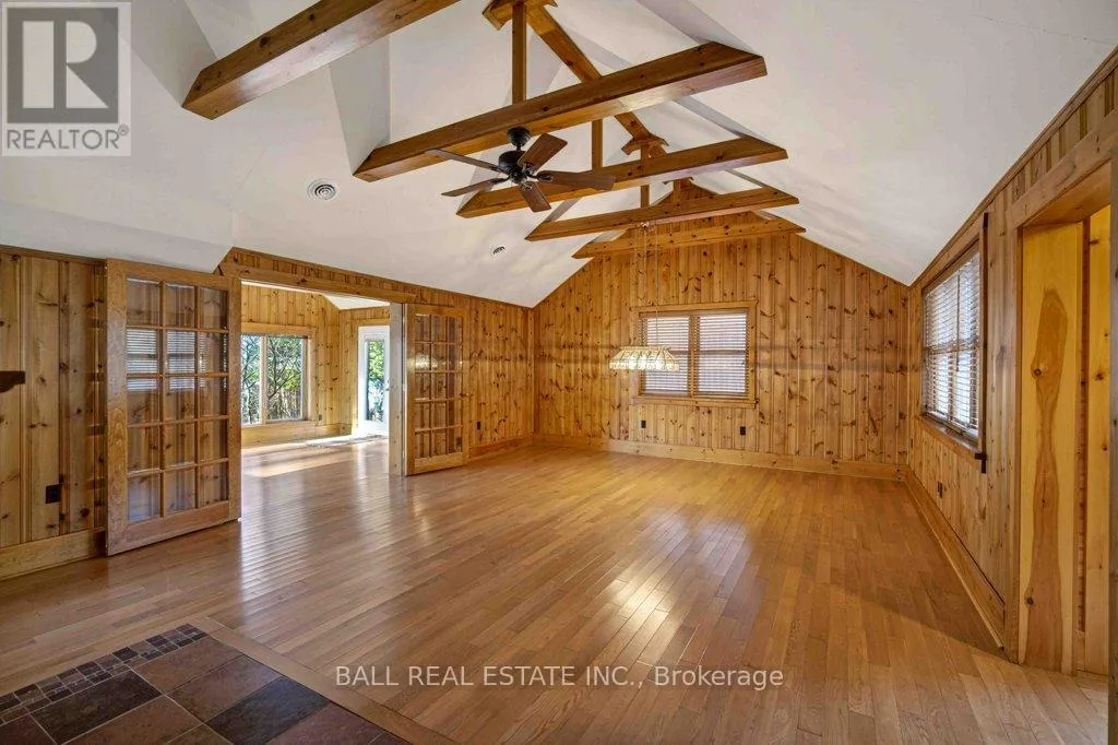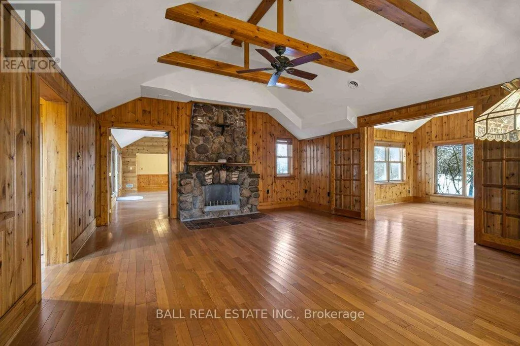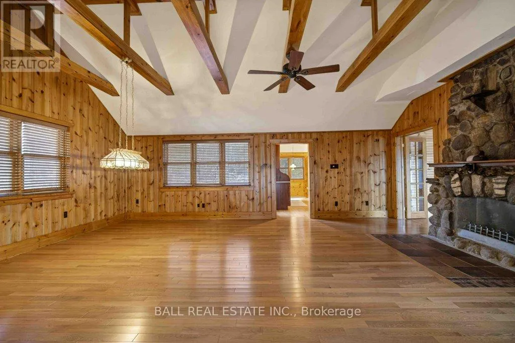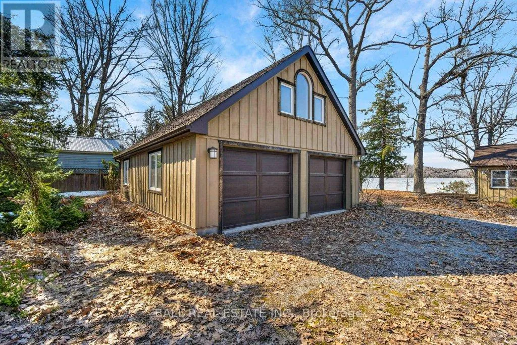 Cross Streets: Mile of Memories and Fire Route 33. ** Directions: https://maps.app.goo.gl/RFCuAgur1NLP1Lc99. | The Ultimate Waterfront Retreat on Belmont Lake | Experience the rare harmony of luxury and lakefront living with this stunning Belmont Lake estate. Boasting a staggering 170+ feet of north-westerly frontage, this property offers front-row seats to the region's most breathtaking sunsets. Whether you're wading into the crystalline waters via custom stone stairs or cruising by boat to the local sandbar and the iconic Belmont Lake Brewery, the lifestyle here is unparalleled. Designed with meticulous craftsmanship, this 2,000+ sq. ft. bungalow features an expansive, all-one-level layout. The interior strikes a sophisticated balance between rustic charm and modern elegance, showcasing vaulted beamed ceilings, rich hardwood floors, and a grand stone fireplace that anchors the living space. The intelligent floor plan separates the primary living areas from a dedicated bedroom wing for ultimate privacy. Currently configured as a spacious two-bedroom, two-bathroom home, the flexible den offers an easy transition into a third bedroom if desired. Outside, the level lot leads to a detached double garage featuring a finished studio loft, perfect for a creative workspace or a guest bunkie. Located just 10 minutes from town amenities and 45 minutes from Peterborough, this home offers the peace of the cottage with the convenience of a primary residence. Complete with forced-air propane heat, central air, and a drilled well, this is quality you can feel in a setting you'll never want to leave. (id:27476)