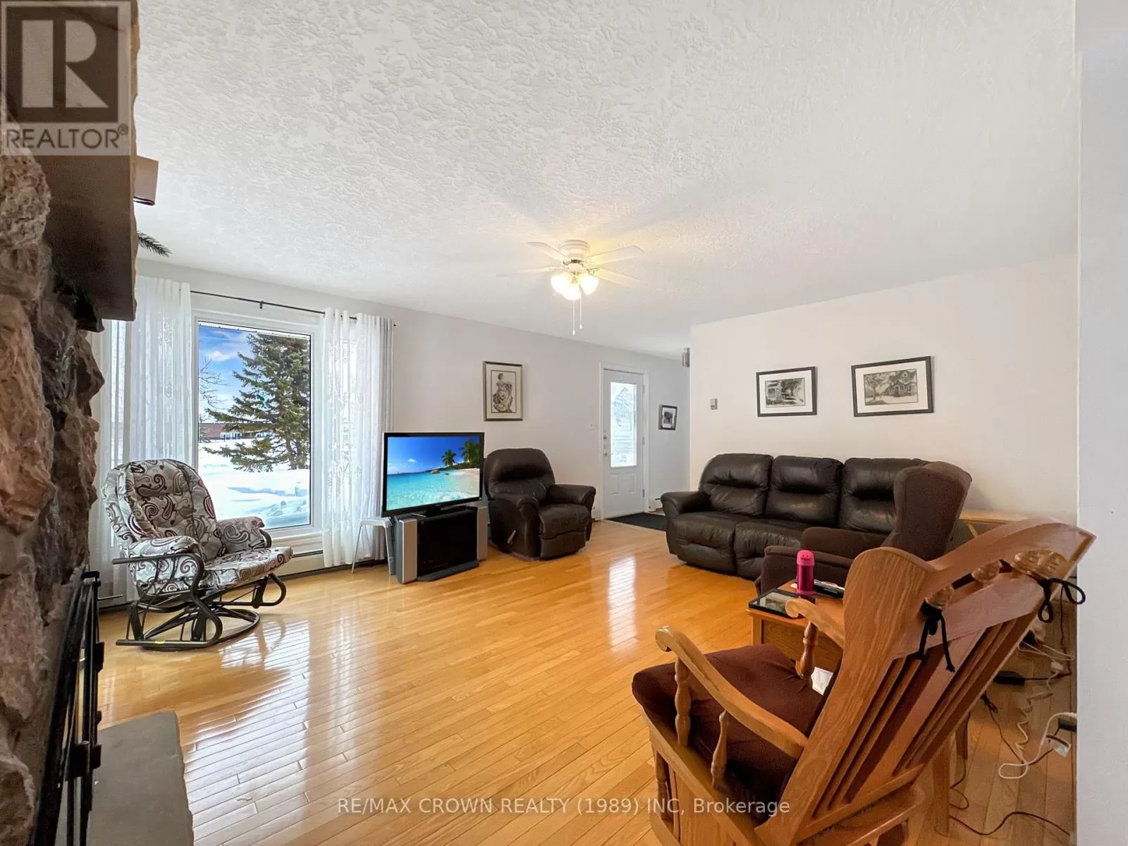 Cross Streets: Corner of 15th and West. ** Directions: From Front St turn on 15th St. This centrally located home is just steps from the hospital, grocery store, pharmacy, and schools, making it an ideal location for convenience and everyday living. Offering a total of 2 plus 3 bedrooms and 2 bathrooms, this residence includes all appliances and additional furniture if desired. With 2,529 square feet of living space and abundant storage, the home provides both comfort and functionality. The main floor is filled with timeless charm and generously sized rooms, starting with a kitchen that features a patio door leading to a composite deck with an awning, seamlessly connected to the spacious dining room and a naturally lit living room where a wood stone fireplace serves as the focal point. Also on the main floor are a large primary bedroom with extensive closet space, a second bedroom, a well-sized three piece bathroom with a walk in shower, and the convenience of main floor laundry. The lower level offers even more versatility with a large living room perfect for hosting game nights, complete with a wood brick fireplace, as well as three additional bedrooms, a small kitchenette, and another three piece bathroom. The outdoor space caters to a variety of needs with two driveways, a dedicated parking spot for a camper or trailer, and two garages, one measuring 16 by 26 and the other 14 by 22 with heating. Major updates add to the value and peace of mind including a boiler system upgrade in 2021, roof re-shingled in 2022, and a new membrane and weeping tiles installed on the west side in 2025. (id:27476)
