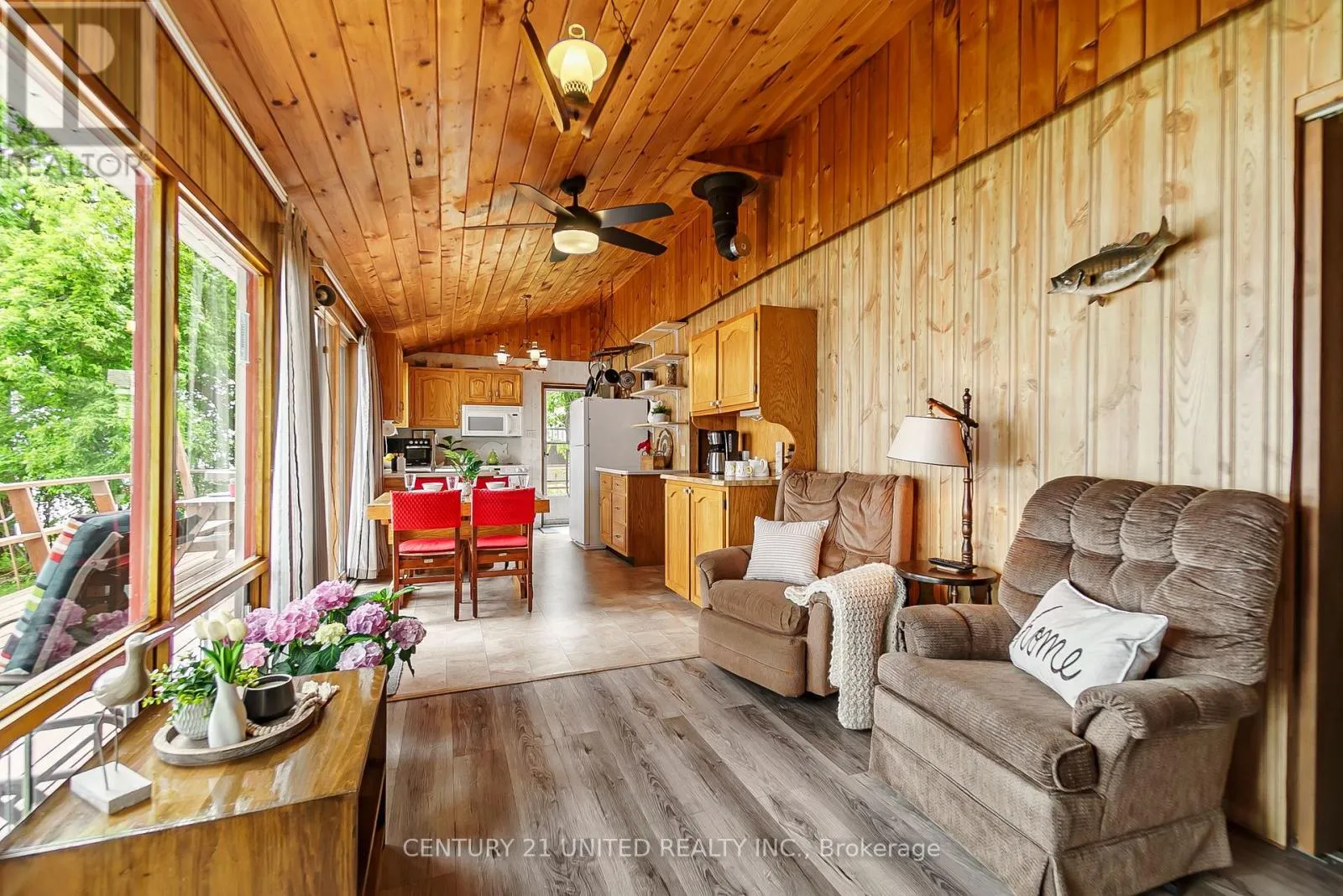 Hiawatha Line/ County Rd 2 Welcome to your own slice of paradise on the north shore of Rice Lake! This charming cottage has 3 good-sized bedrooms and a 3-piece bathroom. The spacious living room features a vaulted tongue and groove ceiling, new vinyl floors and a large picture window that captures the breathtaking views of the lake. The bright kitchen offers plenty of storage space and a dining area with a walkout to the deck. Step out onto the expansive wraparound deck and soak in the tranquility of the water. The large dock is perfect for boats and watercraft, or for jumping off to go for a refreshing swim, allowing you to fully enjoy lake life. And don't forget your fishing rods because Rice Lake is known for its great fishing. Situated on a quiet dead end street, just a short walk to the boat launch, restaurant & gas bar, and only a 20 minute drive to Peterborough. Don't miss out on this amazing opportunity to create lasting memories with your family and friends in this idyllic waterfront retreat. Deck (2019), fridge & well pump(2022), plumbing (2023), vinyl floors in LR & bathroom (2024), newer dock. Yearly land lease fee of $9,792 (20 year lease effective July 1st, 2014). Service fee $762/year includes garbage, recycling pick up and 911 service. No property taxes. Possible to winterize. (id:27476)