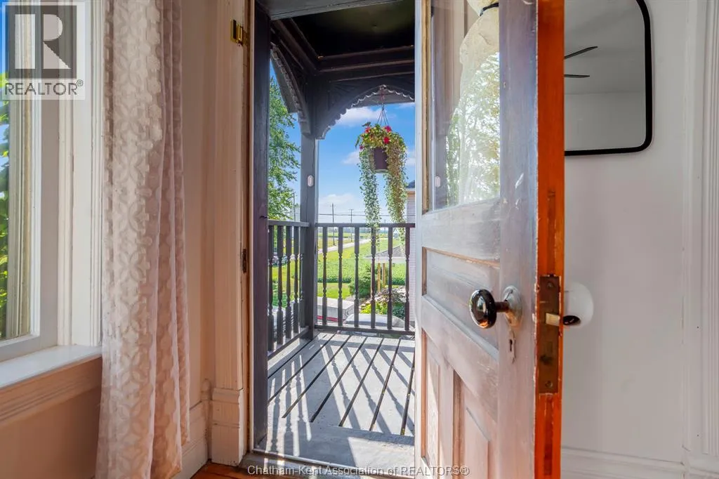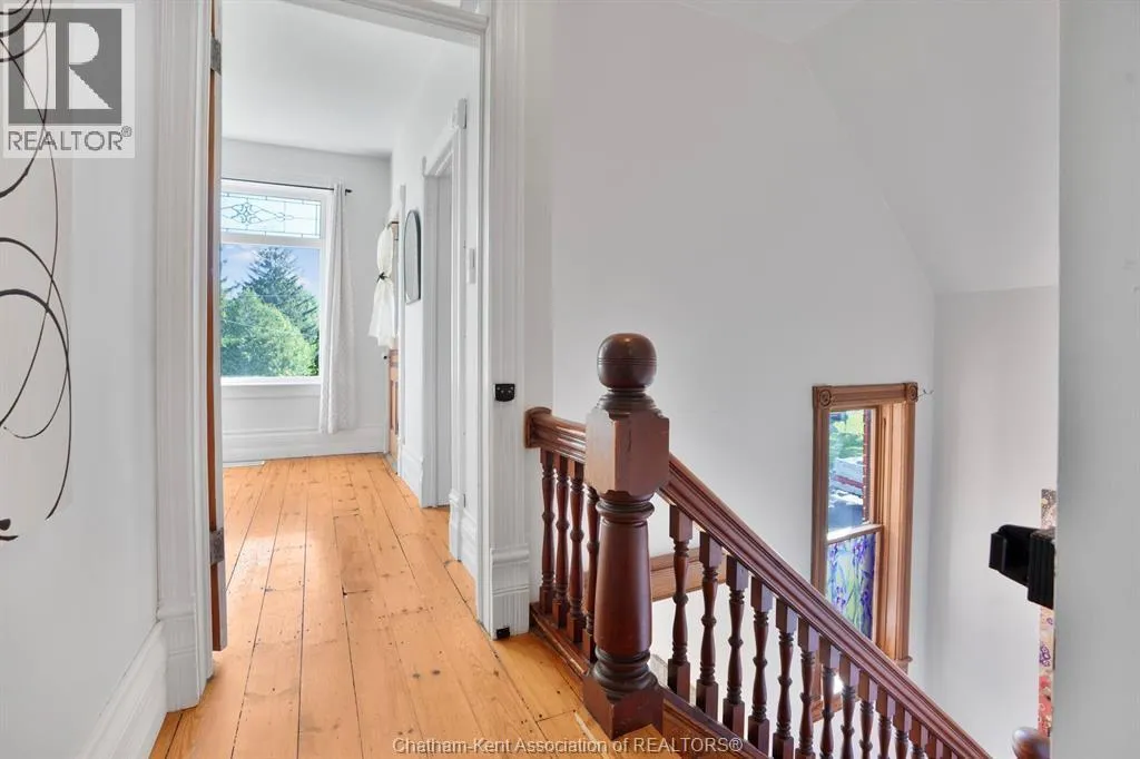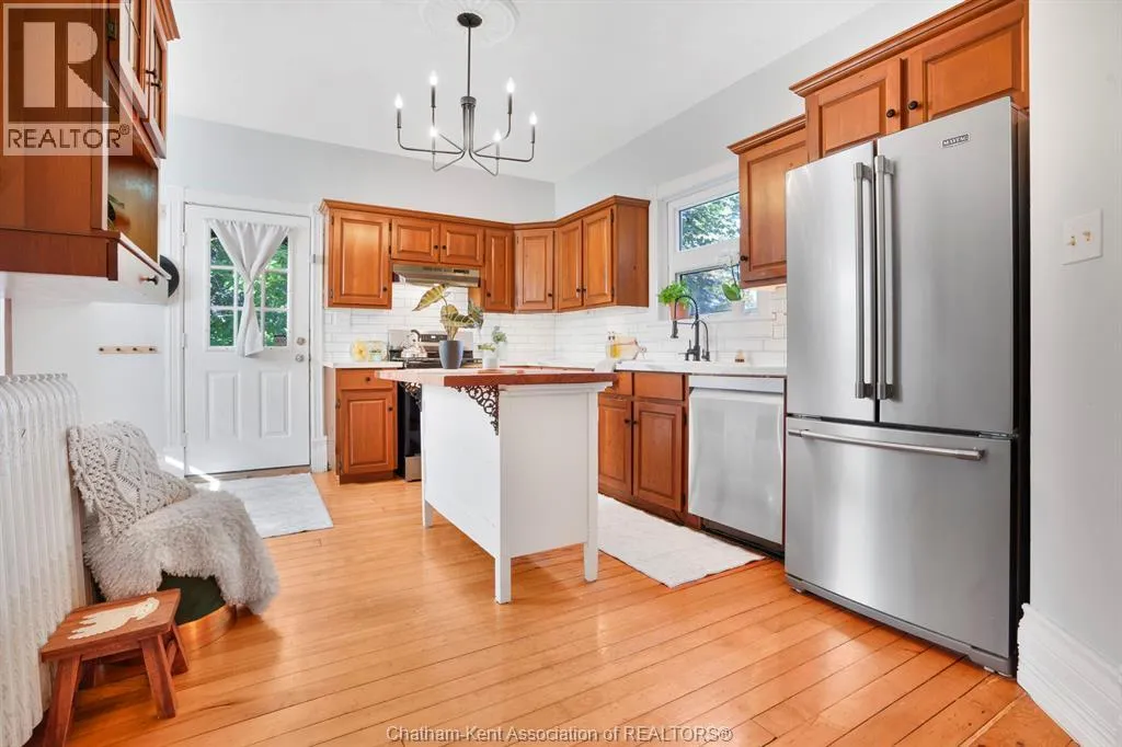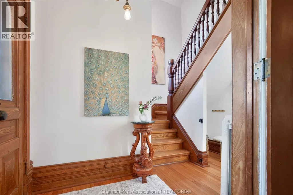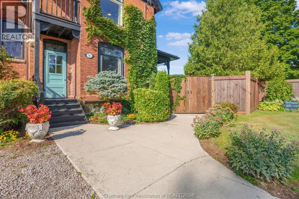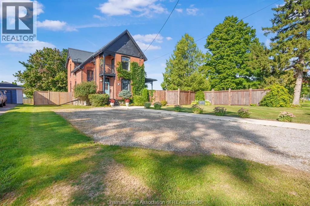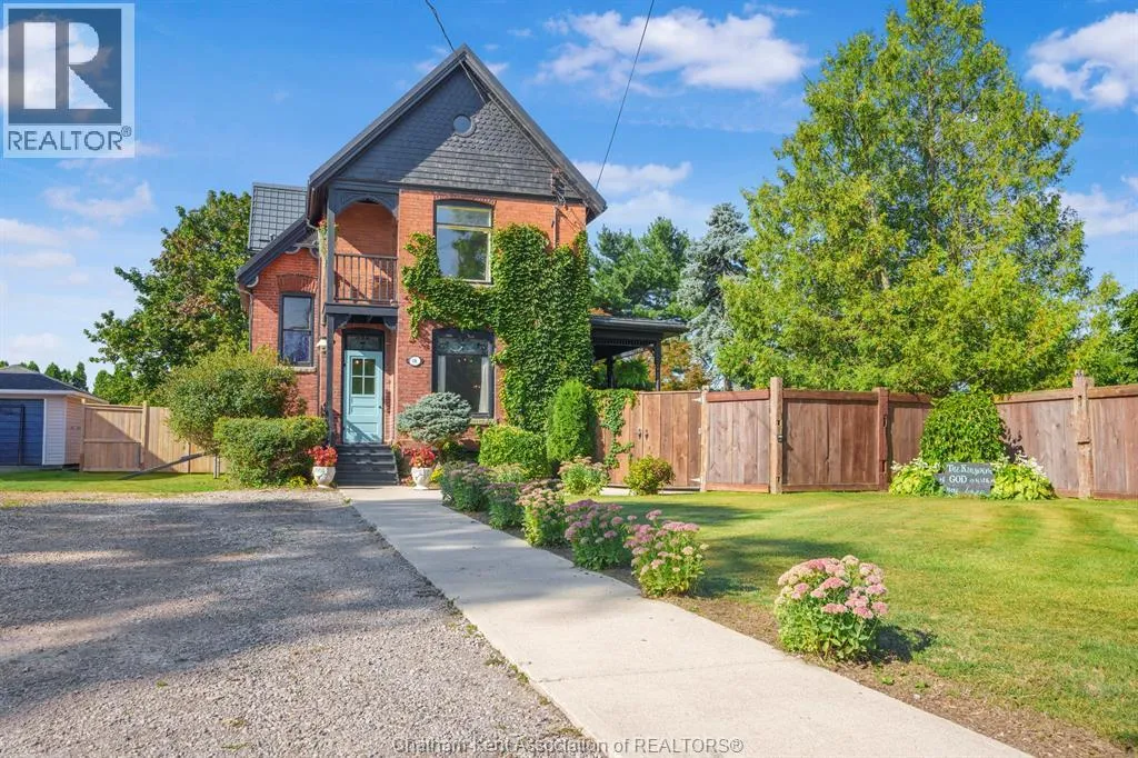 This remarkable Victorian home, built in 1890, blends timeless architecture with thoughtful updates. Constructed of original terracotta brick, it sits proudly on a double lot, fully enclosed by a custom 7-foot reclaimed barn beam fence. Mature trees surround the property, including magnolia, silver maple, and an extraordinary Japanese maple. From the west corner, enjoy breathtaking sunsets over farmland, while the Juliet balcony on the east side offers a perfect view of the sunrise. The grounds are a gardenerâs dream, featuring fruit trees (apple, pear, cherry), berry bushes, and a 50-foot perennial garden with asparagus, strawberries, raspberries, and grapes. A large shop/garage and custom-built chicken coop with permit complete the outdoor amenities. The original wraparound porch greets you with ornate details, while from King Street, the homeâs 30-foot height and original stained-glass picture windows make a striking impression. Inside, the foyer showcases a grand staircase, leading into open-concept living and dining areas with 12-inch trim, crown molding, decorative medallions, and early 1900s Toronto-made cast-iron radiators. The updated kitchen combines charm and function with a farmhouse sink, timeless backsplash, and countertops, plus a new double-door fridge (2021), gas range (2025), and dishwasher (2025). The original butlerâs stairs remain intact. Offering 4+1 bedrooms, this home features 10-foot ceilings on both levels and a repointed fieldstone foundation, even allowing generous headroom in the laundry area (new dryer 2024). The primary suite includes a private dressing room, while the upper bath offers an original reglazed clawfoot tub (2021). With a Hy-Grade steel roof, this property combines heritage character, modern updates, and small-town charmâa rare opportunity to own a true Victorian masterpiece. (id:27476)