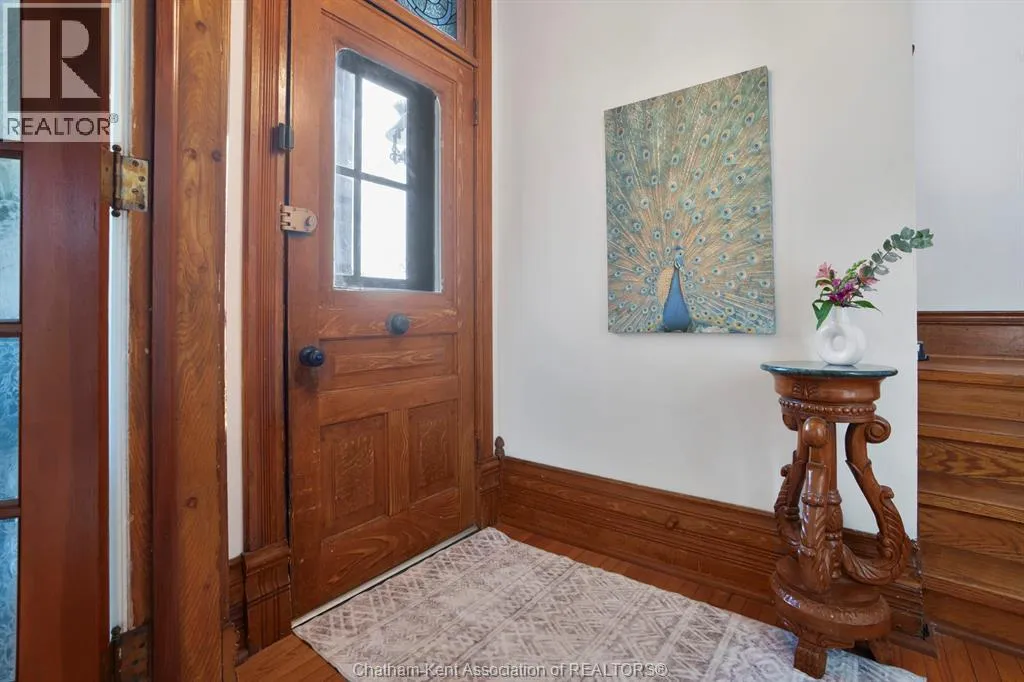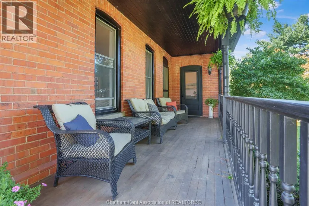 This remarkable Victorian home, built in 1890, blends timeless architecture with thoughtful updates. Constructed of original terracotta brick, it sits proudly on a double lot, fully enclosed by a custom 7-foot reclaimed barn beam fence. Mature trees surround the property, including magnolia, silver maple, and an extraordinary Japanese maple. From the west corner, enjoy breathtaking sunsets over farmland, while the Juliet balcony on the east side offers a perfect view of the sunrise. The grounds are a gardenerâs dream, featuring fruit trees (apple, pear, cherry), berry bushes, and a 50-foot perennial garden with asparagus, strawberries, raspberries, and grapes. A large shop/garage and custom-built chicken coop with permit complete the outdoor amenities. The original wraparound porch greets you with ornate details, while from King Street, the homeâs 30-foot height and original stained-glass picture windows make a striking impression. Inside, the foyer showcases a grand staircase, leading into open-concept living and dining areas with 12-inch trim, crown molding, decorative medallions, and early 1900s Toronto-made cast-iron radiators. The updated kitchen combines charm and function with a farmhouse sink, timeless backsplash, and countertops, plus a new double-door fridge (2021), gas range (2025), and dishwasher (2025). The original butlerâs stairs remain intact. Offering 4+1 bedrooms, this home features 10-foot ceilings on both levels and a repointed fieldstone foundation, even allowing generous headroom in the laundry area (new dryer 2024). The primary suite includes a private dressing room, while the upper bath offers an original reglazed clawfoot tub (2021). With a Hy-Grade steel roof, this property combines heritage character, modern updates, and small-town charmâa rare opportunity to own a true Victorian masterpiece. (id:27476)