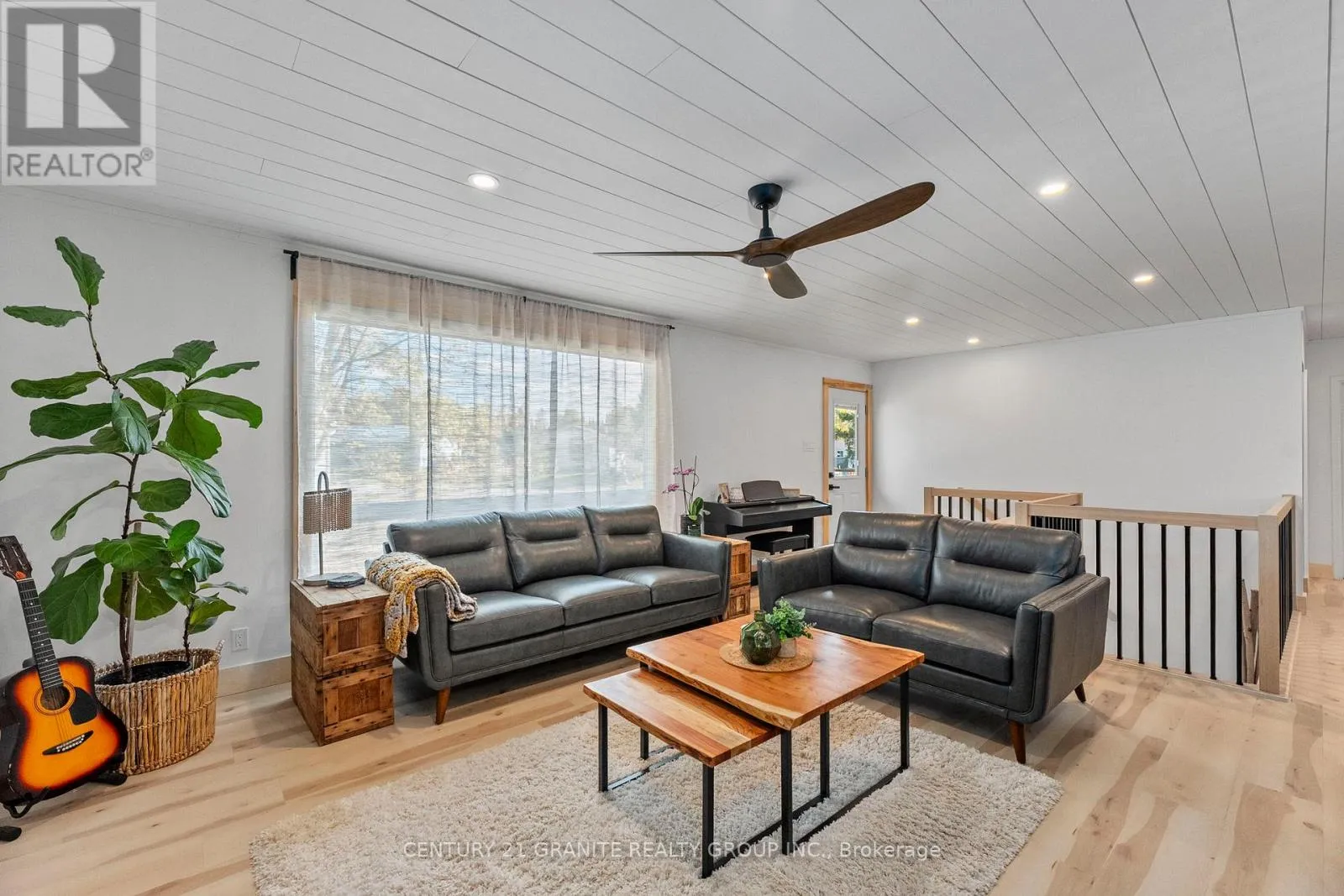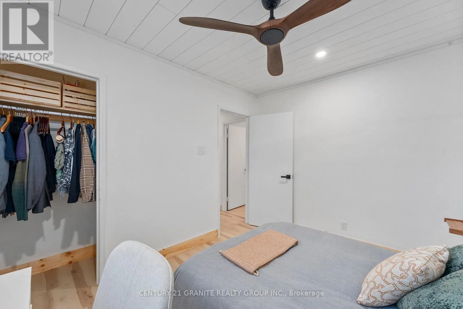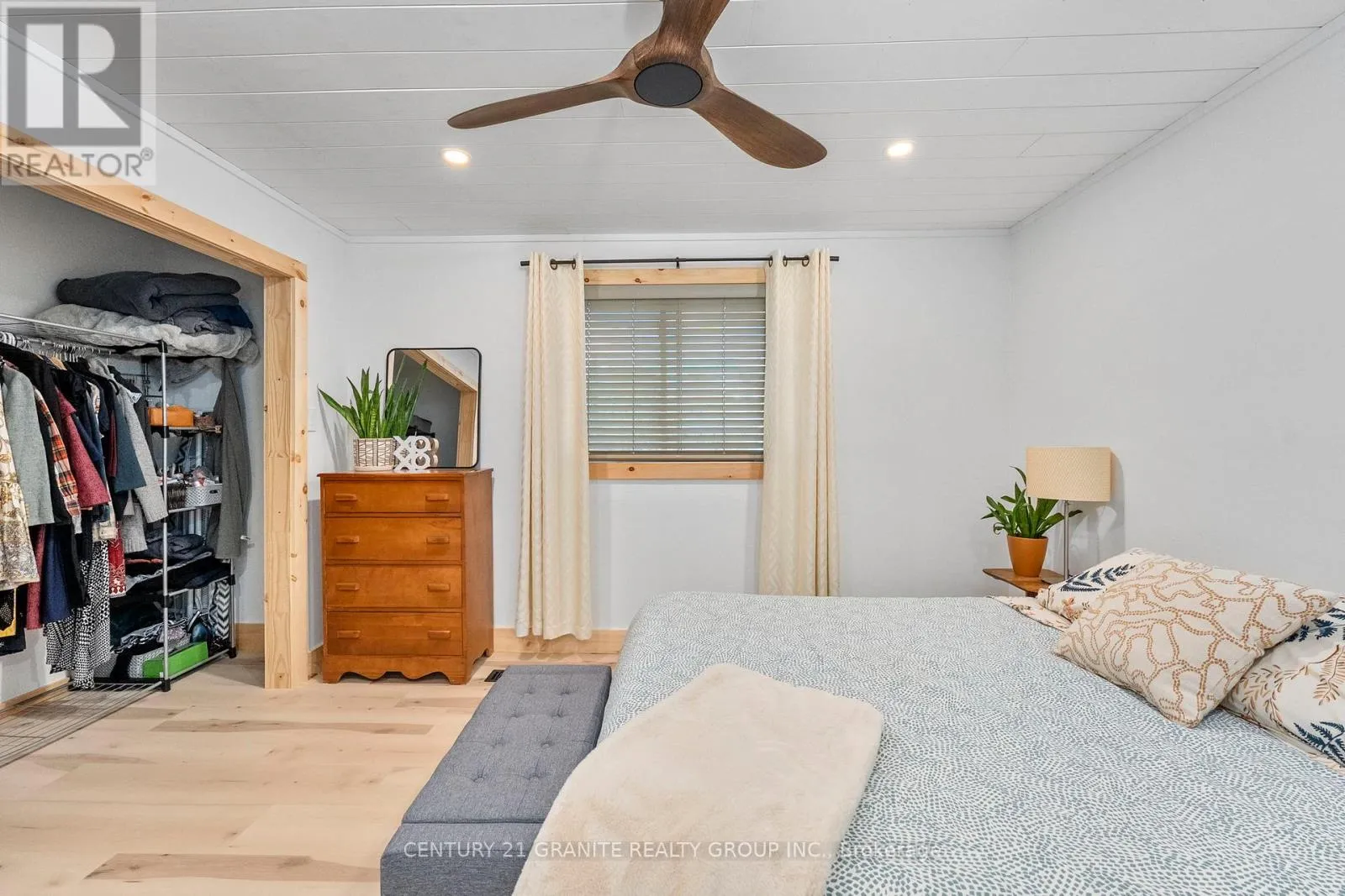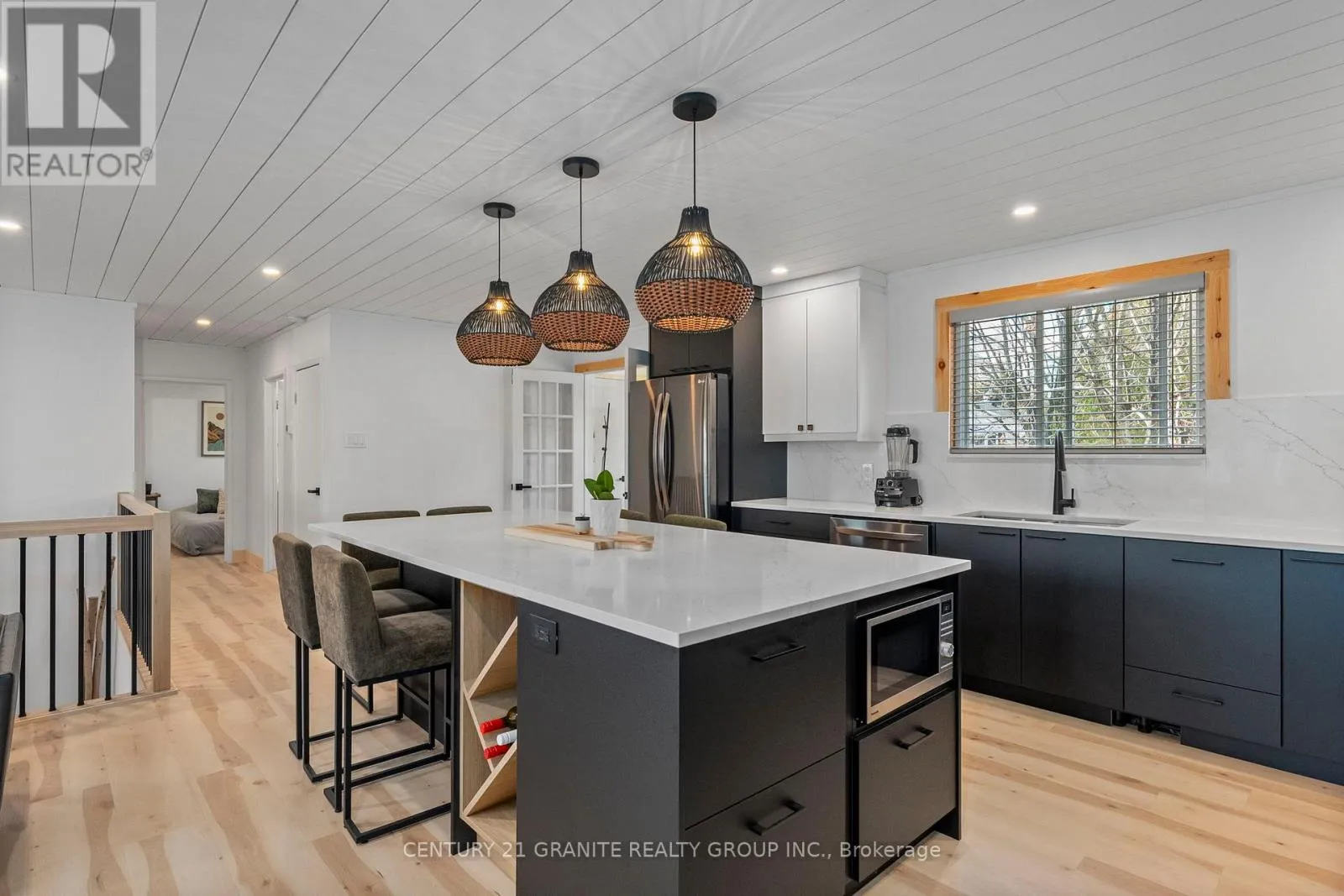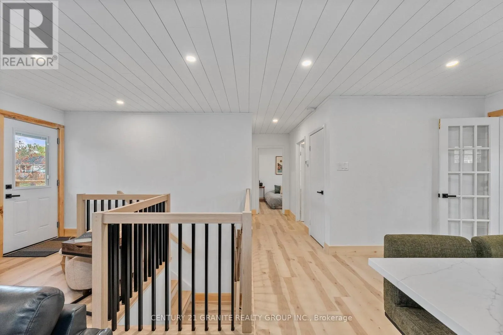 Cross Streets: Sprucedale & Larch. ** Directions: From Bancroft, take Hwy 28 S to Hwy 118 to Cardiff, turn right onto Monck St and the a left onto Sprucedale St. Modern Comfort Meets Scandinavian Warmth - in the Heart of Cardiff, Step inside this freshly renovated home that perfectly blends modern design with Scandinavian charm. The open-concept layout feels bright, warm, and cohesive, featuring Lifeproof "Savannah Islands" flooring, shiplap ceilings, and natural pine accents throughout. At the heart of the home is a showpiece kitchen - a massive quartz island that seats six, premium black stainless LG appliances, and custom cabinetry with thoughtful details like a coffee station and recessed microwave nook. Enjoy a spacious four-season entry / mudroom / sunroom - the ideal spot for morning coffee, plant lovers, or a cozy reading nook. The living area features a custom ash staircase, oversized window with remote blind, and walnut ceiling fan - tying together warmth and elegance. The spa-inspired bathroom includes a deep soaker tub, floating vanity, and rainfall shower, while both bedrooms offer solid-core doors, custom window coverings, and walnut ceiling fans. Enjoy a centrally located laundry area featuring a premium LG ThinQ washer-dryer tower for easy main-floor access. Downstairs, the bright, dry basement offers flexible space for a home office, gym, and storage, plus a second laundry setup and extra fridge - practical for real life. Outside, you'll find a fully fenced backyard, fire pit area, and a new front deck with modern railing. A lockable 11'7' Keter shed and ample parking complete the package. Every inch of this home reflects quality, style, and comfort - all in the welcoming community of Cardiff, minutes from Silent Lake, Paudash Beach, trails for every season, and everyday amenities. (id:27476)