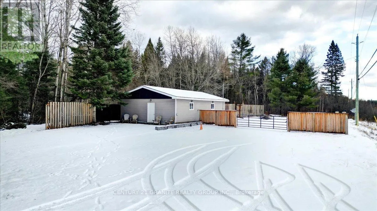 Cross Streets: LOOP ROAD/FARR RD. ** Directions: FROM BANCROFT, HWY 28 SOUTH, RIGHT ON HWY 118, RIGHT ON LOOP ROAD(HWY 648), FOLLOW TO #1725 ON LEFT. This strategically positioned commercial property offers a high visibility presence on one of the busiest highways in the region. Its location provides consistent traffic flow and excellent exposure, while remaining only minutes from Wilbermere Lake, Dark Lake, and the many amenities of Wilberforce, recognized as the Geocaching Capital of Canada. The property features an over 1,000 square foot building designed for functional versatility. It includes a garage door and a man door, along with 100 amp hydro service, septic, and well. Currently used as a workshop and storage facility, the building is divided into two spacious rooms, a two piece bath and utility area, and an additional storage space. The layout supports a wide range of commercial operations or future reconfiguration as needed. Outdoors, the site offers a generous gated storage or parking area with ample room for vehicles, equipment, inventory, or customer parking. The 0.49 acre lot provides more than 200 feet of prime highway frontage, ensuring strong visibility and convenient access. The CH-4 zoning enables a broad spectrum of permitted uses, including chip truck, lumber yard, commercial nursery or greenhouse, country market, motor vehicle shop, and many other commercial, service or retail based operations. For those seeking a blended residential and commercial opportunity, construction of a new home on the property while utilizing the existing garage or workshop presents a very compelling option. This is an exceptional opportunity for entrepreneurs, tradespeople, investors, or those looking to establish a highly visible business location supported by flexible zoning, solid infrastructure, and a high traffic corridor. (id:27476)