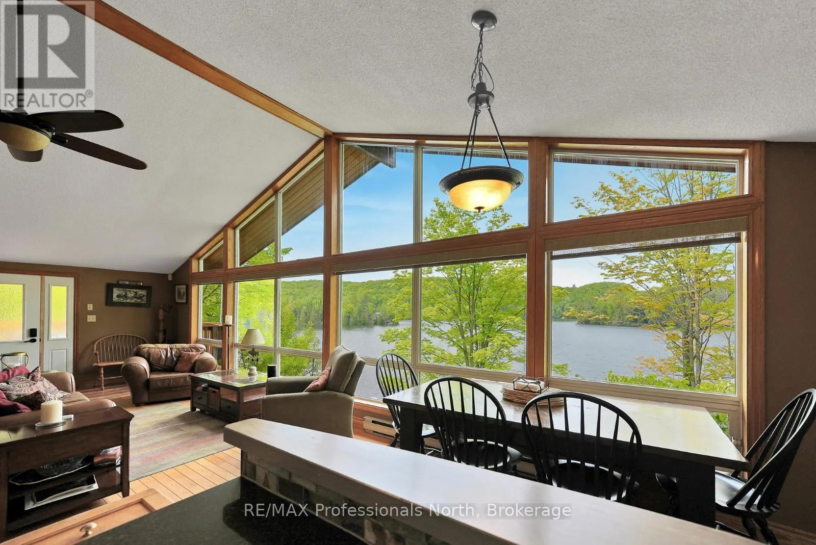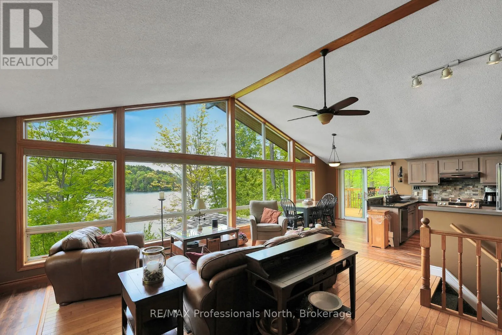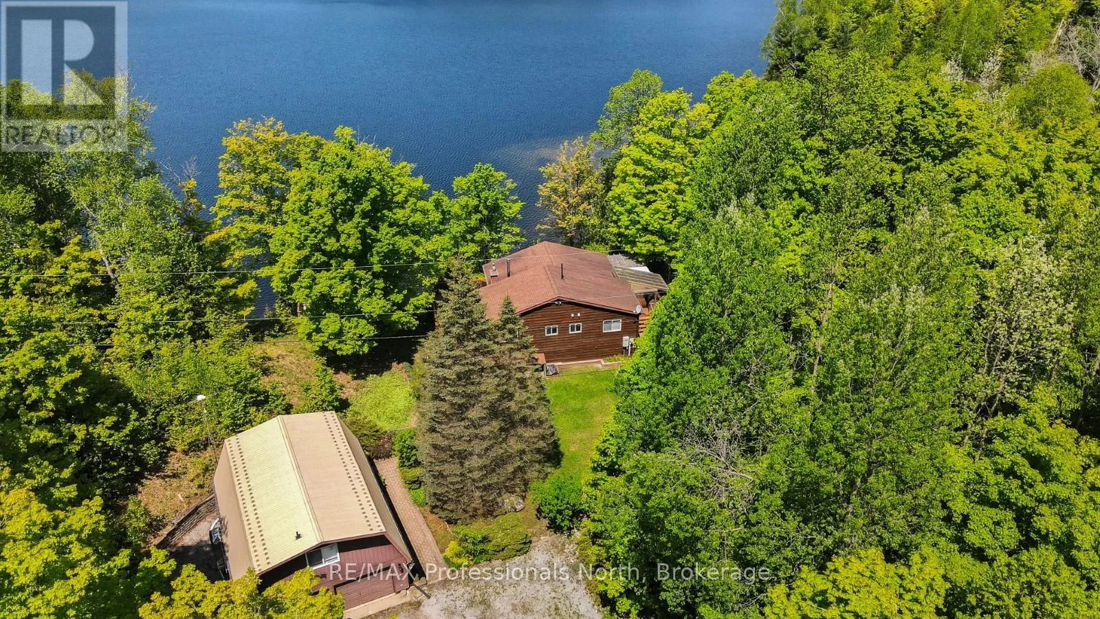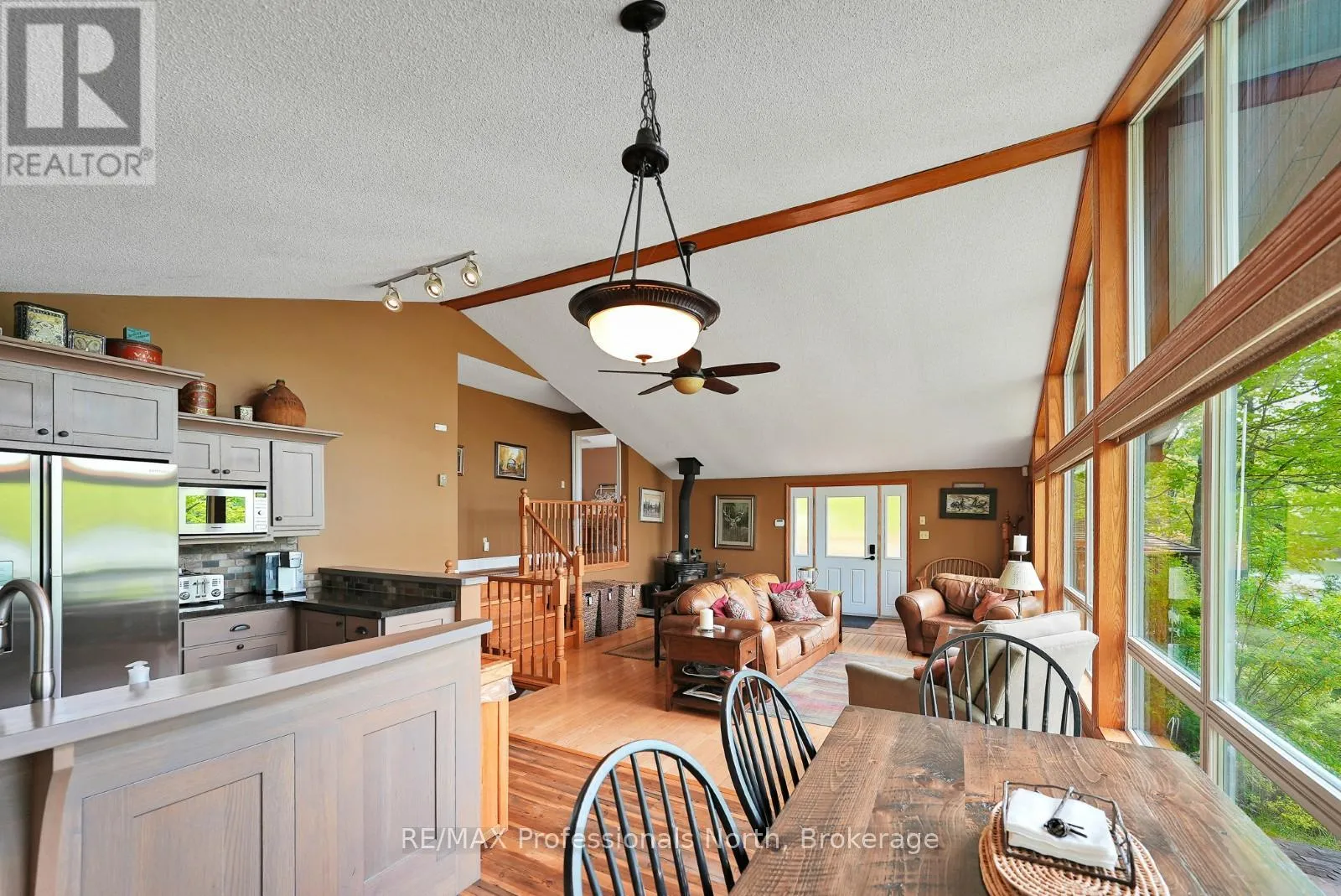 ON-118 E to Essonville Line Set on the shores of Esson Lake, this private four-level backsplit offers a quiet setting with deep water off the dock, excellent lake trout fishing, and miles of clean, navigable shoreline to explore. Known for its depth and clarity, Esson Lake is well-suited for those who enjoy swimming, boating, and time on the water. The main level features a bright, open-concept layout with cathedral ceilings, an updated kitchen, and a wall of windows framing full lake views. A wood stove adds warmth, and there is direct access to a lakeside outdoor kitchen designed for easy entertaining. Upstairs, the primary suite includes an ensuite and overlooks the main living space, alongside a second bedroom and a convenient 2-piece bath. The lower level offers an additional guest bedroom, office space, a 3-piece bath with laundry, and a utility room. On the walkout level, a spacious rec room with a pellet stove opens directly to the hot tub deck with views of the lake. A screened gazebo provides another comfortable space to take in the waterfront setting. An oversized two-car garage with an attached workshop adds practical year-round use, while the finished loft above offers flexible space for a gym, studio, or additional storage. Located just minutes from Wilberforce for everyday essentials and approximately 20 minutes to the Village of Haliburton for a wider range of amenities, this property combines privacy, space, and access to one of Haliburton County's sought-after lakes. (id:27476)