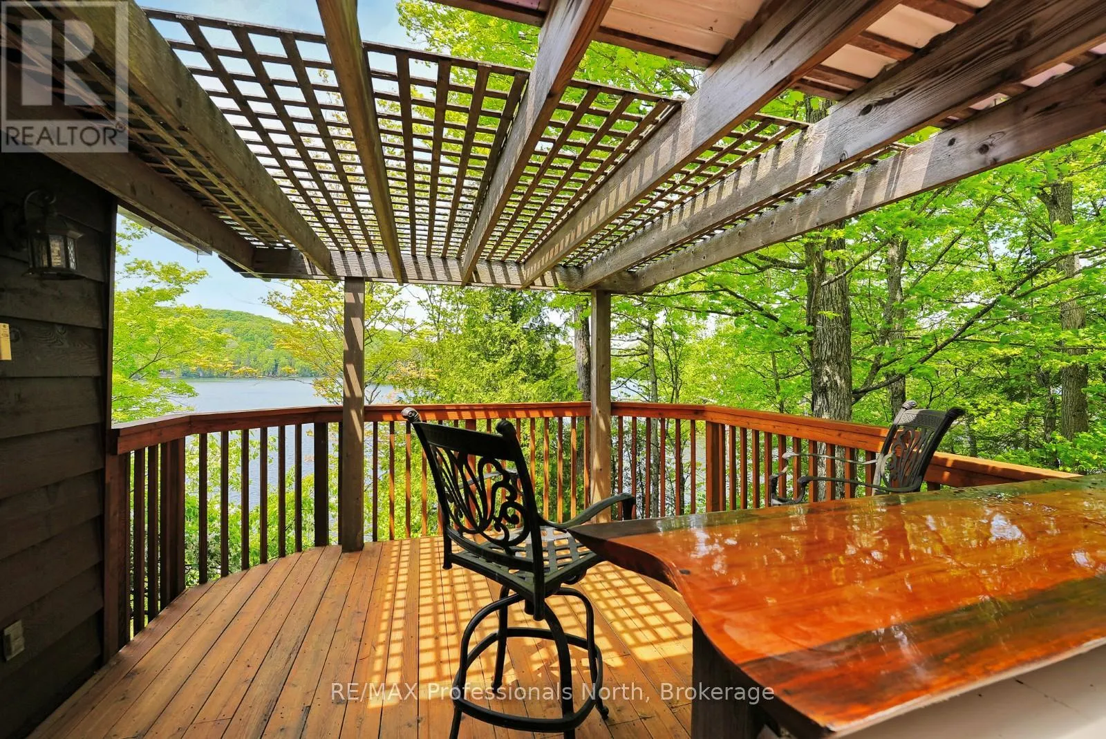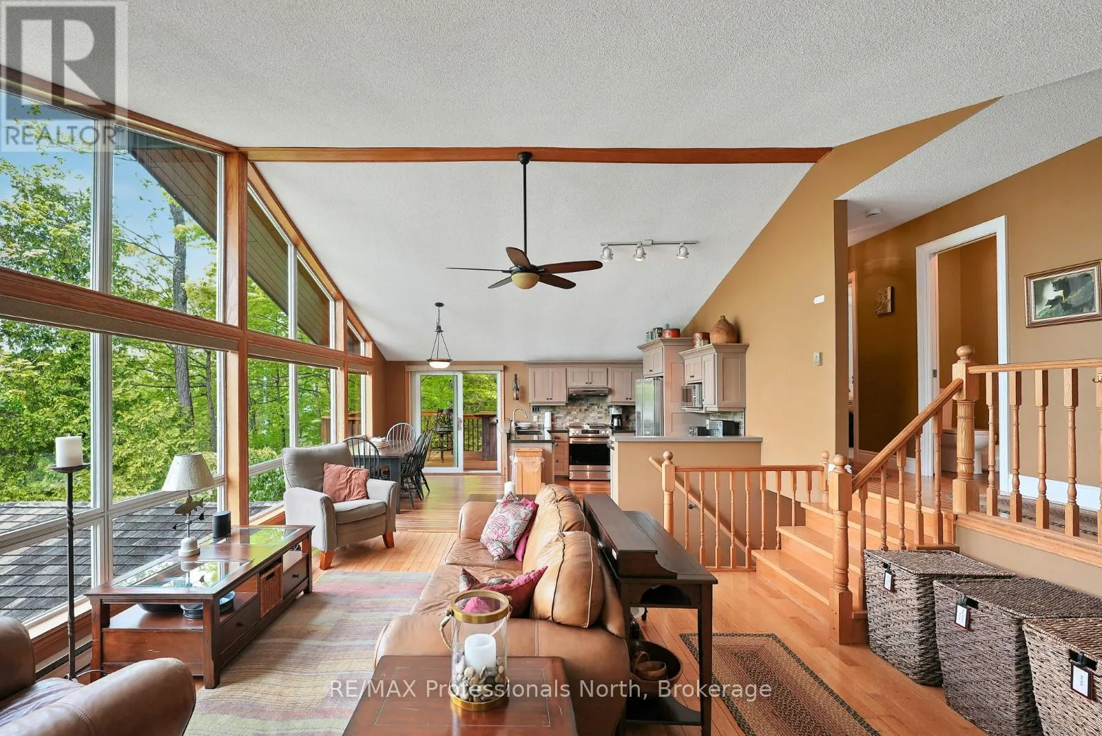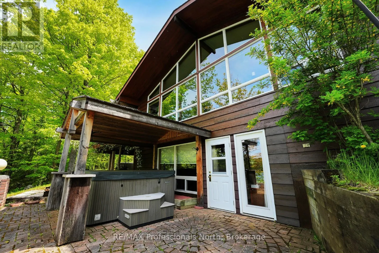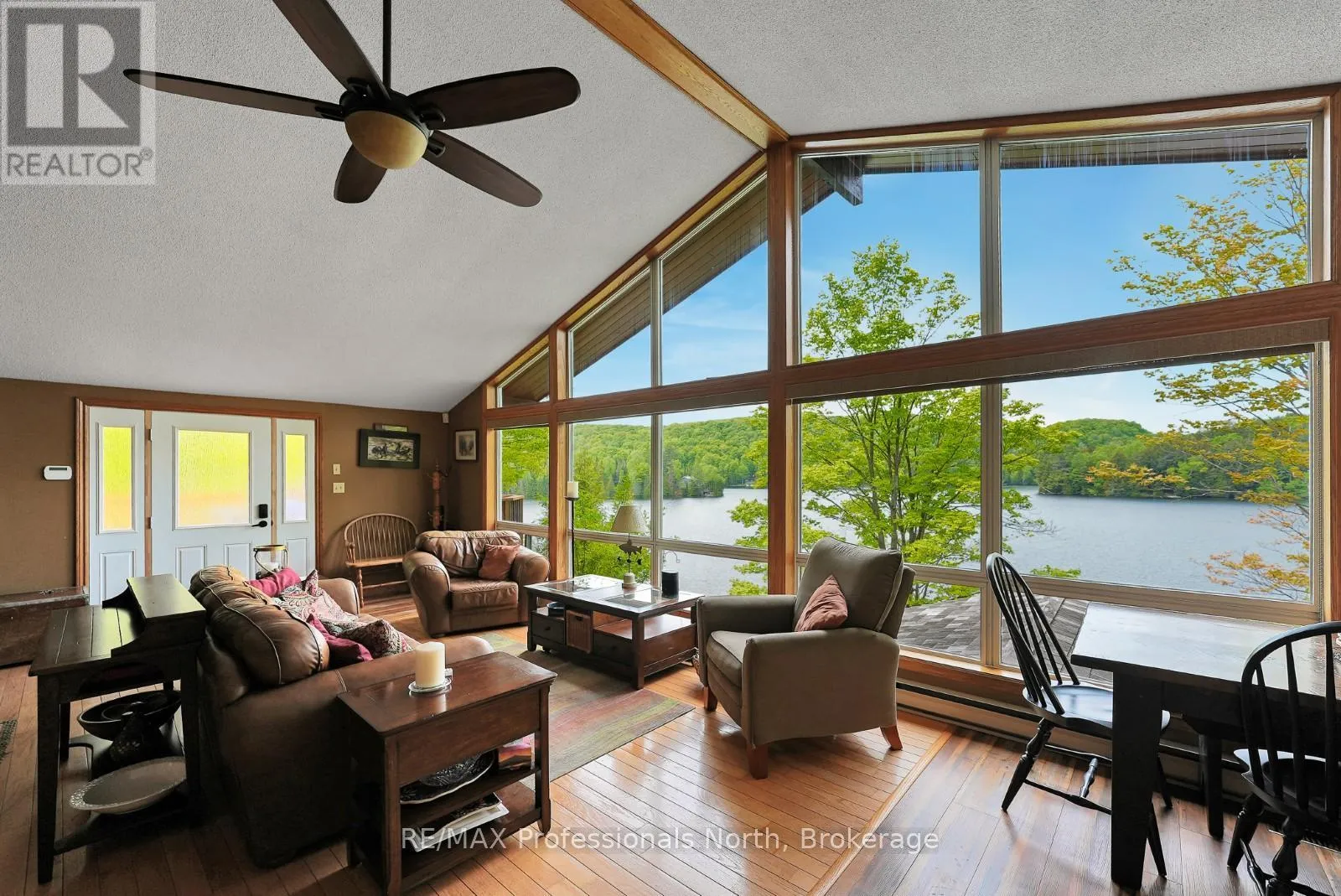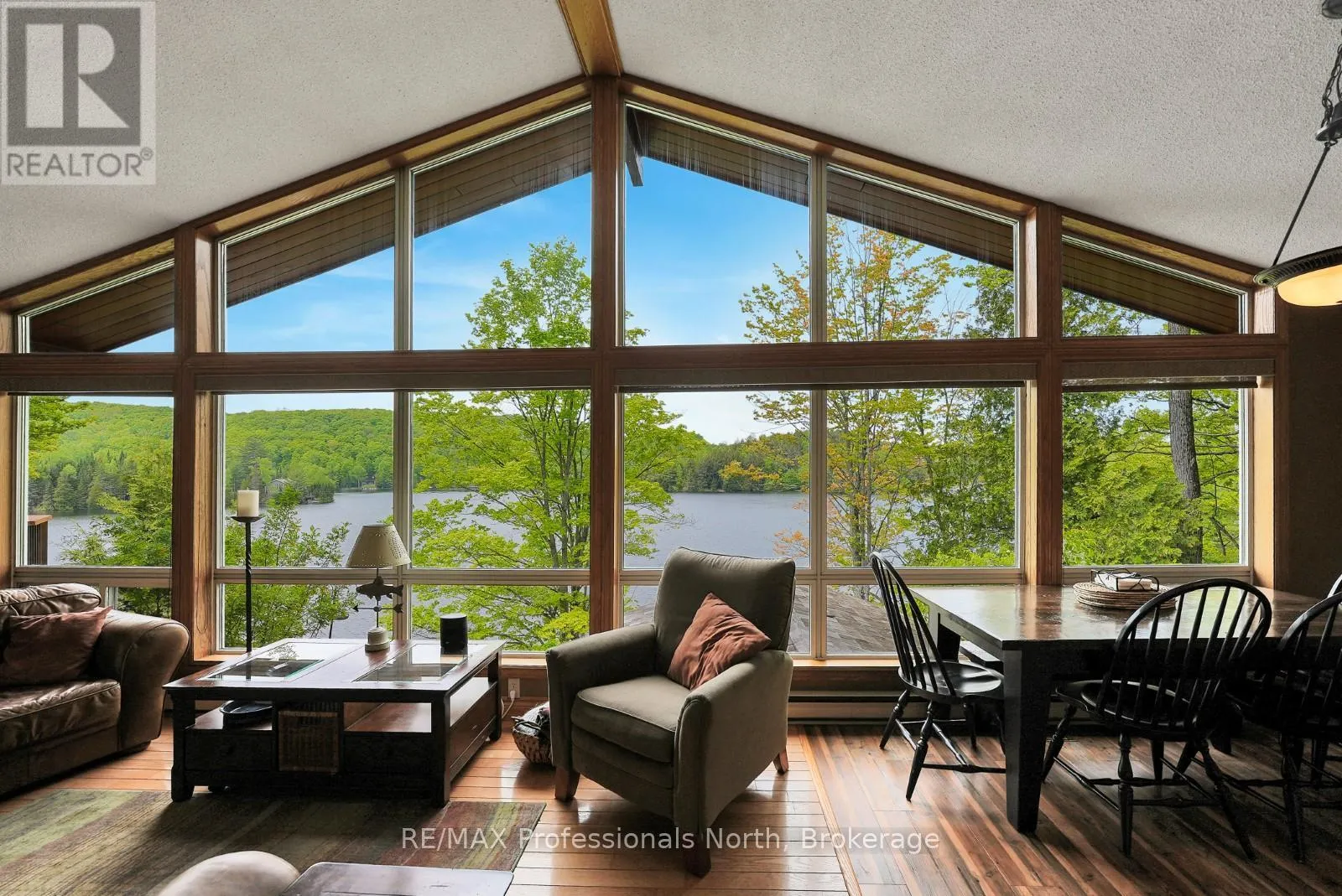 ON-118 E to Essonville Line Set on the shores of Esson Lake, this private four-level backsplit offers a quiet setting with deep water off the dock, excellent lake trout fishing, and miles of clean, navigable shoreline to explore. Known for its depth and clarity, Esson Lake is well-suited for those who enjoy swimming, boating, and time on the water. The main level features a bright, open-concept layout with cathedral ceilings, an updated kitchen, and a wall of windows framing full lake views. A wood stove adds warmth, and there is direct access to a lakeside outdoor kitchen designed for easy entertaining. Upstairs, the primary suite includes an ensuite and overlooks the main living space, alongside a second bedroom and a convenient 2-piece bath. The lower level offers an additional guest bedroom, office space, a 3-piece bath with laundry, and a utility room. On the walkout level, a spacious rec room with a pellet stove opens directly to the hot tub deck with views of the lake. A screened gazebo provides another comfortable space to take in the waterfront setting. An oversized two-car garage with an attached workshop adds practical year-round use, while the finished loft above offers flexible space for a gym, studio, or additional storage. Located just minutes from Wilberforce for everyday essentials and approximately 20 minutes to the Village of Haliburton for a wider range of amenities, this property combines privacy, space, and access to one of Haliburton County's sought-after lakes. (id:27476)