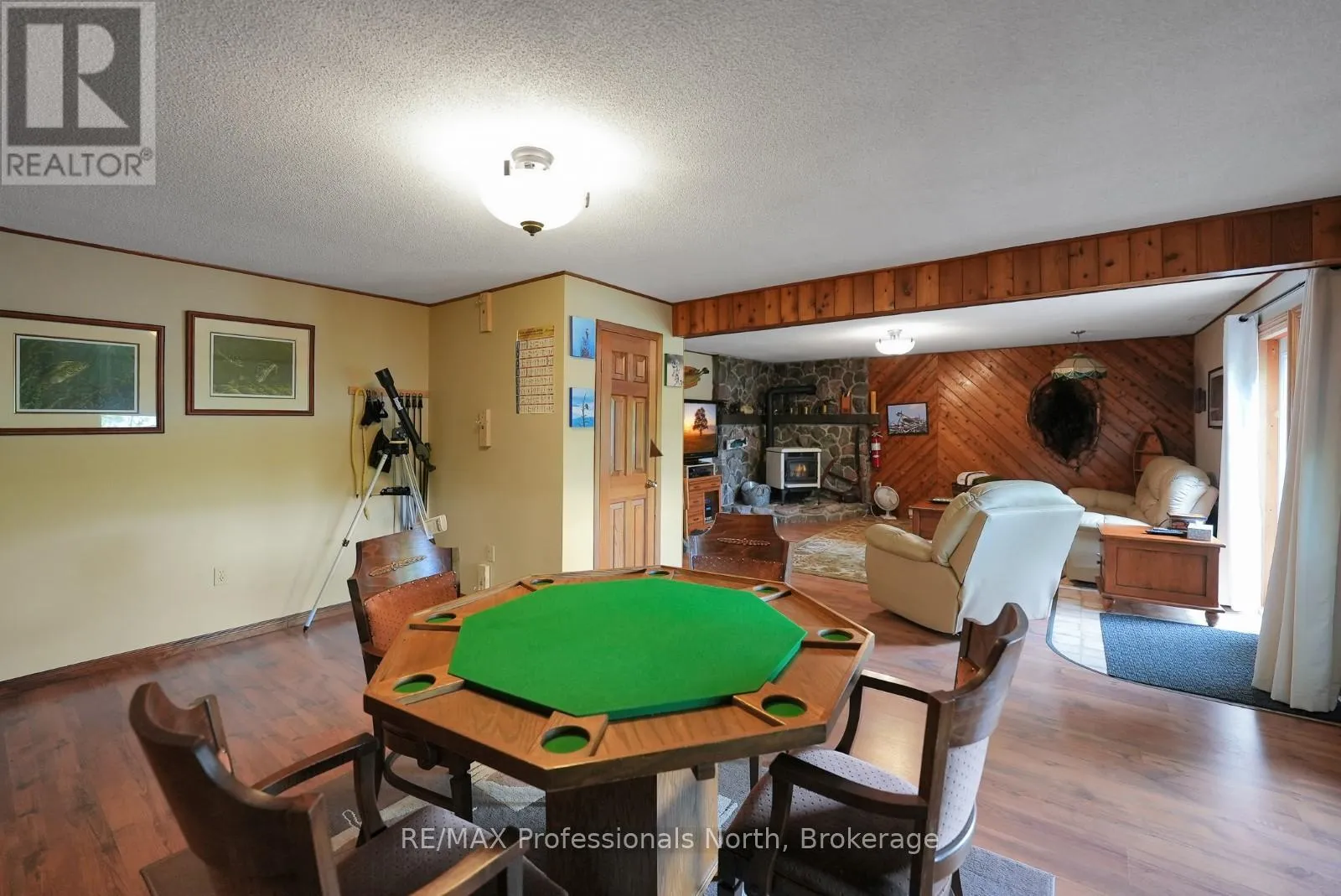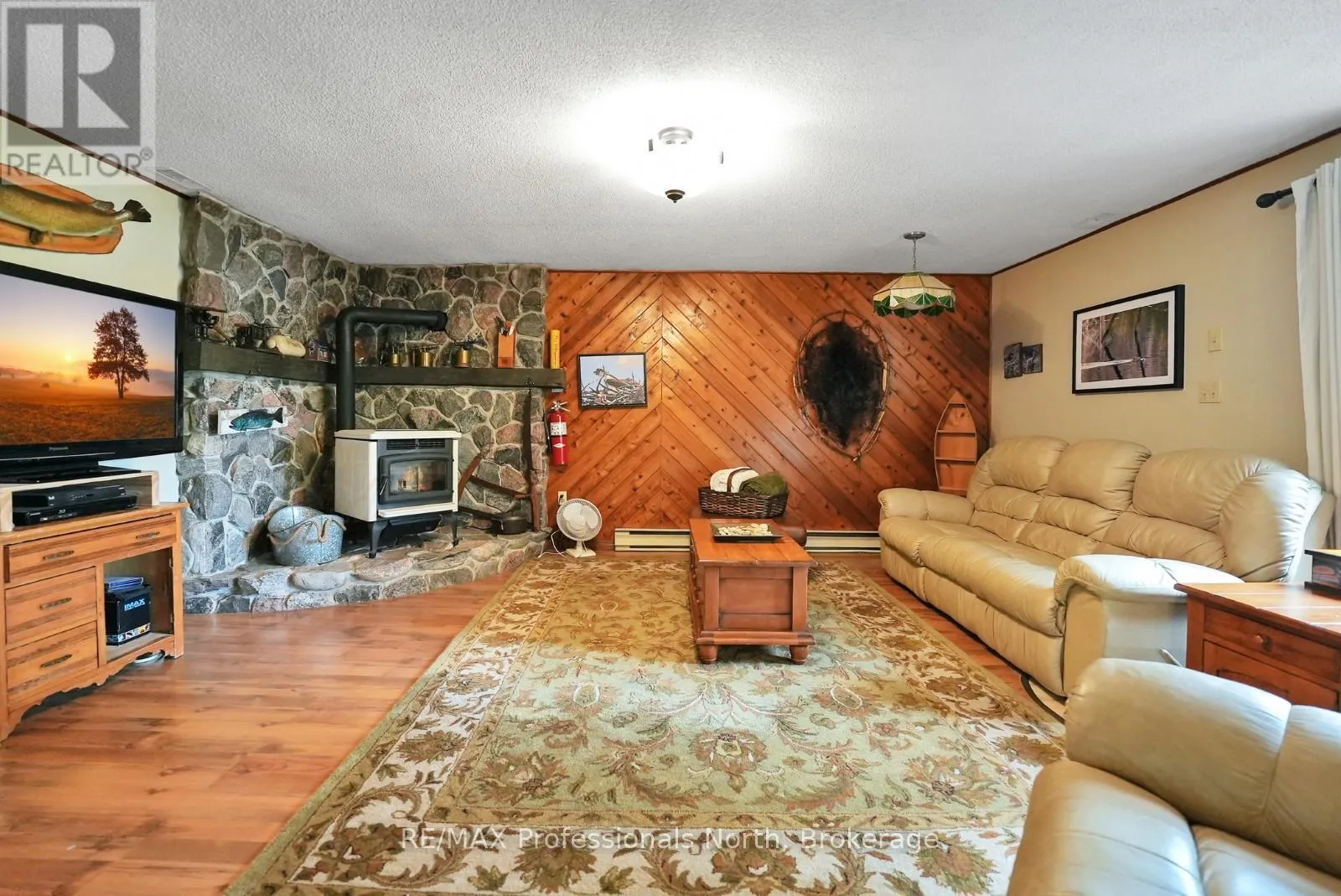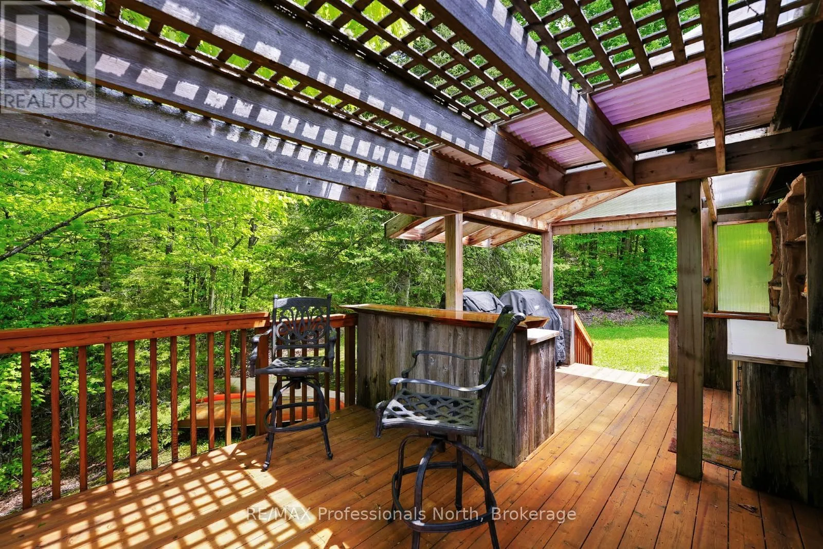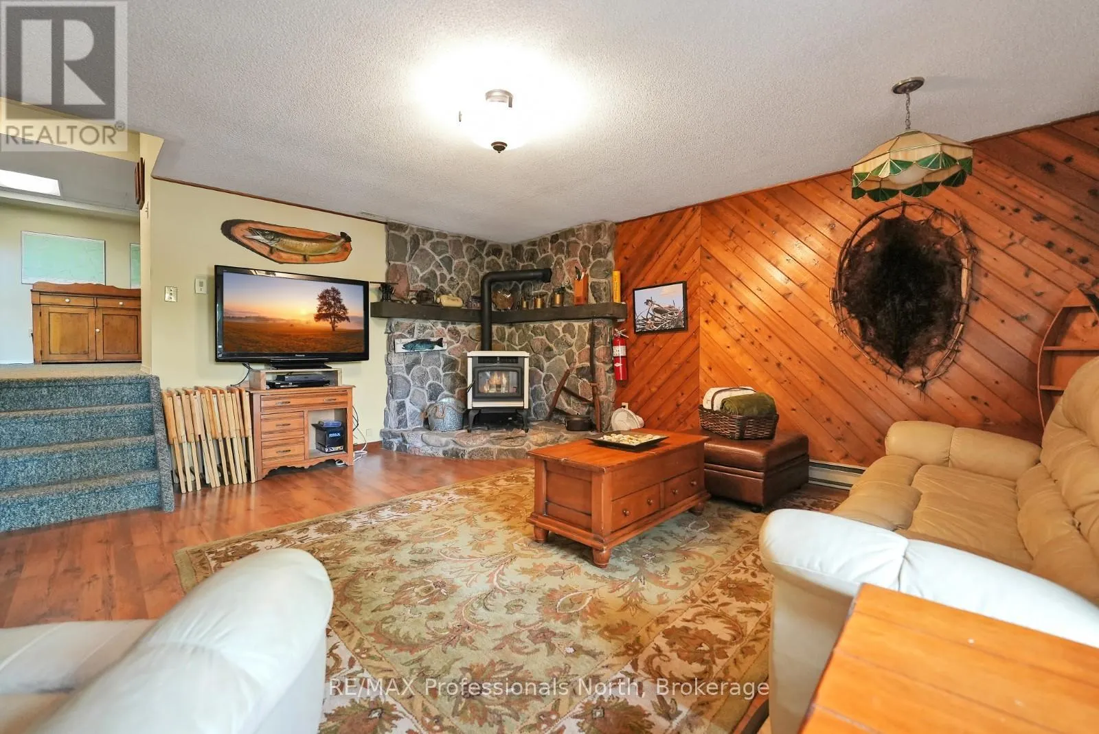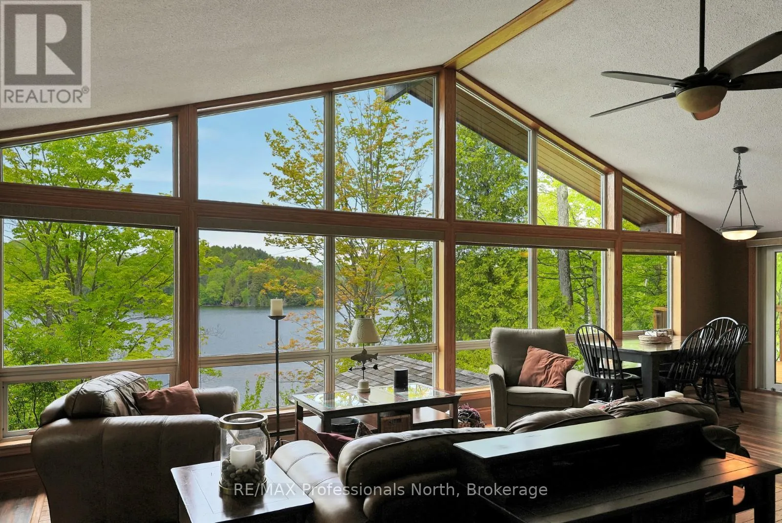 ON-118 E to Essonville Line Set on the shores of Esson Lake, this private four-level backsplit offers a quiet setting with deep water off the dock, excellent lake trout fishing, and miles of clean, navigable shoreline to explore. Known for its depth and clarity, Esson Lake is well-suited for those who enjoy swimming, boating, and time on the water. The main level features a bright, open-concept layout with cathedral ceilings, an updated kitchen, and a wall of windows framing full lake views. A wood stove adds warmth, and there is direct access to a lakeside outdoor kitchen designed for easy entertaining. Upstairs, the primary suite includes an ensuite and overlooks the main living space, alongside a second bedroom and a convenient 2-piece bath. The lower level offers an additional guest bedroom, office space, a 3-piece bath with laundry, and a utility room. On the walkout level, a spacious rec room with a pellet stove opens directly to the hot tub deck with views of the lake. A screened gazebo provides another comfortable space to take in the waterfront setting. An oversized two-car garage with an attached workshop adds practical year-round use, while the finished loft above offers flexible space for a gym, studio, or additional storage. Located just minutes from Wilberforce for everyday essentials and approximately 20 minutes to the Village of Haliburton for a wider range of amenities, this property combines privacy, space, and access to one of Haliburton County's sought-after lakes. (id:27476)