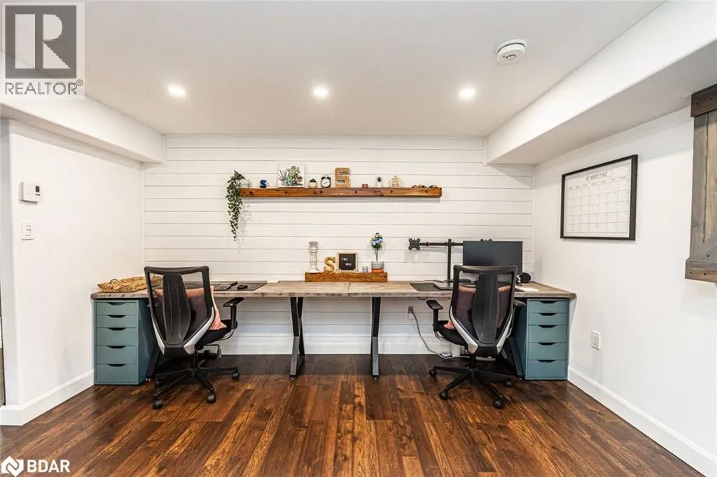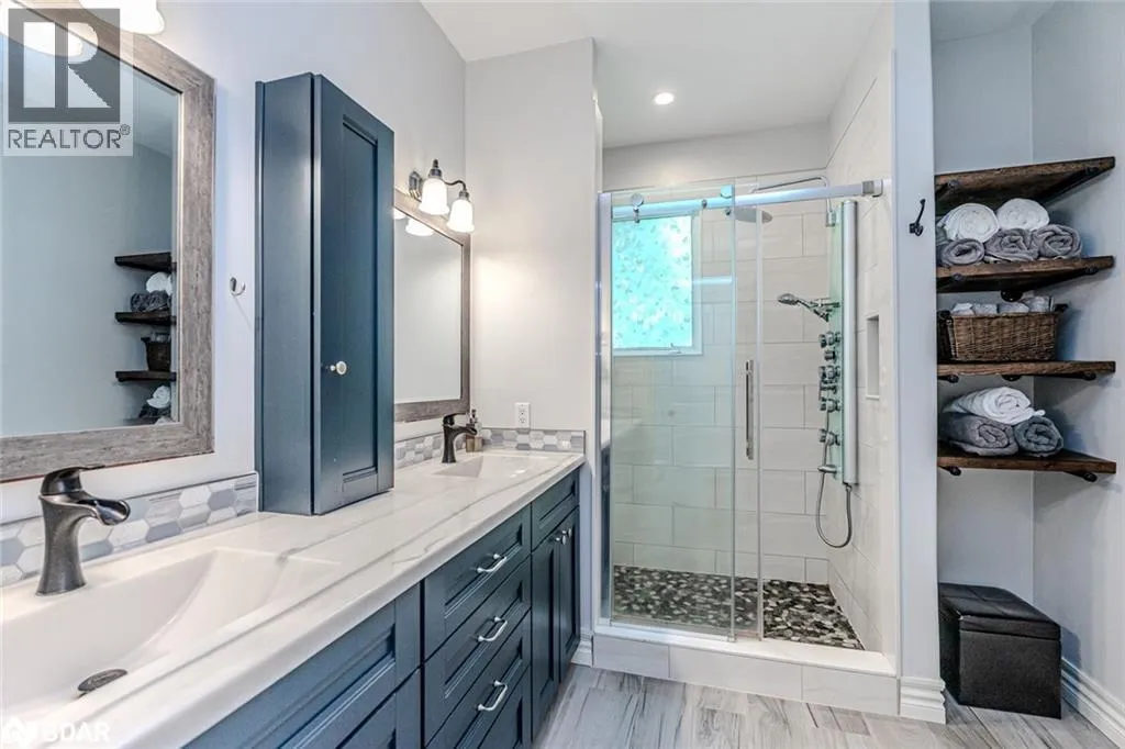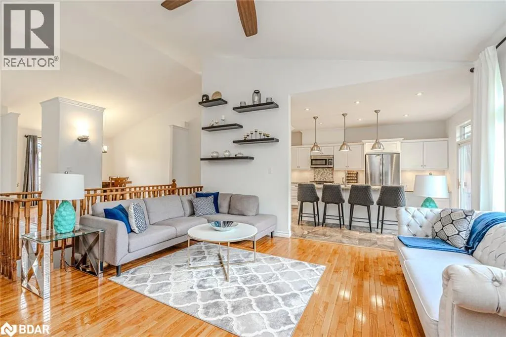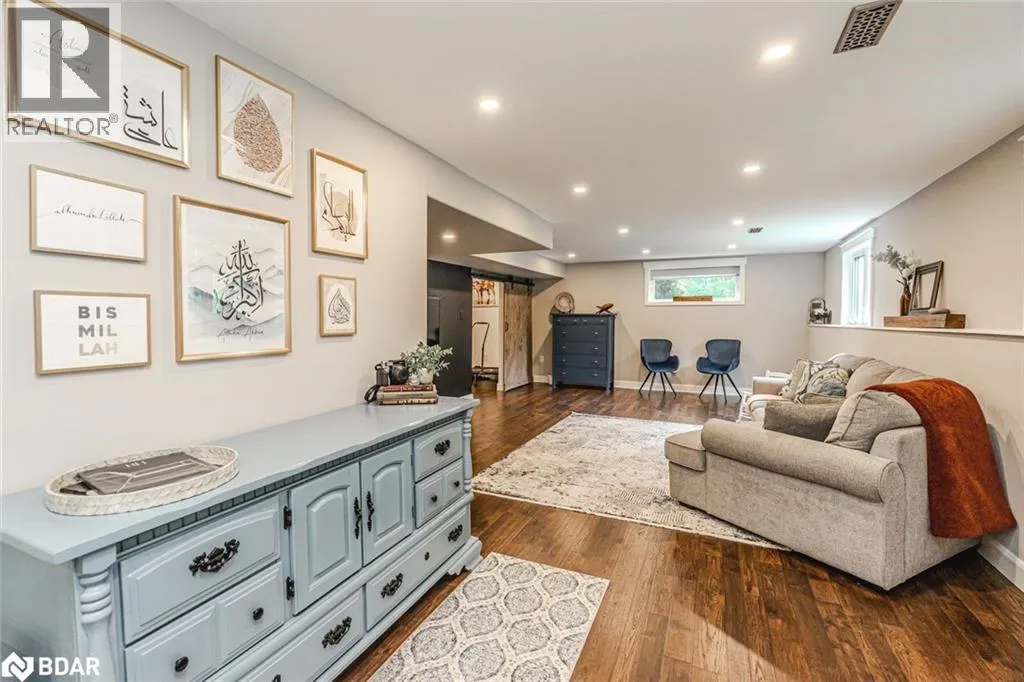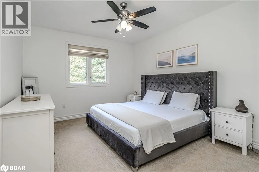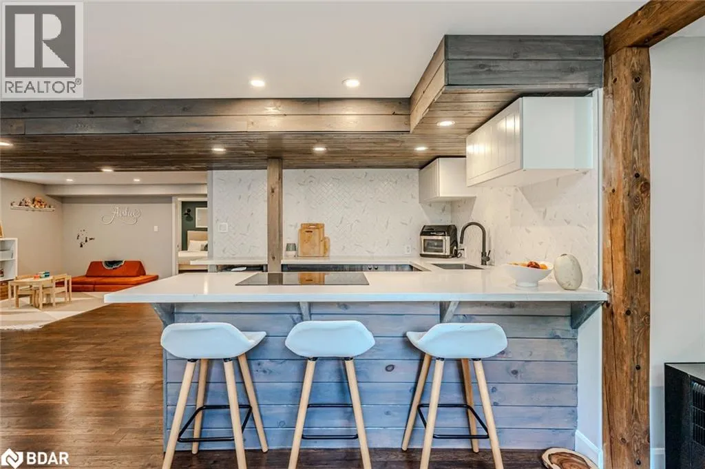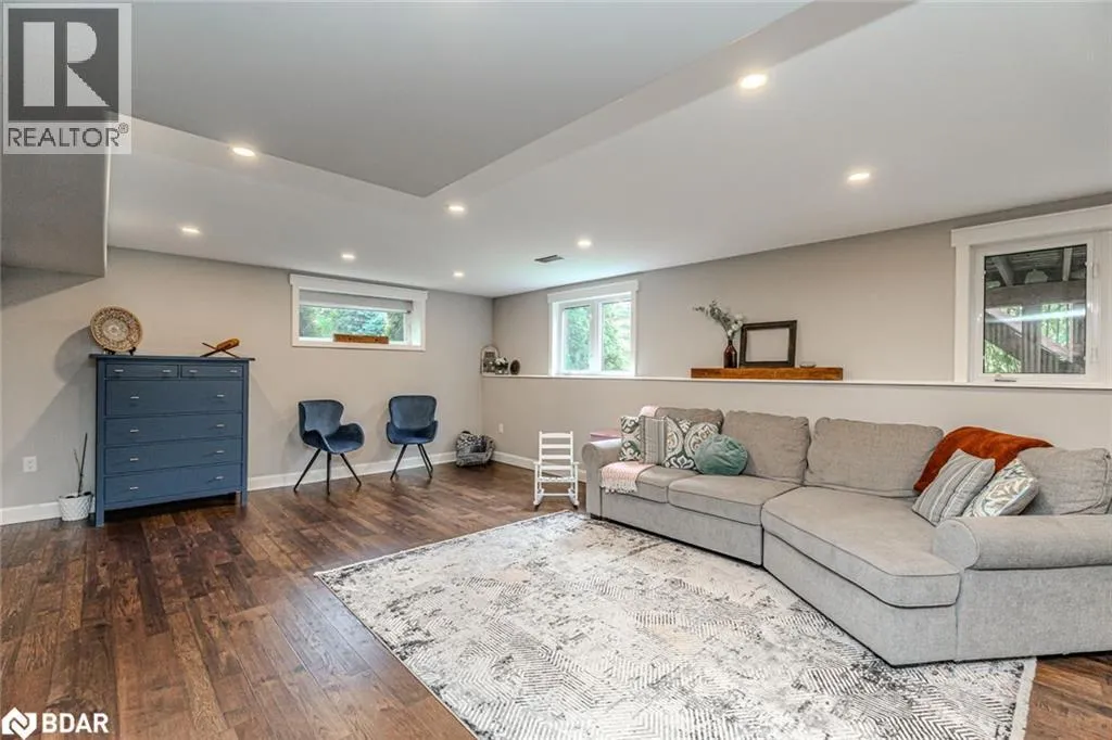 Penetanguishene Rd/Horseshoe Valley Rd W/Line 3 N/Highland Dr SOPHISTICATED HORSESHOE VALLEY RETREAT WITH OVER 3,750 FIN SQ FT, IN-LAW POTENTIAL, TRIPLE CAR GARAGE & PRIVATE LOT! Prestigious Horseshoe Valley living awaits in this extraordinary bungalow, steps from Horseshoe Resort and only minutes from golf courses, trails, tennis courts, and Vetta Nordic Spa. From the moment you arrive, the elegance is undeniable, with a brick exterior, updated shingles (2022), a covered porch featuring wood posts and beams, a triple-car garage with inside entry, and a driveway with parking for nine vehicles. The property itself is a private retreat, showcasing mature trees, manicured gardens, a patio with a pergola, a hot tub, a fire pit, a shed, and invisible dog fencing. Over 3,750 fin sq ft of exquisite living space is defined by hardwood floors, 14-ft ceilings, and open-concept principal rooms. The gourmet kitchen features white cabinetry topped with crown, stone countertops, an island with a sink, a bar area with a second sink and a beverage fridge, stainless steel appliances including a gas stove, and a walkout to the raised deck. A formal dining room enhances the hosting experience, while the living room is anchored by a stone-surround fireplace with a wood mantle. The primary suite is complete with a walk-in closet and a lavish 5-piece semi-ensuite presenting heated floors, dual sinks, and a glass-door walk-in shower with a bench. The impressive walkout basement continues to amaze with engineered hardwood floors, a double garden door walkout, expansive windows, pot lights, and a second kitchen with an electric induction cooktop, breakfast bar, and tile backsplash. Two additional bedrooms plus a den, a 4-piece bathroom with heated floors, and a massive recreation room create endless opportunities for family living or entertaining. The home also comes equipped with central vac. Designed for memorable gatherings, quiet moments, and everything in between, this Horseshoe Valley retreat is ready to be your forever #HomeToStay! (id:27476)