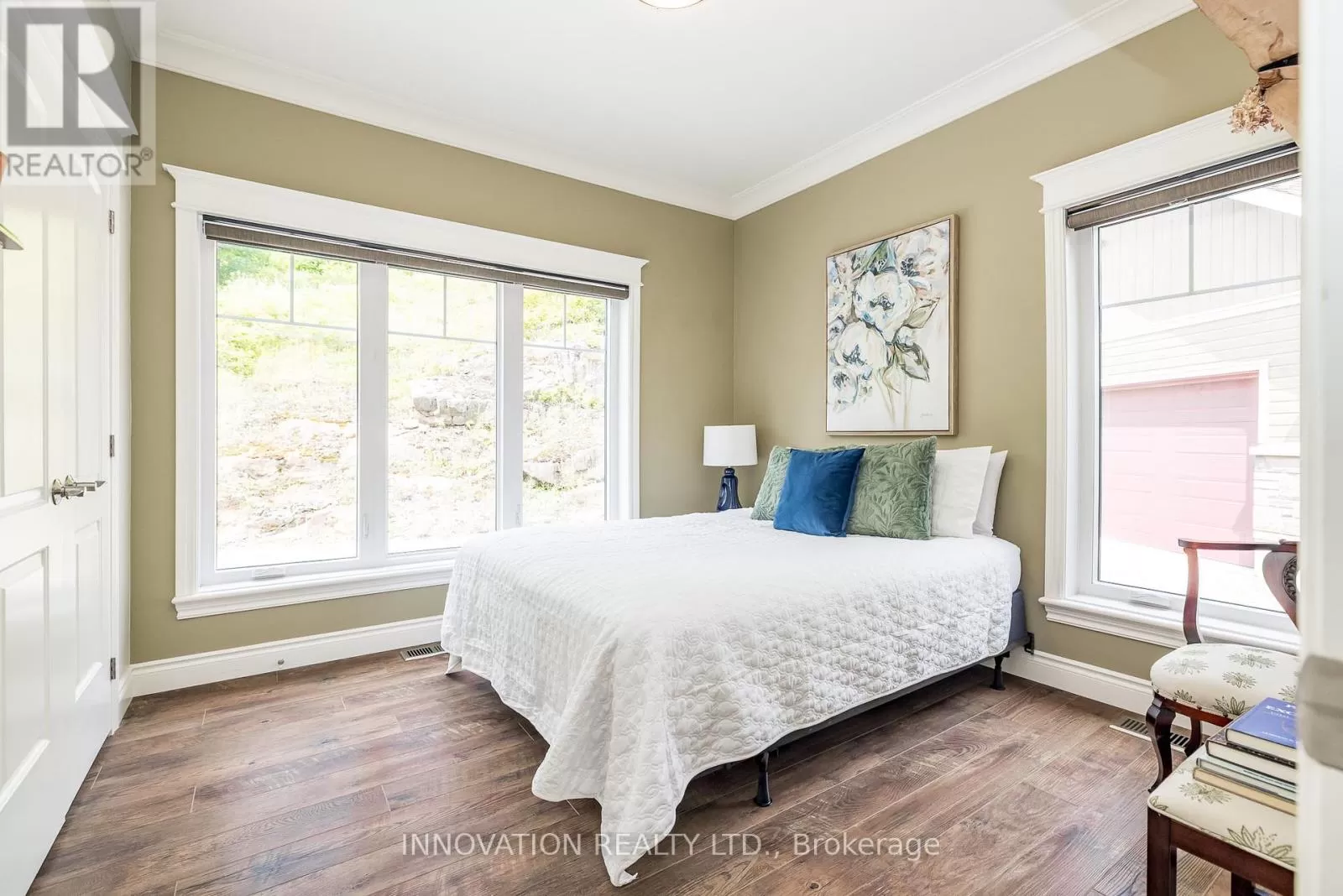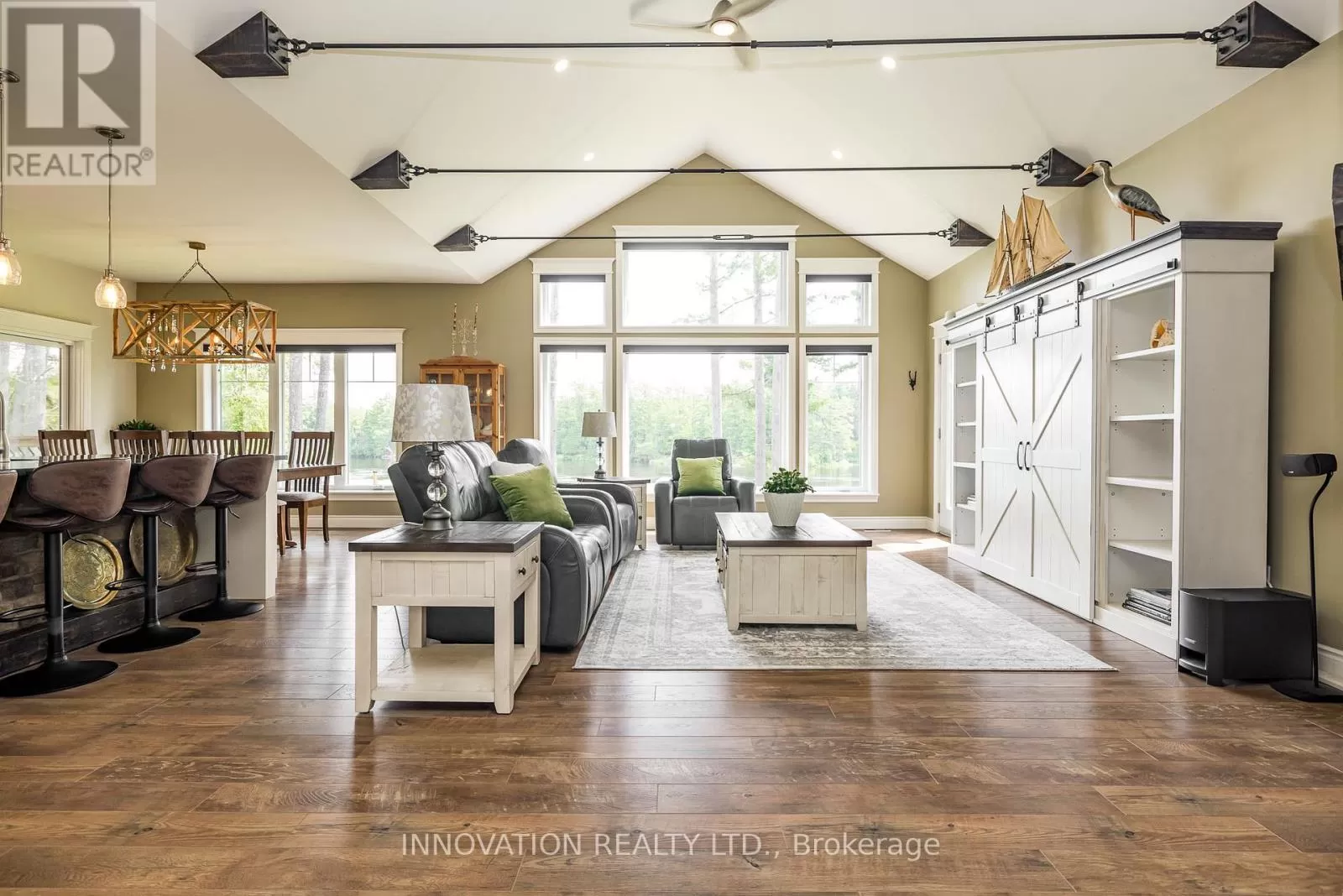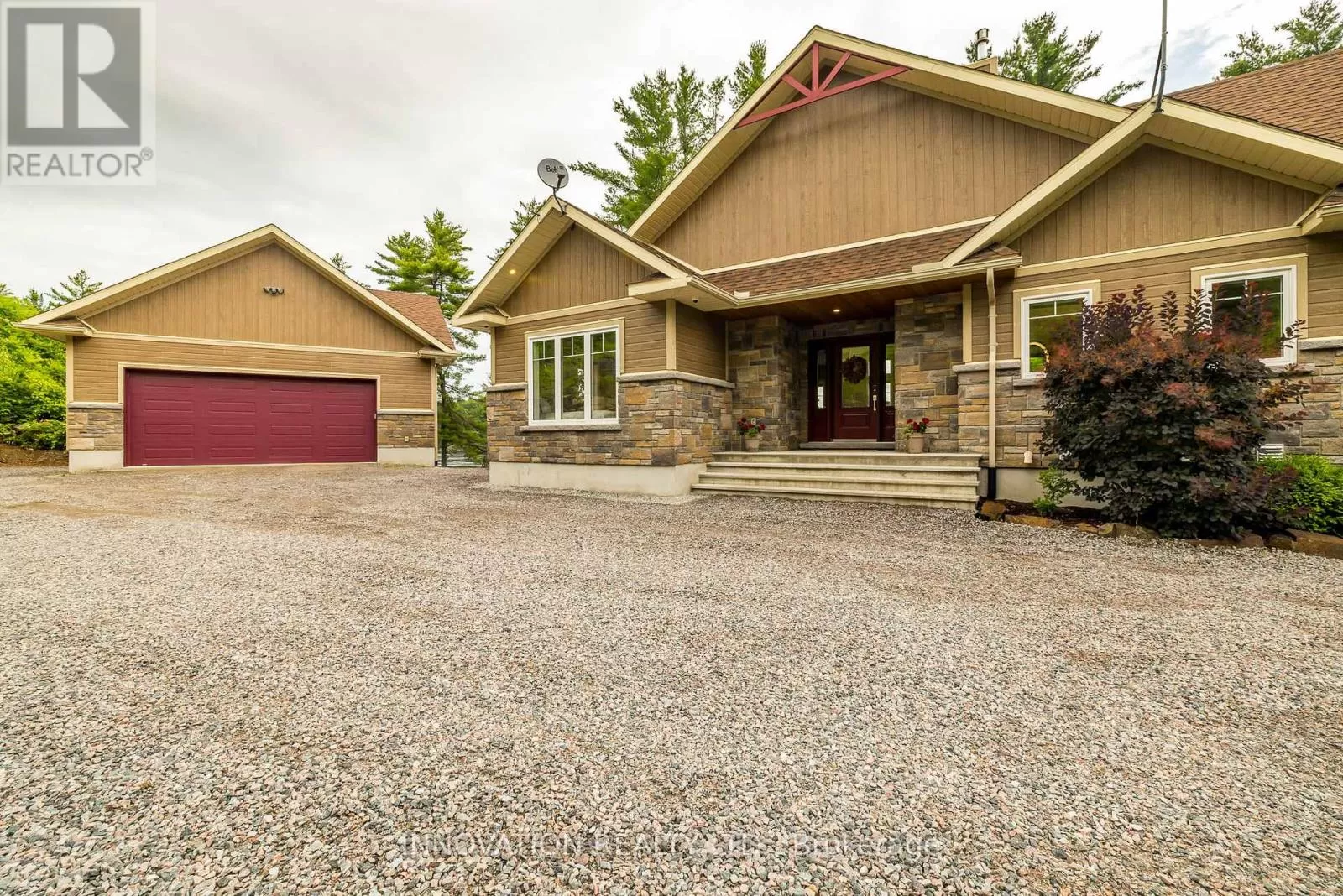 Cross Streets: Carriage Landing & Chenaux. ** Directions: Hwy 17 to Cobden, exit right onto Storyland, then right on Chenaux, Carriage Landing is on your Right (there is a sign for it) before the bridge to Quebec. Discover a rare and refined estate on the tranquil banks of the Ottawa River. This custom-built 2019 bungalow offers 4 bedrooms, 3 bathrooms, and over an acre of landscaped privacy surrounded by towering pines. Designed for both comfort and elegance, it's a retreat where luxury and nature meet. Inside, soaring vaulted ceilings and expansive windows frame panoramic river views, filling the open-concept living space with natural light. The chef's kitchen boasts high-end appliances, a generous island, a walk-in pantry, and a reverse osmosis system, ideal for everyday living or hosting with style. The primary suite is a true escape with serene river views, balcony access, and a spa-inspired ensuite featuring a glass shower, deep soaker tub, and dual vanities. A second main-floor bedroom adds convenience, while the walkout lower level offers radiant floor heating, two more bedrooms, a custom recreation space, and direct access to the backyard. Even the laundry room impresses with granite counters, built-in hampers, and soft-close cabinetry. Modern comforts include motorized blinds, programmable thermostats, central air, a Lifebreath air exchanger, and a full HD security system. A detached oversized heated garage provides ample storage and workshop space. Outdoors, the property transforms into a private oasis. Relax year-round in the screened spa lounge with hot tub, gather around the fieldstone fireplace, or head to the floating dock for boating, kayaking, and exceptional fishing, truly a fisherman's dream. Additional perks include an irrigation system, cedar kayak rack, and a charming hobby garage. Every detail has been thoughtfully crafted for ease and enjoyment. This is more than a home, it's a lifestyle. (id:27476)