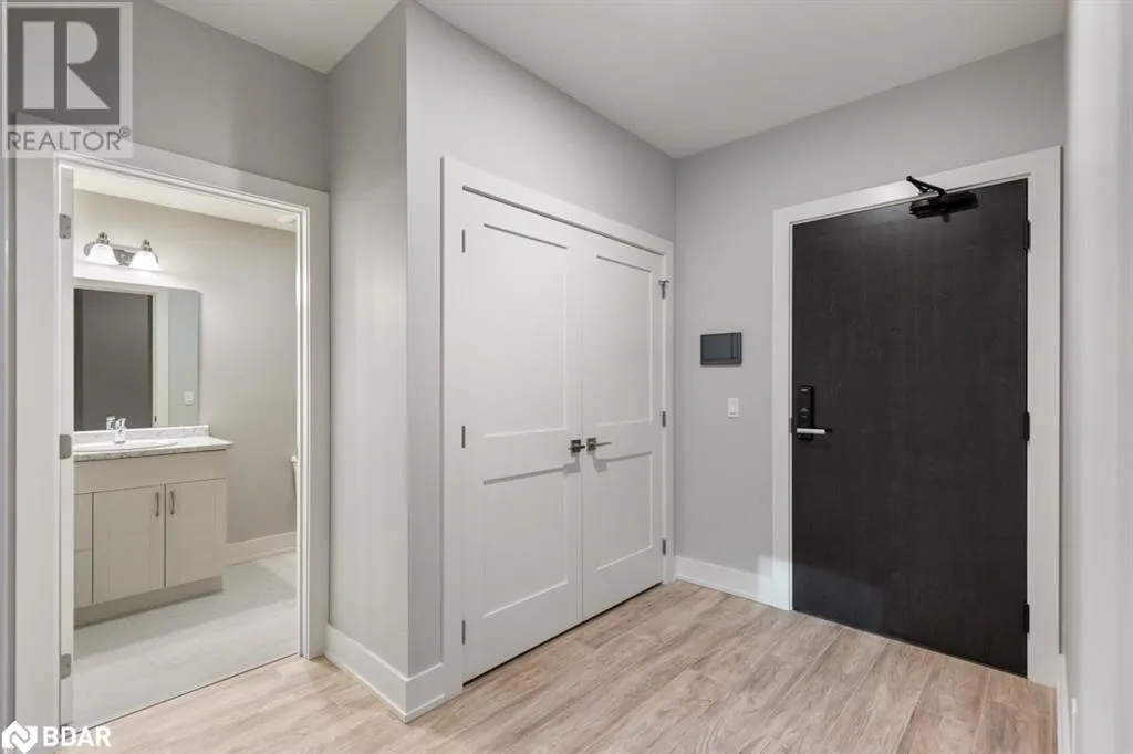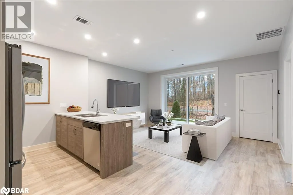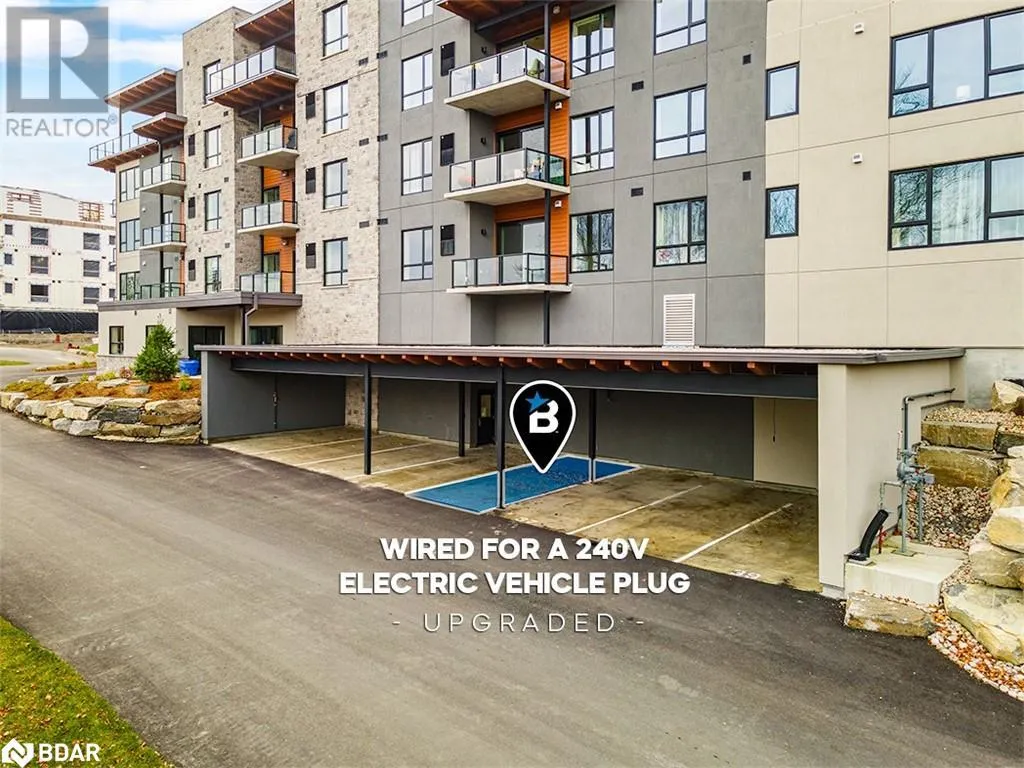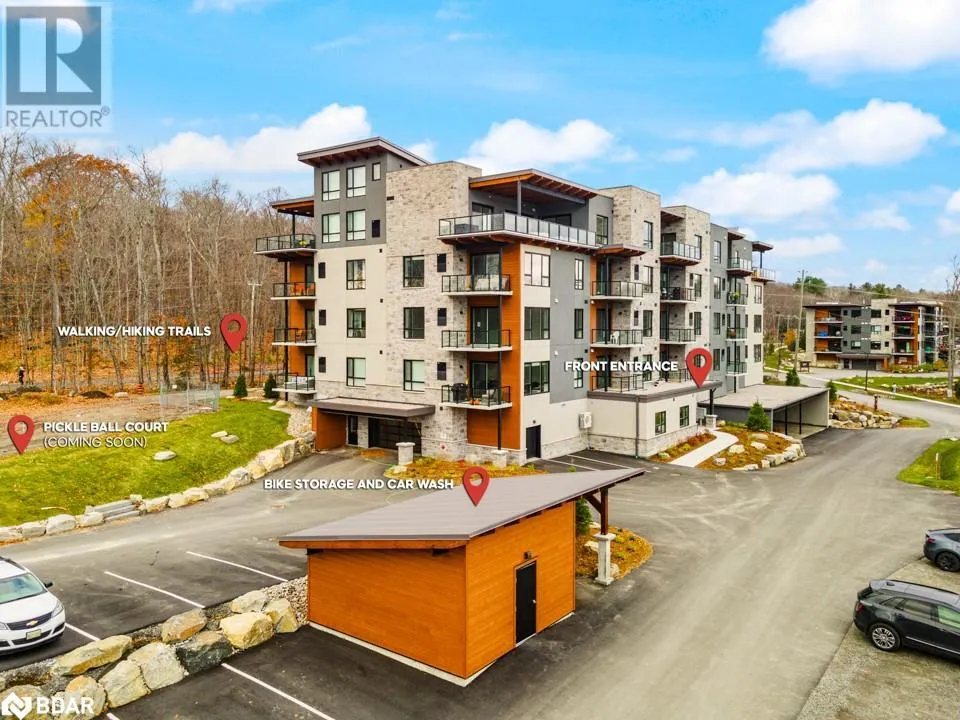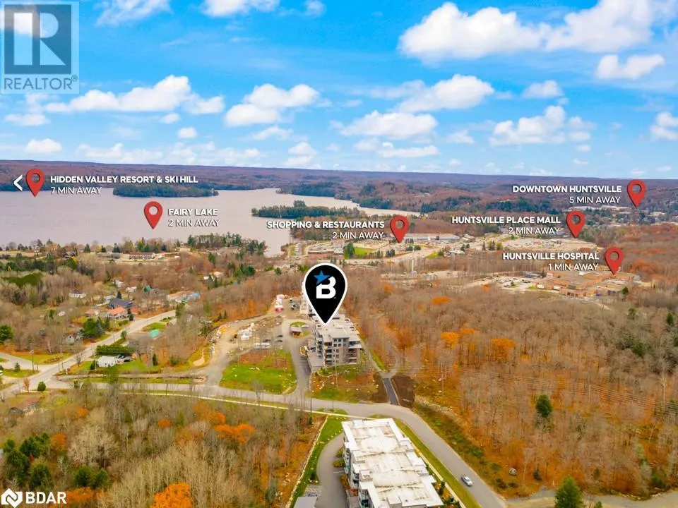 Hwy 60 E bound turn left onto Muskoka Rd 3 North then Left onto Campus Trail. Discover The Alexander at Campus Trail, where this first-floor condo shines with a spacious 1-bed plus den layout and 2 full baths across nearly 1000 sq ft. Modern luxury meets practical design, complete with high-end stainless steel kitchen appliances. Crafted with both style and practicality in mind, this modern sanctuary is kitted out with all the latest must-haves. You'll love the wide-open feel of the living, dining, and kitchen areas. Bask in the natural light from large windows, and step out to a serene patio. Embrace smart-home tech, keyless entry, and energy-efficient ICF construction. Charge your EV at your own spot prewired for a 240V plug, store gear in a heated locker, The Alexander doesn't skimp on amenities, with a social room perfect for hosting, and outdoor delights like a firepit lounge, a pickleball court and many nature trails. Located in Huntsville, you're amidst Muskoka's calm and town conveniences. Say goodbye to shoveling snow, and hello to your new lifestyle. You get the tranquility of Muskoka with the convenience of countless town amenities - all within easy reach, including a hospital for your peace of mind. So don't let this gem slip away - it's ready to be called your new home. Furniture is virtually staged. (id:27476)