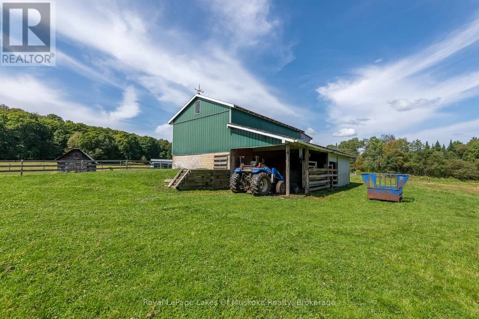 Hwy 11 to Stephenson Rd 12 to Domtar Rd (right turn) to left of North Lancelot to #214 SOP. Breathtaking picturesque hobby farm or working livestock farm, you choose. Previous owner had cows, horses, pigs and chickens and current owner had a small cattle farm...and of course a donkey. The creek on the property takes you into Siding Lake by canoe or kayak and there is a dock to sit by the water. This property boasts a spectacular waterfall in the spring and early summer. Trails throughout over your lovely little creek (new bridge in 2023). Square timber log home is 3 bedrooms, 2 bathrooms and walk out basement and an attached carport. If you are needing a larger home, there is plenty of room to add on. Outbuildings include hay barn 100' x 40', Super Structure Pack Barn 60' x 30' with cement floors, cement feed mangers from one end to the other, heated office inside with water supply and heated water bowl, little barn built in 1985, 2 horse stalls and a chicken coop 30' x 20', building for tractors etc. The historic little shed currently used as a wood shed has been shored up and created a lovely vista over your 25 acres of fenced pasture. This property is one of a kind and is located only 10 minutes from the vibrant and growing year round community of Huntsville and a few minutes drive to Highway 11 access. Owners heat primarily with wood but there is a newer forced air propane furnace, fiber optics to be installed in spring of 2025, and all of the amenities you crave close by. The home and all outbuildings are nestled well back from this quiet year round road and school bus route. There is a showing video, iguide virtual walkthrough and an attached link showing the beautiful waterfall on the property. (id:27476)