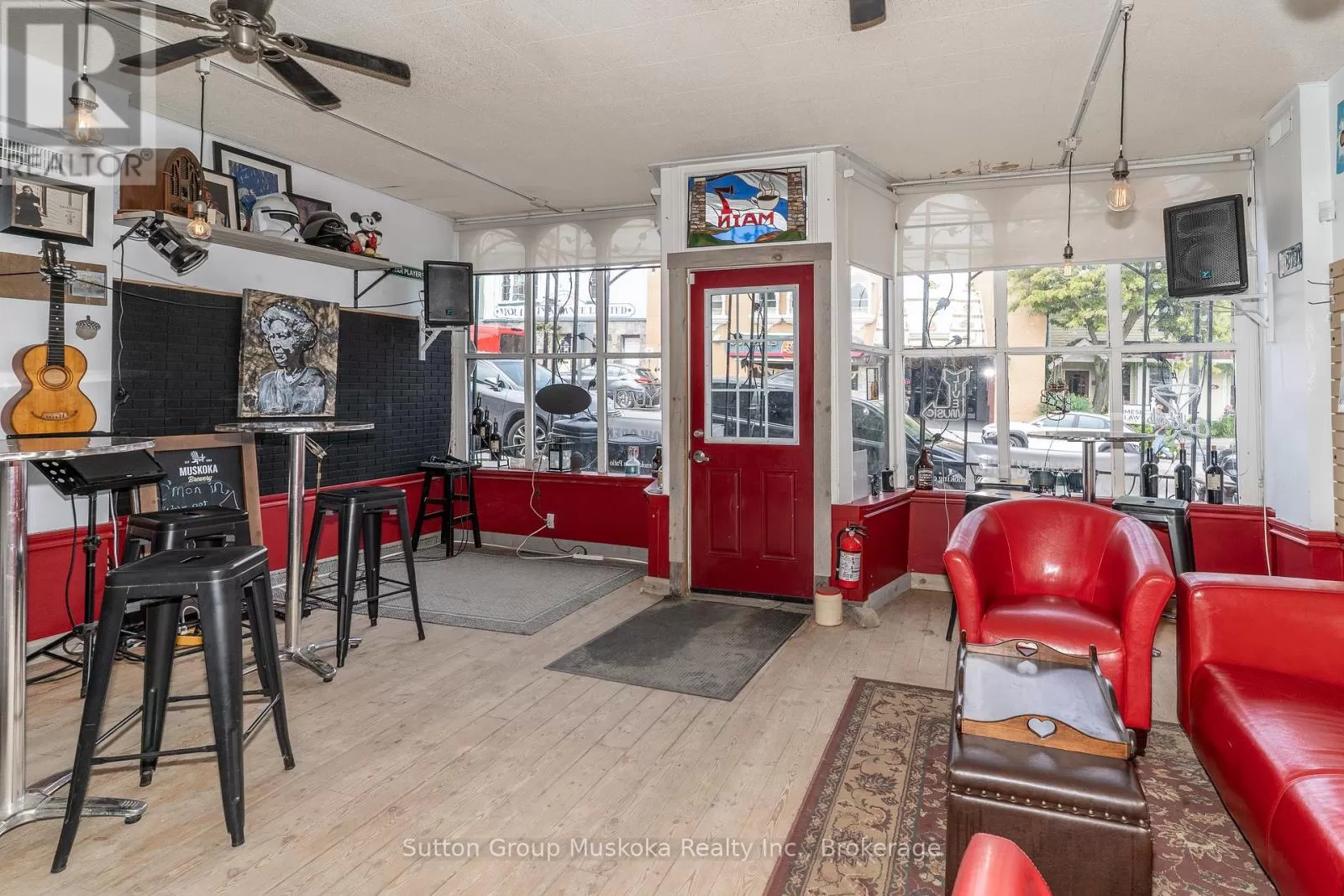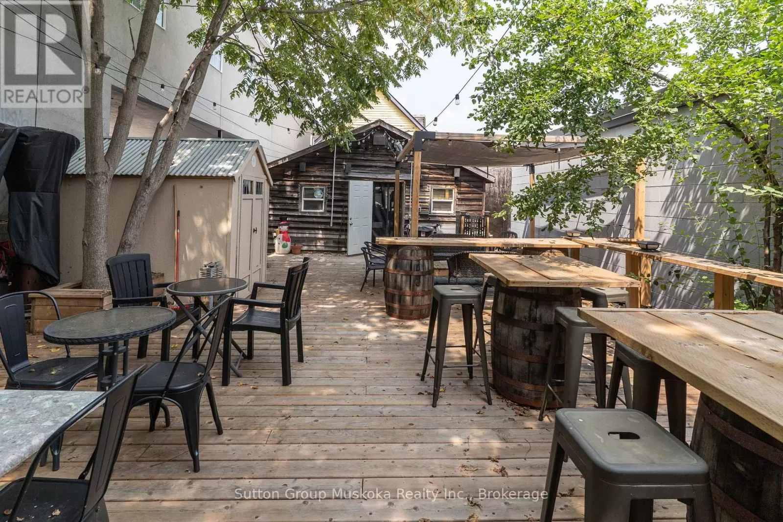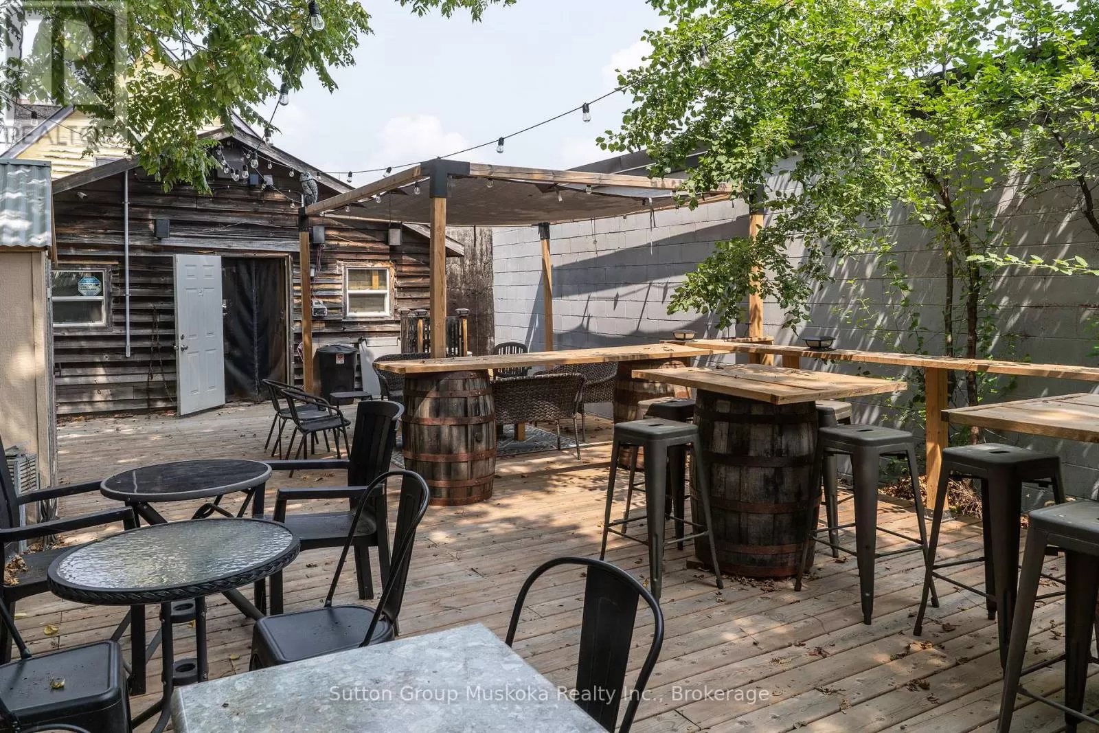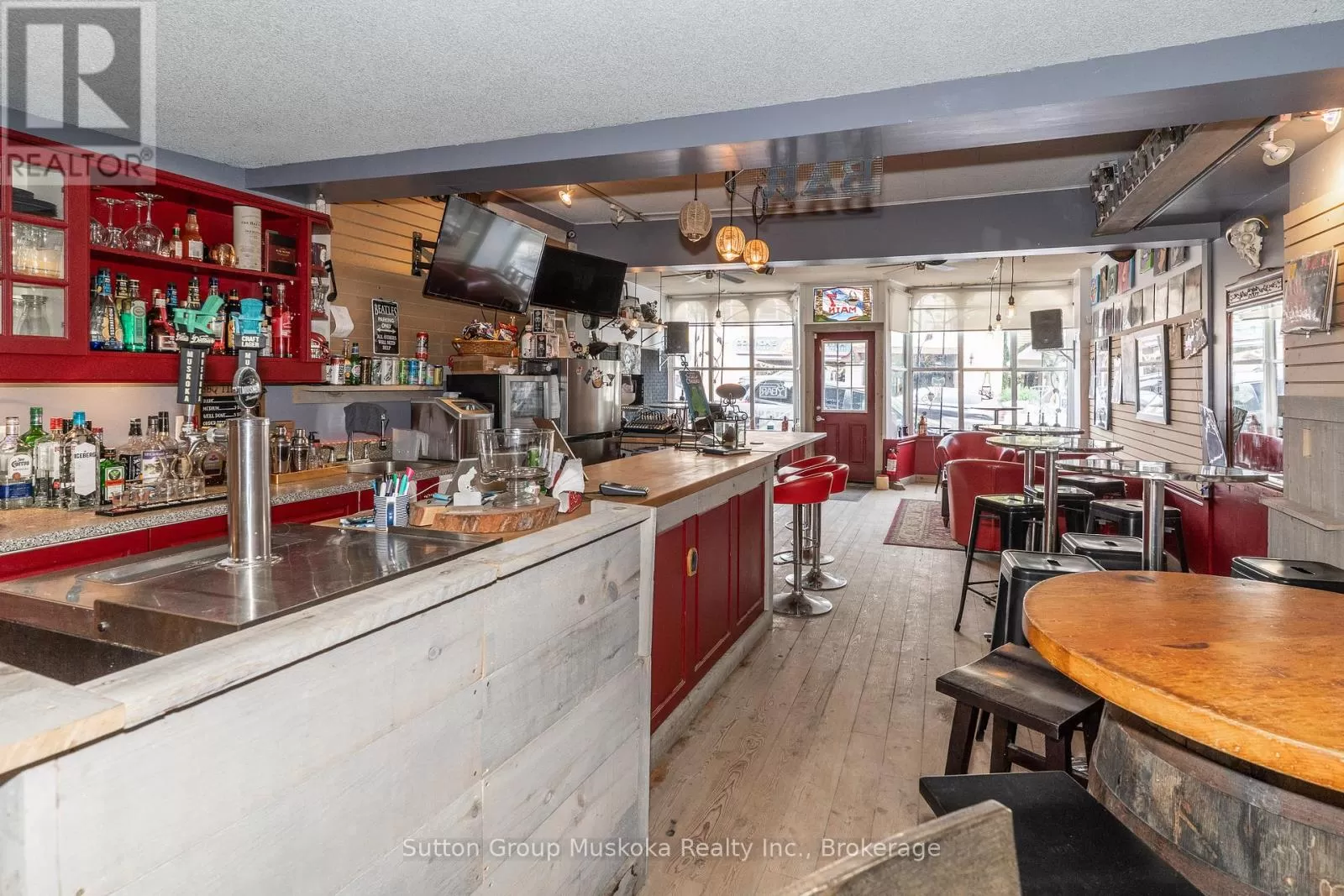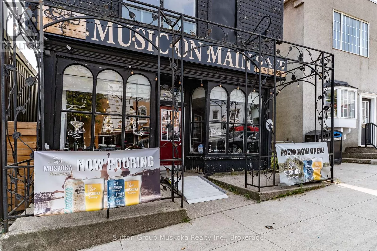 Cross Streets: Centre and Main. ** Directions: Aspdin exit via highway 11 north to Main Street. What a wonderful opportunity to own a piece of Historical Downtown Huntsville. This Main Street location in Muskoka, offers a great space both inside and outside to accommodate your ideas of what you want to bring to the town. Currently used as a live music venue / bar , the casual sitting atmosphere leads to an awesome patio. So many ways to utilize this open outside area. Current liquor license does cover outside tables at the entry , the main level and the patio. Also features a kitchen to provide some food for your patrons . The upstairs is a great space for the nights you work late with its own bedroom and bathroom . This building is zoned CBD. Please see documents for allowable uses. The Seller is willing to leave almost ALL contents for the next Buyer to start right back up! (id:27476)