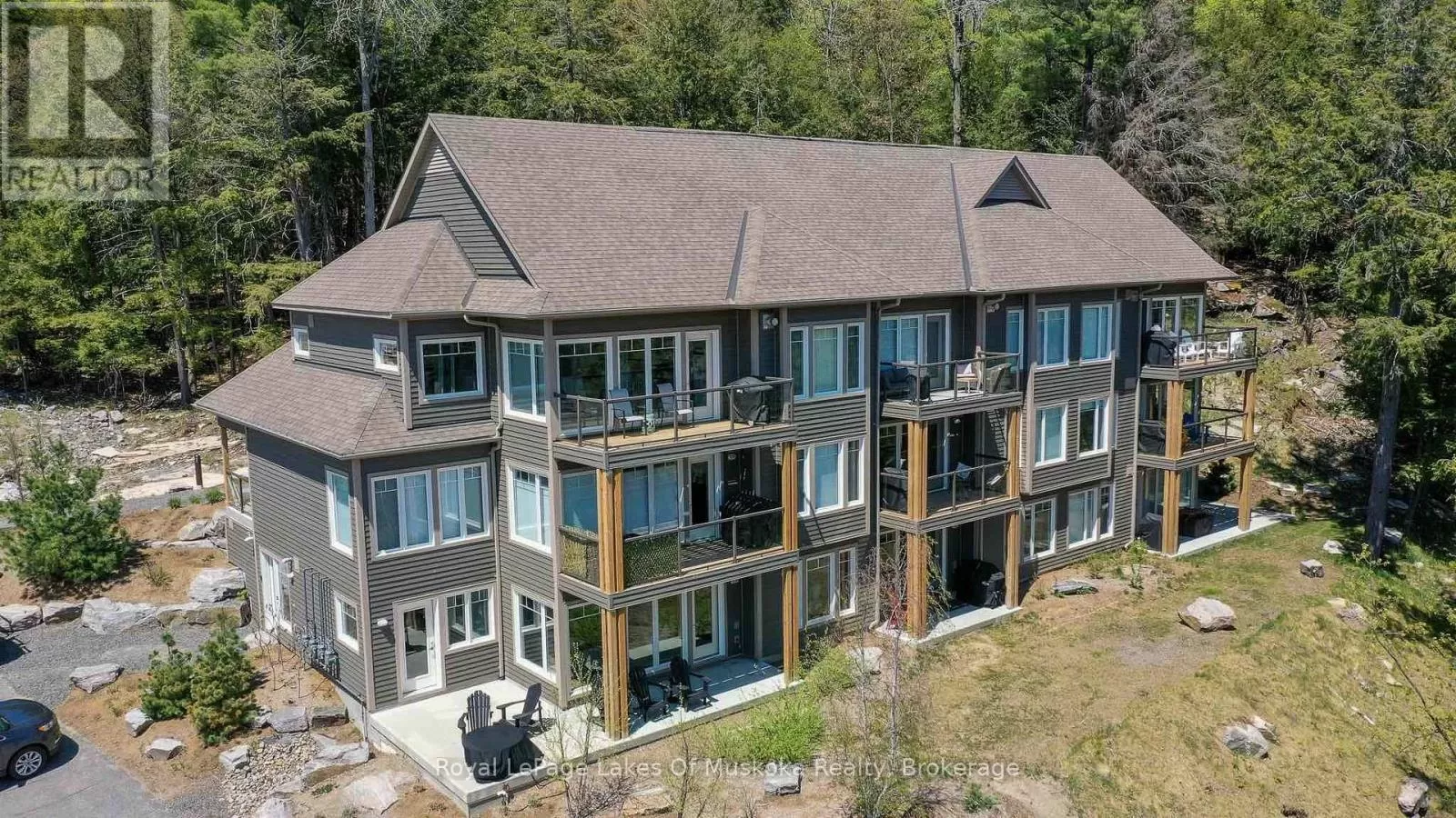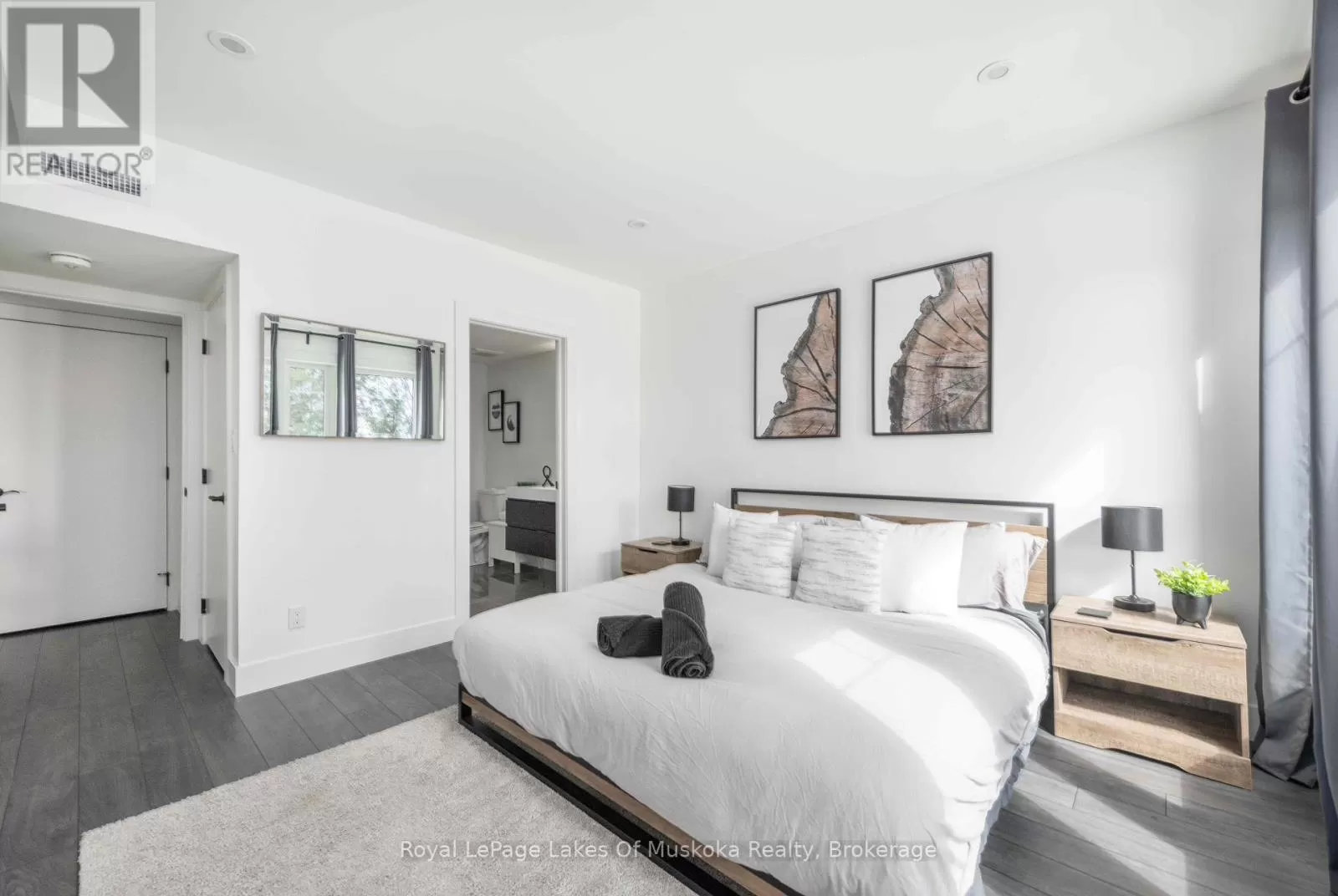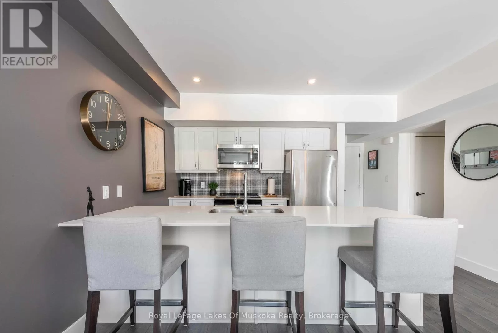 Cross Streets: Tree Tops Lane/Deerhurst Drive. ** Directions: HWY 60 To Canal Road to Deerhurst dr to Tree Tops (number 3). Amazing opportunity to own this beautiful condo close to Deerhurst, built in 2019 and nestled in a private quiet enclave in the heart of all the finest recreational amenities Huntsville has to offer. Just down the street from Hidden Valley Highlands ski hill where you are now a member! Members enjoy a private members lounge at the ski hill and a 300' + sandy beachfront with a beach volley ball court on beautiful Peninsula Lake - part of Huntsville's 4 lake system. You are also now a member of Mark O'Meara a prestigious ClubLink platinum level golf course. Enjoy an incredible new lifestyle in your like new 2 bedroom 2 bathroom condo with upscale finishes. Perfect for pets with high end vinyl flooring and a walk out to your ground level patio facing a wall of trees. So many bonuses- affordable condo fees, in floor heating, gas fireplace, glass shower in ensuite, open concept, designer kitchen, ample storage, and in-suite laundry. Sunlit and thoughtfully designed. Spacious for your relaxation and entertaining apres ski, golf, beach day or just enjoying the sun on your patio while you barbecue. Just across the road from Deerhurst but on a dead end quiet street so you can walk to all the neighbouring restaurants, beach, ski hill, mountain bike trails, hiking trails and more! Also could be a fantastic low maintenance option for an alternative cottage and cover some costs by renting out part time. (id:27476)