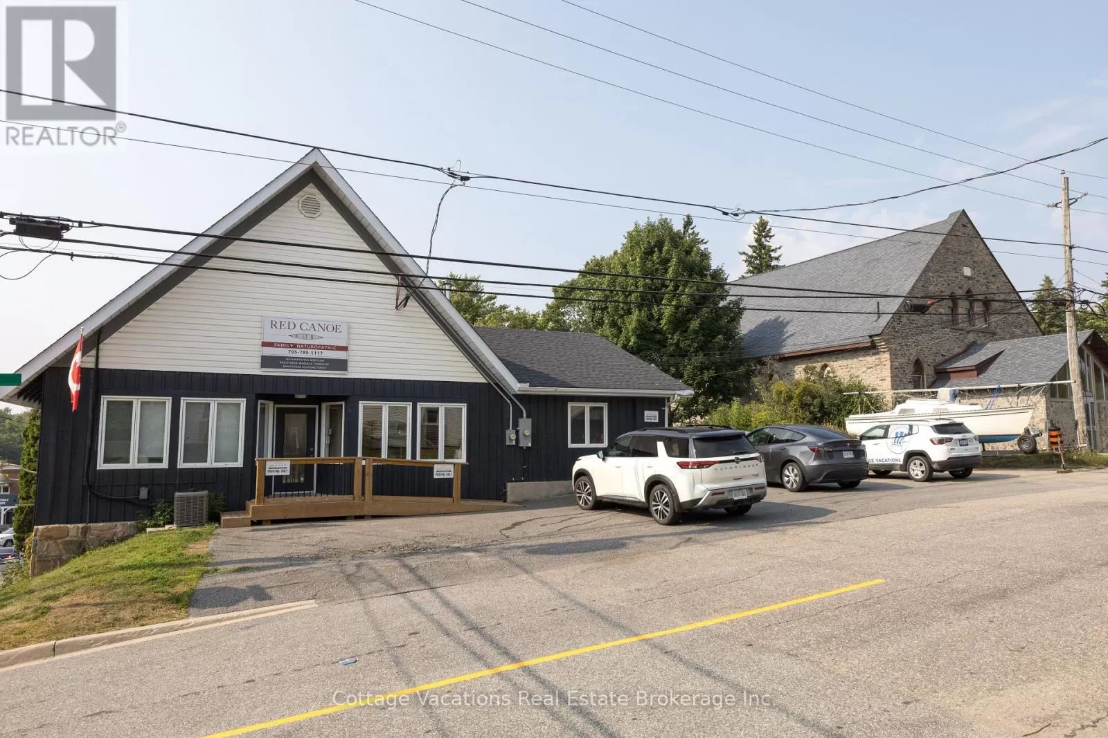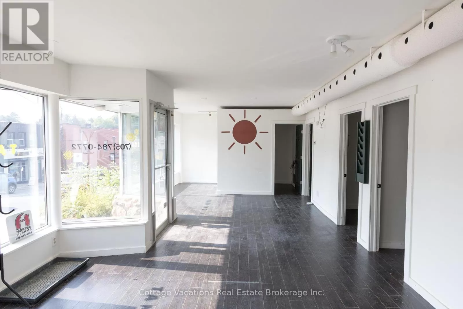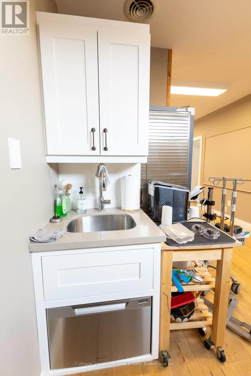 Cross Streets: King William. ** Directions: King William to Brunel Road. Ideal location for a commercial building featuring two available lease spaces. One is occupied by a triple-A long-term tenant, while the other is vacant and ready for leasing. This prime location in downtown Huntsville is just steps away from Main Street, the Muskoka River, the renowned swing bridge, and the lively community that Huntsville provides.The upper level boasts a spacious 1,500 square foot bright office area with walk-in entry. It is equipped with fibre internet and phone connectivity. The space includes enhancements such as Caesarstone countertops in the kitchen and bathroom, solid engineered hardwood flooring, and robust interior doors. Additionally, there is a granite entryway and a wood-burning fireplace. The layout comprises three private, roomy offices, a large open workspace, a kitchen area, a bathroom with a shower, and two storage rooms. The renovations are quite impressive. The lower level features a wall of windows providing excellent street front visibility, situated near the intersection of Main Street and Brunel, with a rare and commanding 33 feet of street-level frontage on Brunel Road. The 920 square foot area is designed with three offices, an open common area with a reception space, and one restroom. This property is located in the Central Business District with C7 zoning, allowing for a wide range of permitted uses, and includes six dedicated parking spots. (id:27476)
