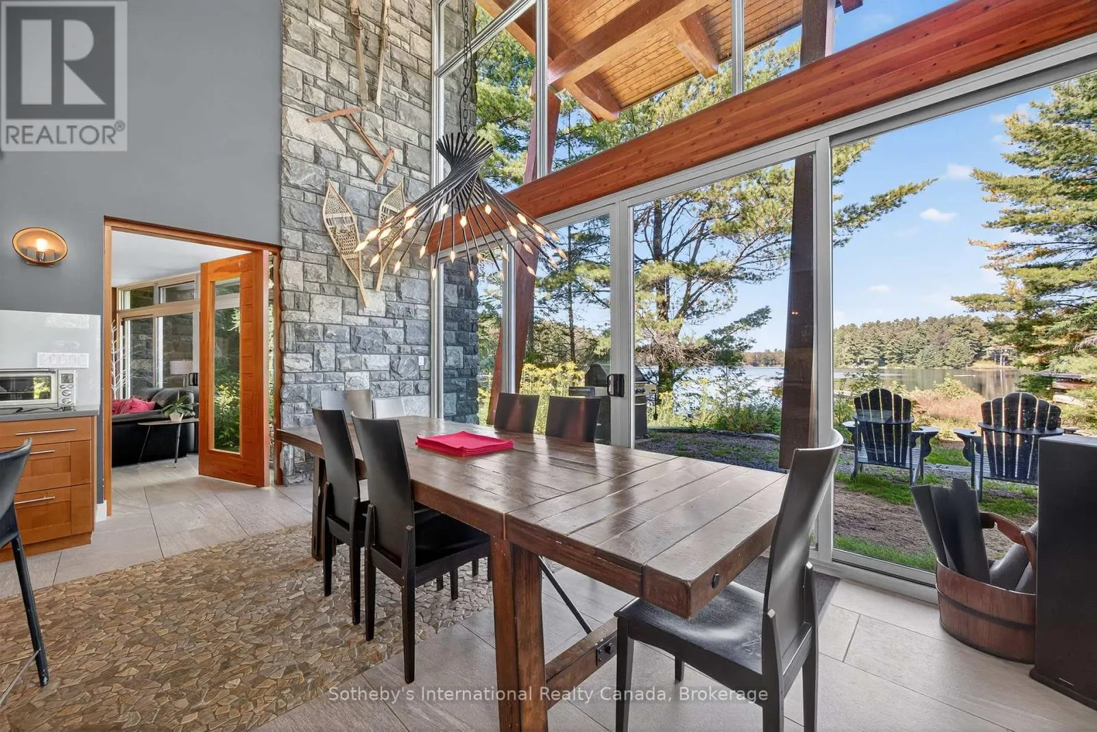 Cross Streets: West Browns Rd & Otter Lake Rd. ** Directions: Brunel Road, West Browns Road, Otter Lake Road. Welcome to "Serenity," an architect-designed, turn-key, four-season retreat on the crystal waters of Otter Lake. This extraordinary property rests on an 11.93-acre point with 1,771 ft of natural shoreline, offering unmatched privacy, breathtaking views, & a deep connection to Muskoka's rugged beauty, all just 10 mins from Huntsville's amenities. Approach via a winding granite lane that opens to the entrance courtyard, where the home's sweeping rooflines, hand-cut granite, & walls of glass reveal glimpses of the lake & Serenity Bay. Inside, the soaring 25-ft great room makes a dramatic impression with floor-to-ceiling windows, a granite Rumford fireplace, & a wall of glass that opens to the lakeside terrace. The open-concept chef's kitchen, dining room, & great room are designed for effortless entertaining. The kitchen showcases a 12-ft Brazilian granite island, gas cooktop, & stainless steel appliances. Host unforgettable dinners surrounded by nature, with sliding doors that extend the living space to a covered terrace, perfect for lakeside dining, sunrise coffee, or fireside evenings under the stars. A separate family room provides a cozy retreat, ideal for games, TV, or curling up with a book, with sliding doors that invite the outdoors in year-round. The primary wing is a private sanctuary featuring a Scandinavian wood stove, walk-through closet, motorized blinds, & a spa-like ensuite with pebble wall & rain shower. Two additional lake-view bedrooms & a stylish 4-pc bath complete the west wing. Upstairs, a loft offers a fourth bedroom with an ensuite, overlooks the great room with sweeping lake views, & includes space for ping-pong or yoga. A cedar path leads to the shoreline, offering multiple seating areas, a steel fire pit set on the rock, a dock for swimming, diving, or tranquil paddles. Hear the call of the loon as it drifts across mirror-like waters, capturing the essence of a true Muskoka escape on this motor-free lake. (id:27476)