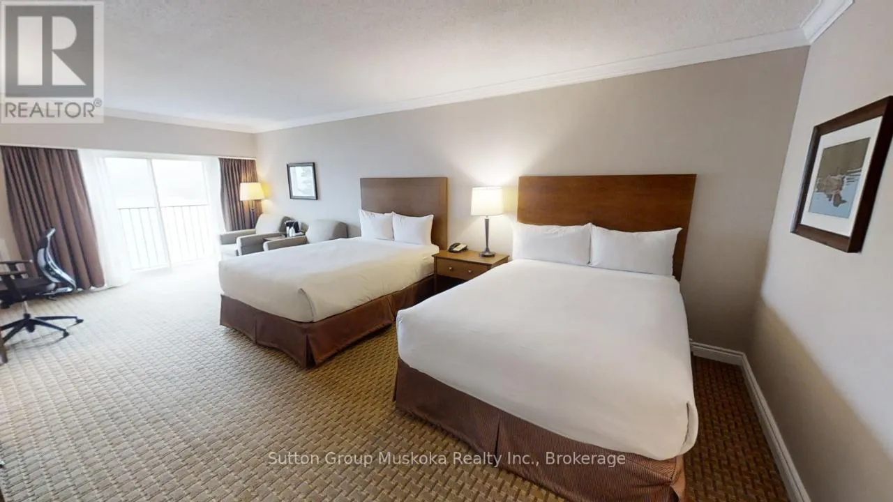 Cross Streets: Hwy 60 & Canal. ** Directions: Highway 60 to Canal Road to Deerhurst Resort. DEERHURST RESORT - BAYSHORE COMPLEX LOOKING OVER PENINSULA LAKE - Top floor waterfront condominium located in the Bayshore complex at Muskoka's premier resort - Deerhurst Resort. This waterfront unit offers a great view over Peninsula Lake and is steps away from the beach. Inside the unit, you will find a large great room with two queen beds, a sitting area, a flat-screen TV, a bar fridge, and a full bathroom. The unit is on the rental program, with the resort providing revenue to the unit owner. For 2024, the owners' share of revenue was $14,360. The monthly condo fee is $563.30 plus HST (HST should be recoverable), and the annual property tax of $1597. Enjoy the resort lifestyle - golf, beach, pools, tennis, trails, restaurants, and more. HST is applicable to the sale of this unit and is recoverable. The unit is a large hotel room; all Bayshore units must be kept on the rental program with the resort. Great unit - Great location and an amazing resort! Live, vacation and invest in Canada! (id:27476)