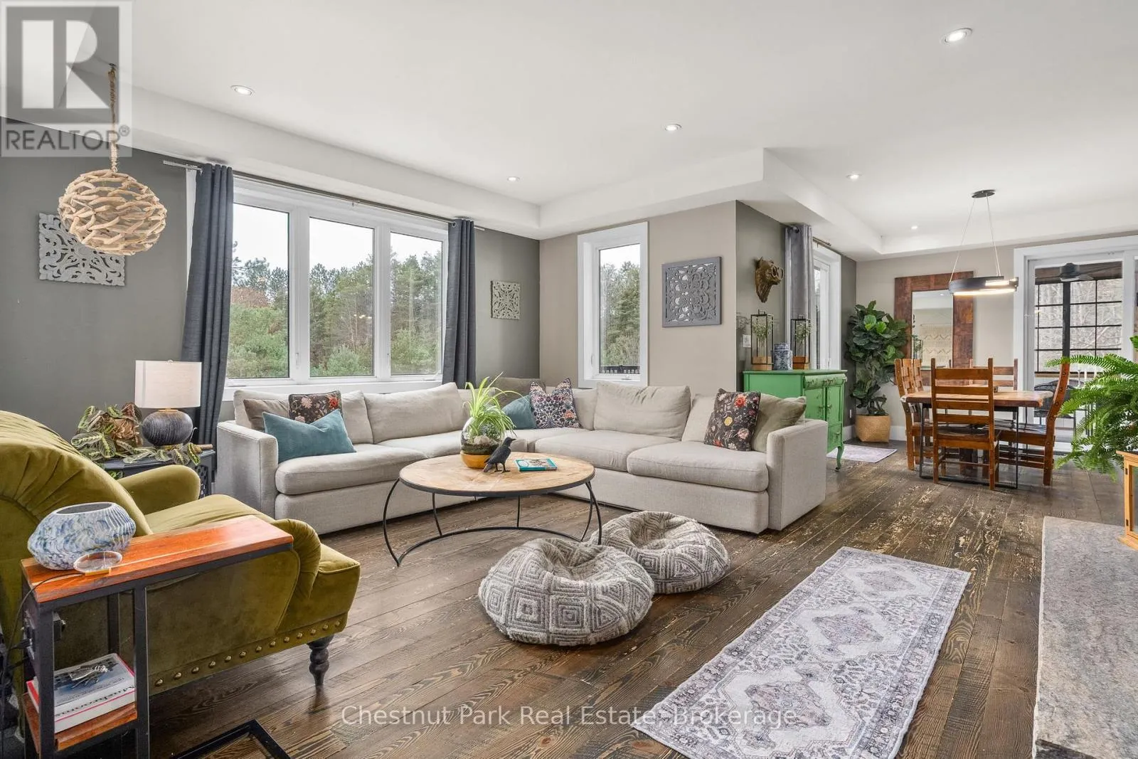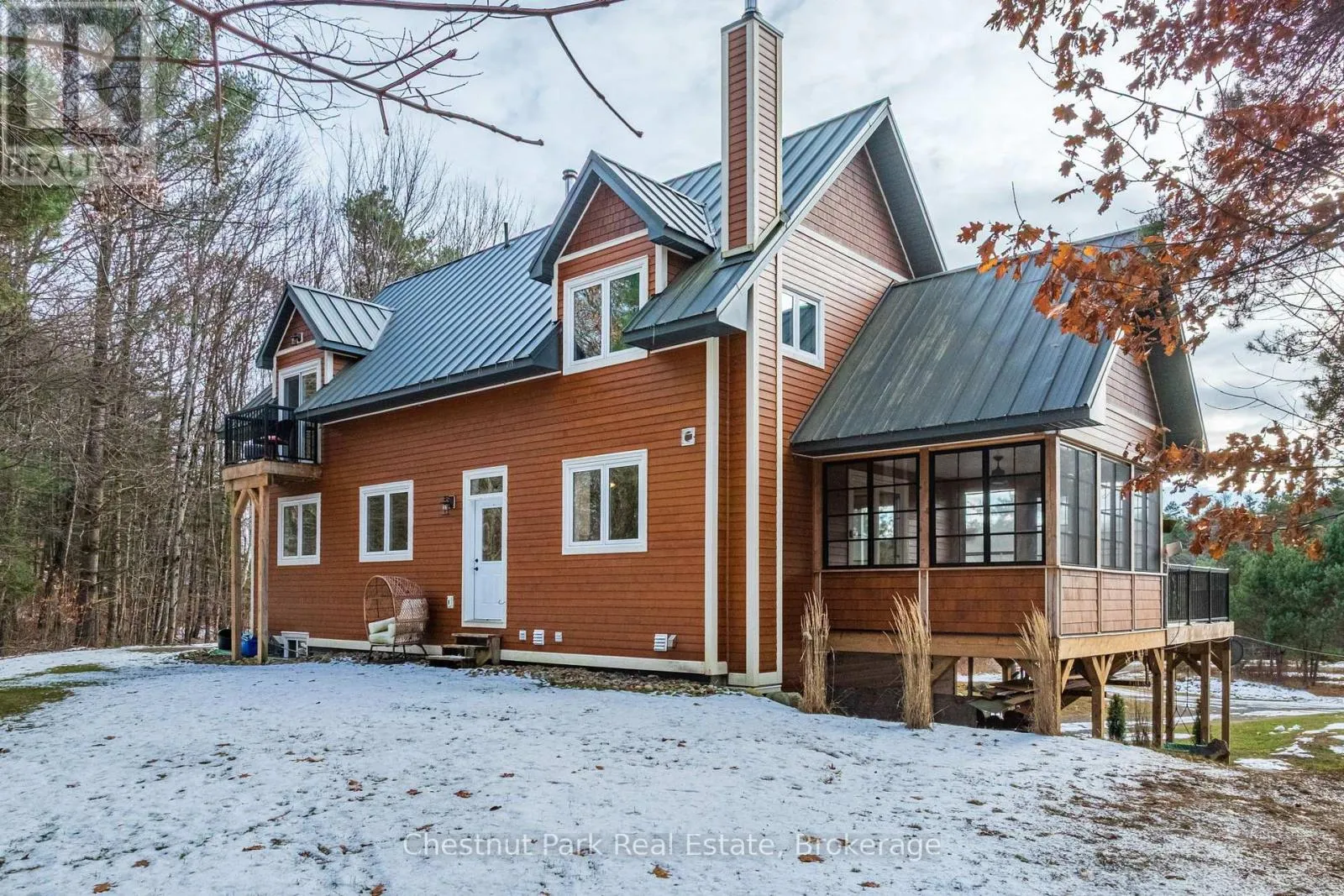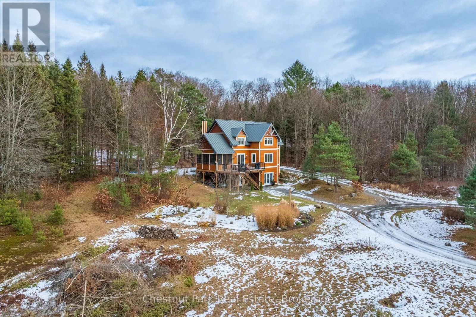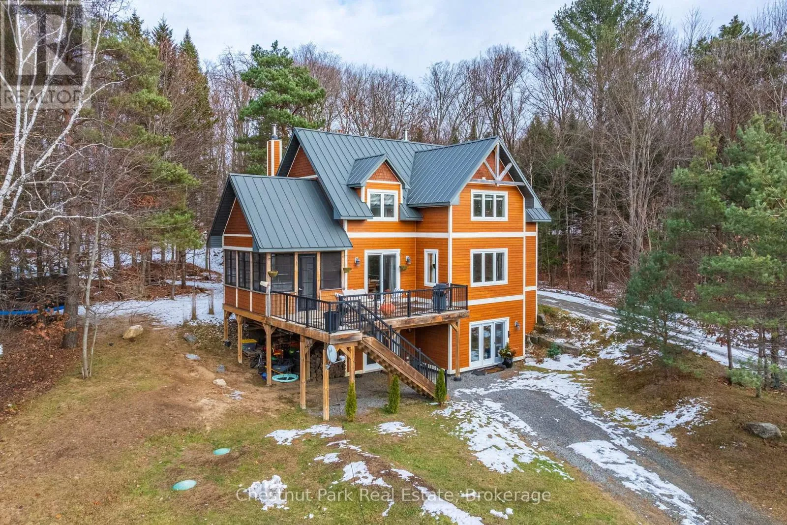 Cross Streets: Aspdin Road. ** Directions: Hwy 11 to Aspdin Road to Etwell Drive. #1555. SOP. Welcome to 1555 Etwell Road, Huntsville-an exceptional custom-built 2,988 sq. ft. retreat set on 90 acres, where refined upgrades meet a relaxed, kick-your-shoes-off Muskoka lifestyle. Built in 2017 with remarkable attention to detail, this home features an inviting open-concept main floor with a beautifully upgraded kitchen, spacious dining area, and a warm great room anchored by a stunning river rock wood-burning fireplace. Large windows frame serene views of rolling fields and the forest beyond, enhancing the home's peaceful ambiance. A charming three-season Muskoka room extends the living space and is perfect for morning coffee or evening gatherings. Upstairs, the primary bedroom feels like a private sanctuary with its own balcony and cozy dormer sitting area, while the spa-inspired 5-piece bathroom offers double sinks, a glass shower, and a luxurious soaker tub. A second generously sized bedroom completes this level. The ground floor features a professionally renovated (2022) walkout basement that adds stylish, functional living space. The spacious recreation room is ideal for a games area, home gym, or family space, and two additional bedrooms, one with a walkout to the yard and provides excellent versatility for guests or extended family. A circular driveway framed by mature trees sets the tone for the tranquility and natural beauty surrounding the home. The 90-acre property includes hardwood and softwood forests, open meadows, a dramatic exposed granite ridge, and miles of trails to explore-perfect for outdoor enthusiasts and abundant wildlife. Whether you're seeking a year-round residence or a peaceful Muskoka getaway with room to roam, this exceptional property offers high-end comfort, relaxed charm, and convenient access to Huntsville's shops, schools, and amenities. A rare offering that truly must be experienced to be appreciated. (id:27476)