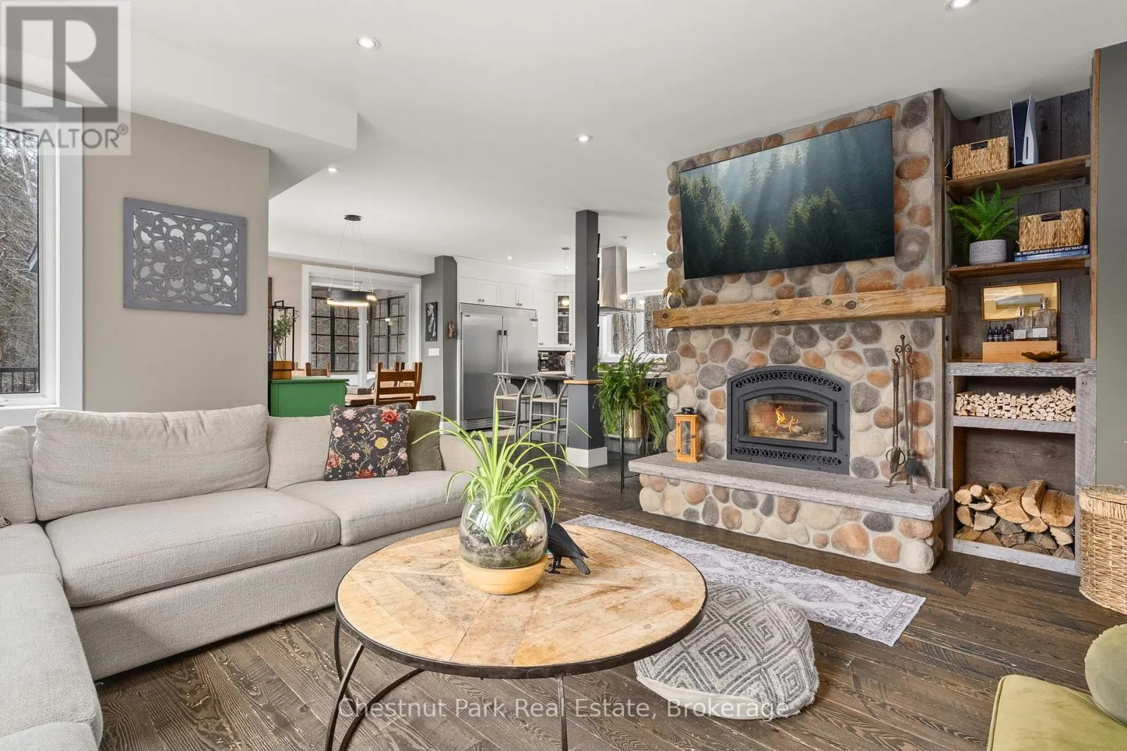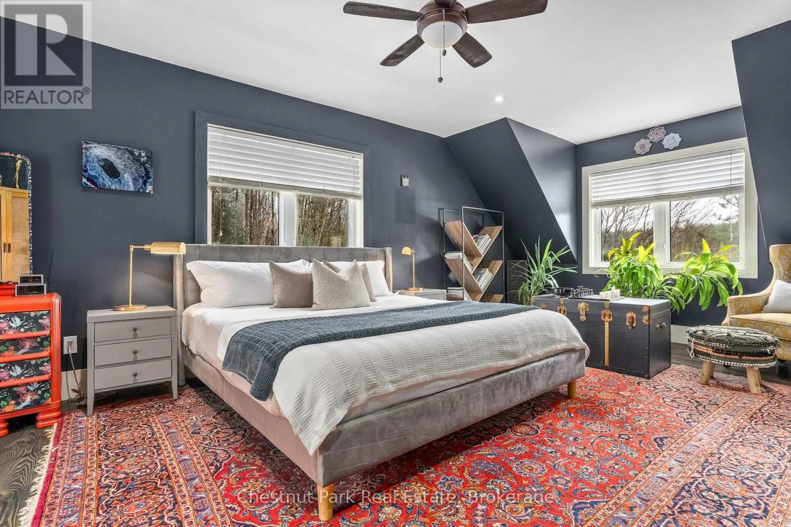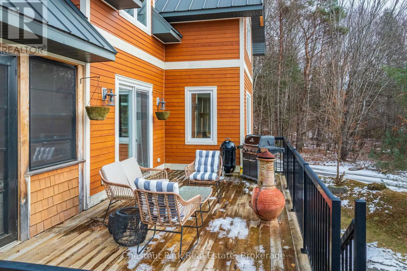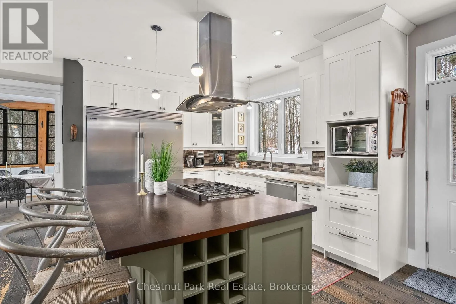 Cross Streets: Aspdin Road. ** Directions: Hwy 11 to Aspdin Road to Etwell Drive. #1555. SOP. Welcome to 1555 Etwell Road, Huntsville-an exceptional custom-built 2,988 sq. ft. retreat set on 90 acres, where refined upgrades meet a relaxed, kick-your-shoes-off Muskoka lifestyle. Built in 2017 with remarkable attention to detail, this home features an inviting open-concept main floor with a beautifully upgraded kitchen, spacious dining area, and a warm great room anchored by a stunning river rock wood-burning fireplace. Large windows frame serene views of rolling fields and the forest beyond, enhancing the home's peaceful ambiance. A charming three-season Muskoka room extends the living space and is perfect for morning coffee or evening gatherings. Upstairs, the primary bedroom feels like a private sanctuary with its own balcony and cozy dormer sitting area, while the spa-inspired 5-piece bathroom offers double sinks, a glass shower, and a luxurious soaker tub. A second generously sized bedroom completes this level. The ground floor features a professionally renovated (2022) walkout basement that adds stylish, functional living space. The spacious recreation room is ideal for a games area, home gym, or family space, and two additional bedrooms, one with a walkout to the yard and provides excellent versatility for guests or extended family. A circular driveway framed by mature trees sets the tone for the tranquility and natural beauty surrounding the home. The 90-acre property includes hardwood and softwood forests, open meadows, a dramatic exposed granite ridge, and miles of trails to explore-perfect for outdoor enthusiasts and abundant wildlife. Whether you're seeking a year-round residence or a peaceful Muskoka getaway with room to roam, this exceptional property offers high-end comfort, relaxed charm, and convenient access to Huntsville's shops, schools, and amenities. A rare offering that truly must be experienced to be appreciated. (id:27476)
