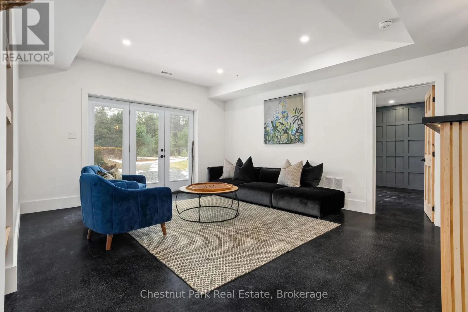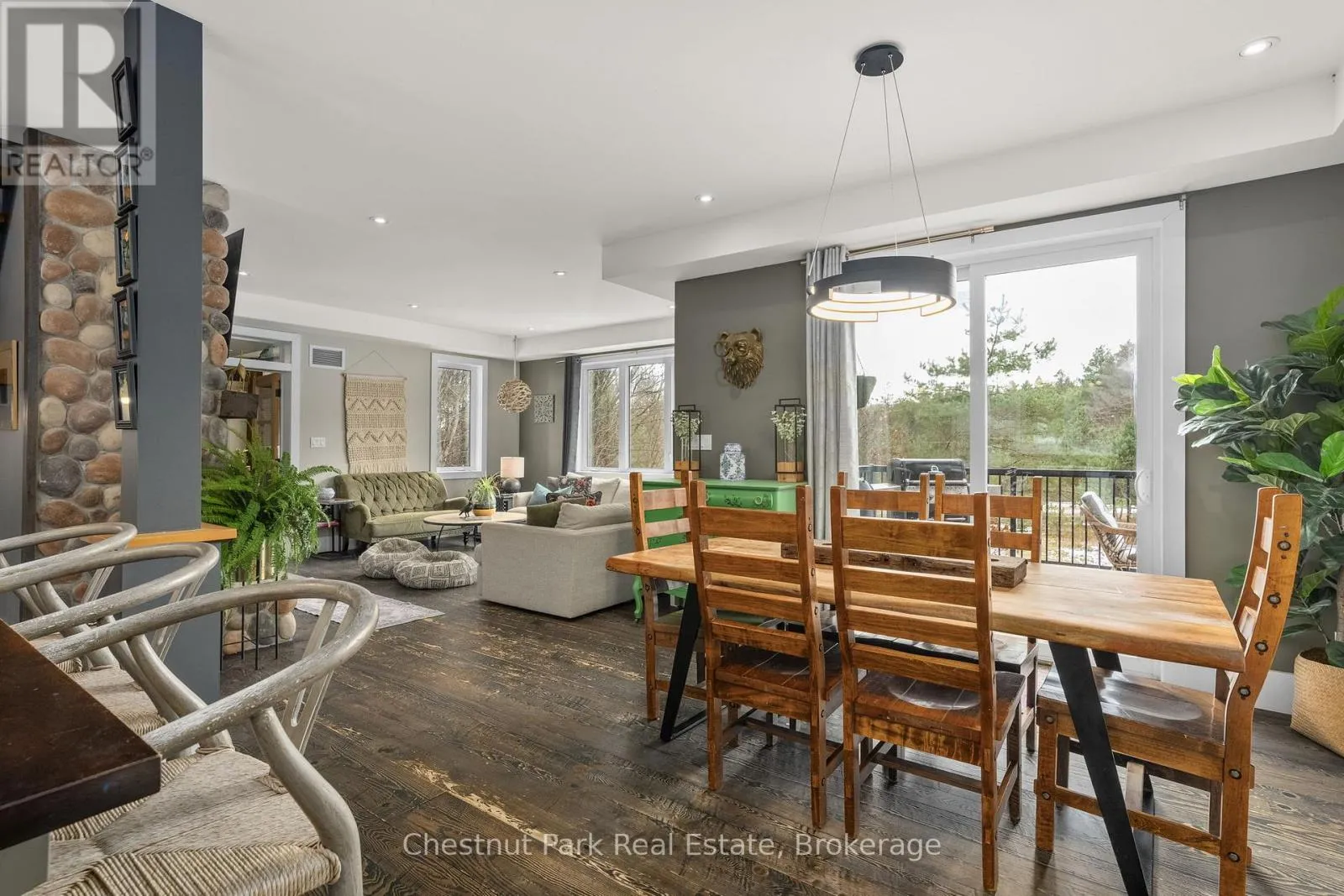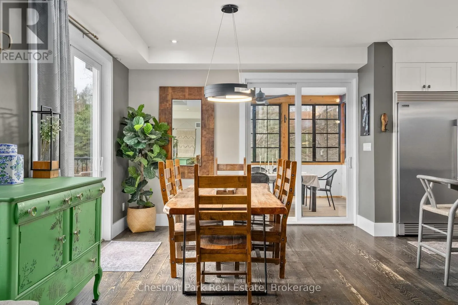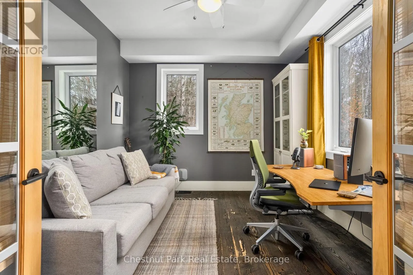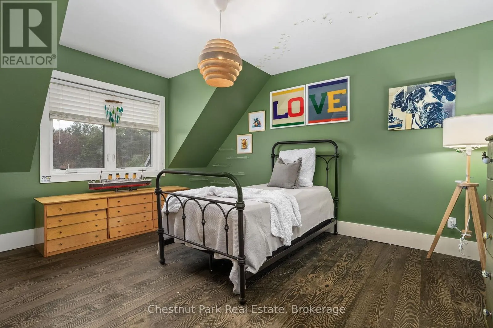 Cross Streets: Aspdin Road. ** Directions: Hwy 11 to Aspdin Road to Etwell Drive. #1555. SOP. Welcome to 1555 Etwell Road, Huntsville-an exceptional custom-built 2,988 sq. ft. retreat set on 90 acres, where refined upgrades meet a relaxed, kick-your-shoes-off Muskoka lifestyle. Built in 2017 with remarkable attention to detail, this home features an inviting open-concept main floor with a beautifully upgraded kitchen, spacious dining area, and a warm great room anchored by a stunning river rock wood-burning fireplace. Large windows frame serene views of rolling fields and the forest beyond, enhancing the home's peaceful ambiance. A charming three-season Muskoka room extends the living space and is perfect for morning coffee or evening gatherings. Upstairs, the primary bedroom feels like a private sanctuary with its own balcony and cozy dormer sitting area, while the spa-inspired 5-piece bathroom offers double sinks, a glass shower, and a luxurious soaker tub. A second generously sized bedroom completes this level. The ground floor features a professionally renovated (2022) walkout basement that adds stylish, functional living space. The spacious recreation room is ideal for a games area, home gym, or family space, and two additional bedrooms, one with a walkout to the yard and provides excellent versatility for guests or extended family. A circular driveway framed by mature trees sets the tone for the tranquility and natural beauty surrounding the home. The 90-acre property includes hardwood and softwood forests, open meadows, a dramatic exposed granite ridge, and miles of trails to explore-perfect for outdoor enthusiasts and abundant wildlife. Whether you're seeking a year-round residence or a peaceful Muskoka getaway with room to roam, this exceptional property offers high-end comfort, relaxed charm, and convenient access to Huntsville's shops, schools, and amenities. A rare offering that truly must be experienced to be appreciated. (id:27476)