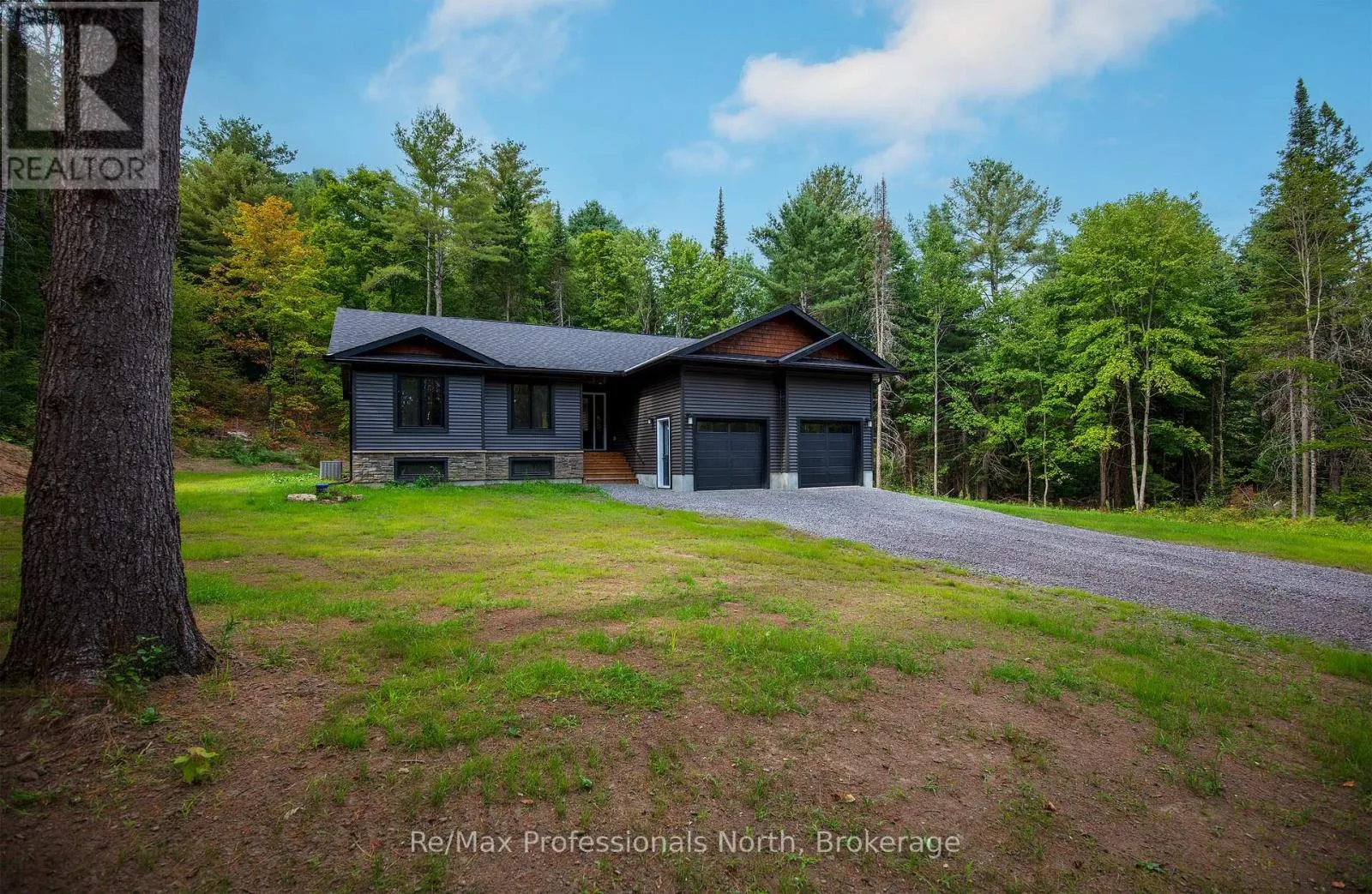 Cross Streets: HWY 11 North or south to Stephenson 2 Road west, Fallow to signs on property on right side after hill. ** Directions: HWY 11 North or south to Stephenson 2 Road west, Follow to signs on property on right side after hill. New 3-bedroom 2-bathroom home completed. Large 10-acre private, fully treed country lot between Huntsville and Bracebridge. The land has a stream with wetlands and snowmobile trails close by. It is a short drive to Mary Lake beach. Interior pictures and a 3D tour are of a recently completed home similar to the new build with the same floor plan and similar finishings. The house has a large 20x12 deck with a metal railing, a high-efficiency propane furnace, an HRV system, and Central Air conditioning. Cathedral ceiling in the great room. Open concept layout featuring wide plank engineered hardwood throughout. Full LED lighting, feature walls and stained false beams throughout, a Designer custom kitchen, and quartz countertops. Large entrance foyer and main floor laundry. Oversized molding on both casing and baseboard. Electric fireplace in the living room. Two bathrooms, a 4-piece and 3-piece Primary bedroom ensuite. ICF foundation Tarion warranty. The basement is drywalled with electric outlets and has a second electrical pony panel for easy basement finishing. See plans (attached) for exact measurements. Very close access to Highway 11 and 15 minutes to Bracebridge and Huntsville. (id:27476)