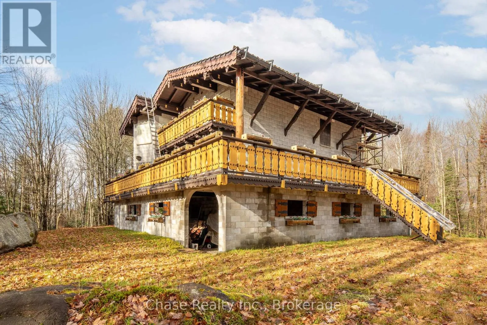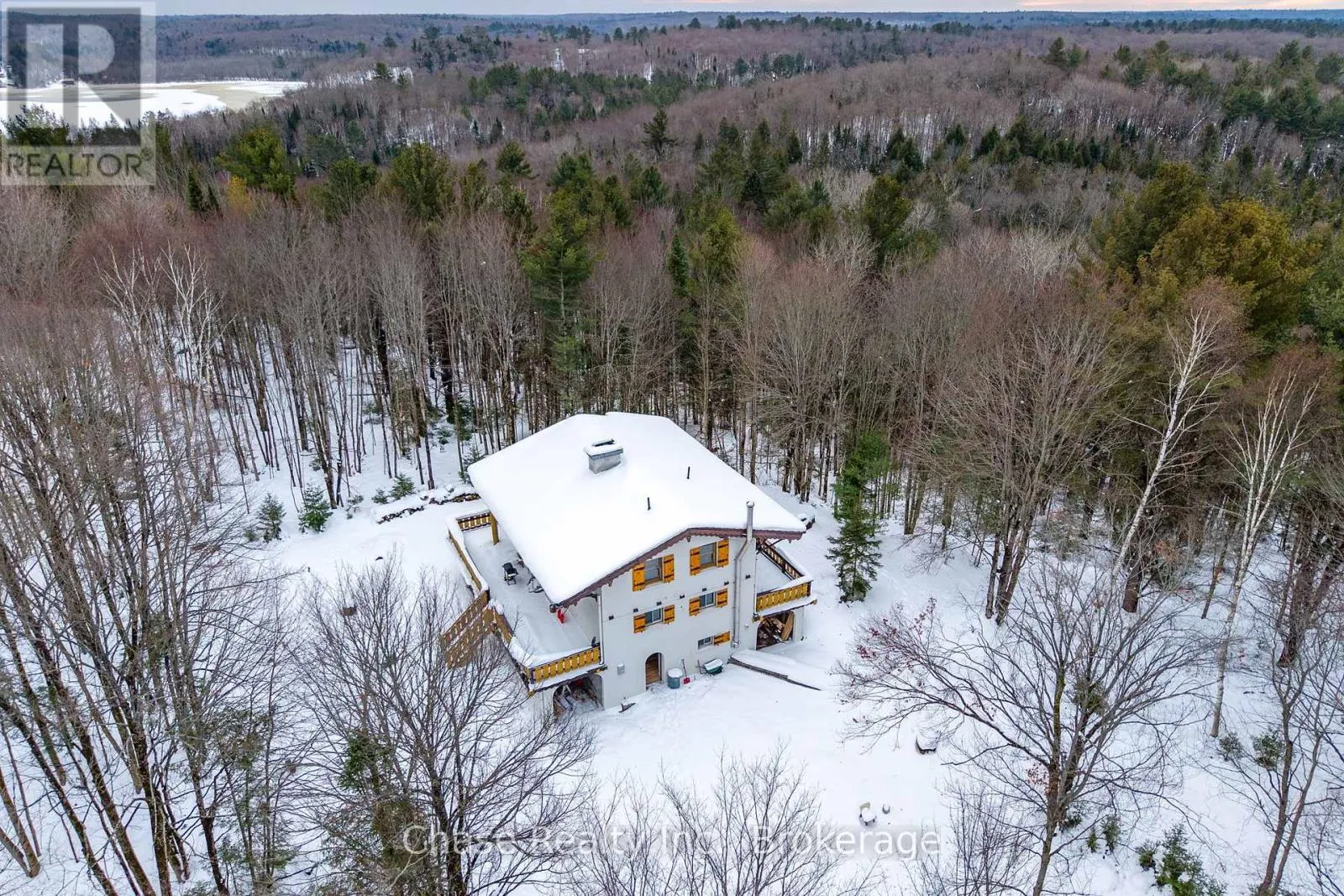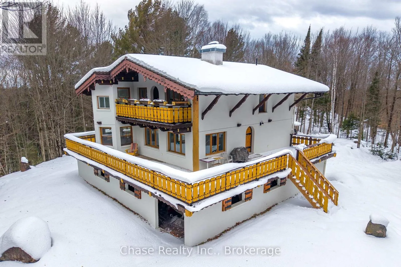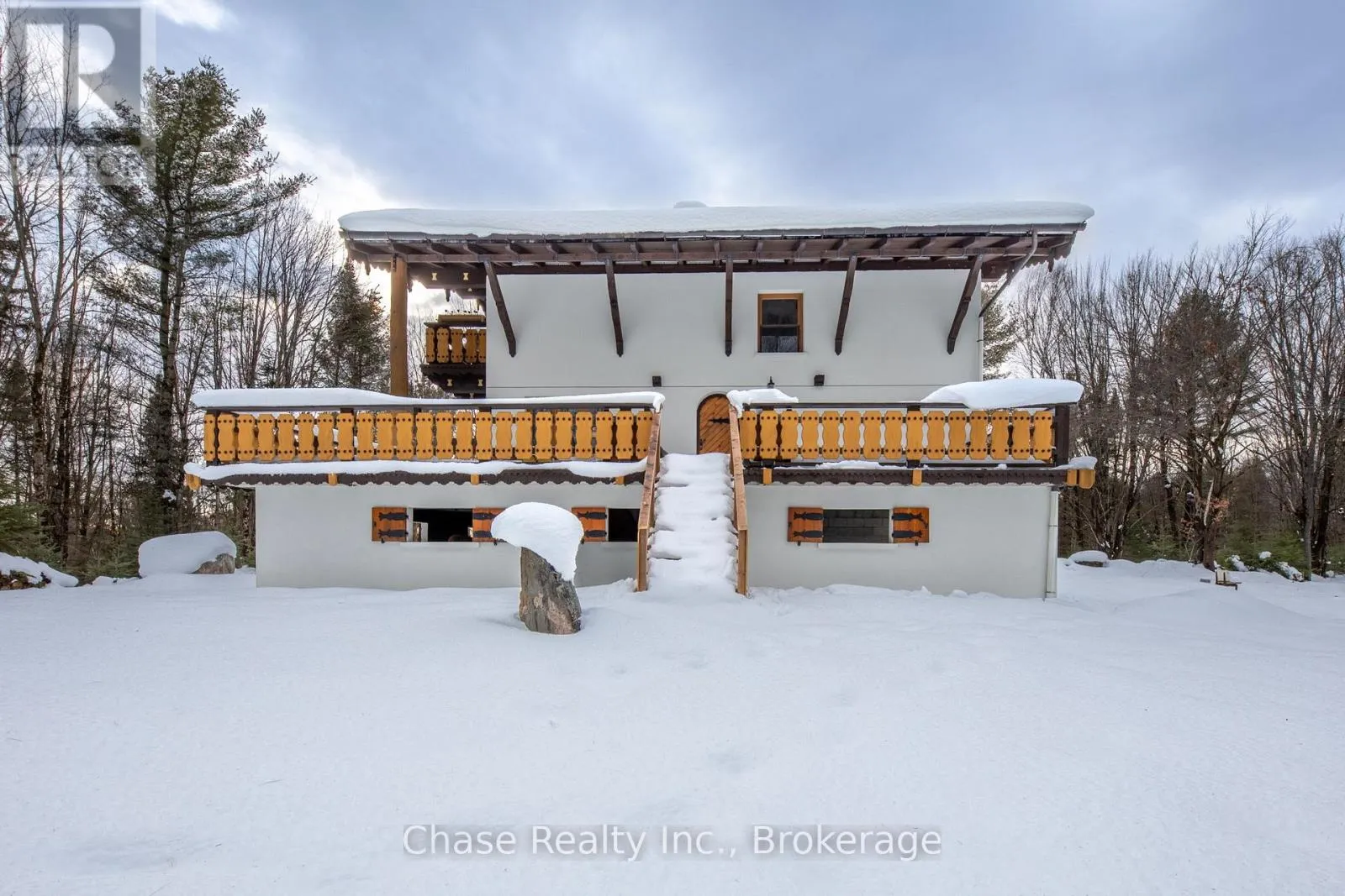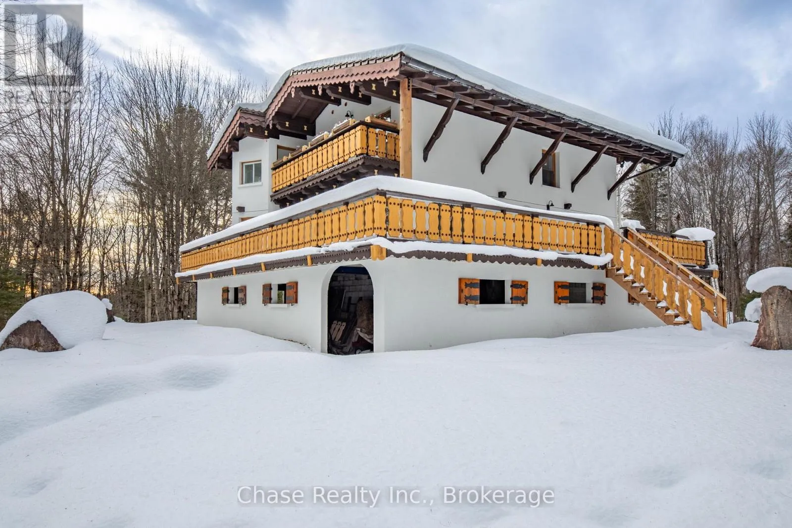 Cross Streets: Stephenson Rd. ** Directions: From Hwy 11 N, turn right onto Stephenson Rd 1 E, destination on your left. Situated on a private hill in Port Sydney, this European-inspired residence is a refined luxury retreat immersed in nature. Set on a 5-acre lot, surrounded by mature trees and frequent wildlife sightings, the property offers exceptional privacy and tranquility-your own secluded sanctuary.Offering approximately 3,000 sq. ft. of impeccably crafted living space, this 3-bedroom, 2-bathroom home showcases timeless elegance with a dramatic post-and-beam aesthetic throughout. Two sophisticated living rooms are anchored by grand stone fireplaces, while the primary suite features its own striking stone fireplace, creating an intimate and indulgent atmosphere.High-end finishes define the interior, including quartz countertops, luxury vinyl plank flooring, and architectural open-rise oak staircases. The primary suite opens to a private second-floor exterior deck, while a wrap-around, partially covered deck extends the main living area-perfect for entertaining, relaxing, and enjoying the peaceful surroundings in any season. Lower floor has a fully covered wrap around storage area. A double car garage adds both convenience and functionality. Located within close proximity to six pristine lakes, this exceptional property offers a rare blend of European character, modern luxury, and a coveted natural setting, delivering an elevated lifestyle of comfort, privacy, and year-round outdoor enjoyment. Opportunity to build a second dwelling! (id:27476)