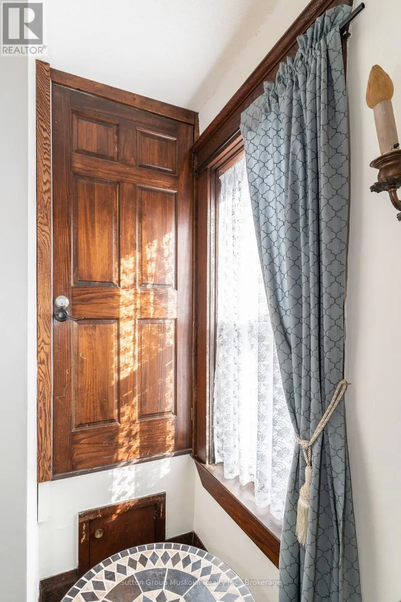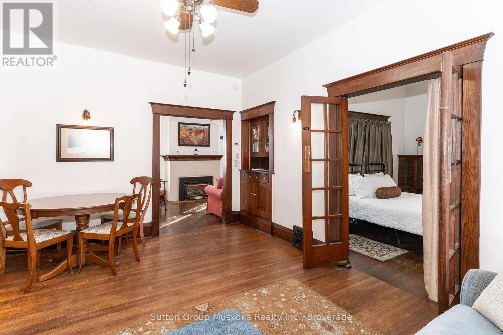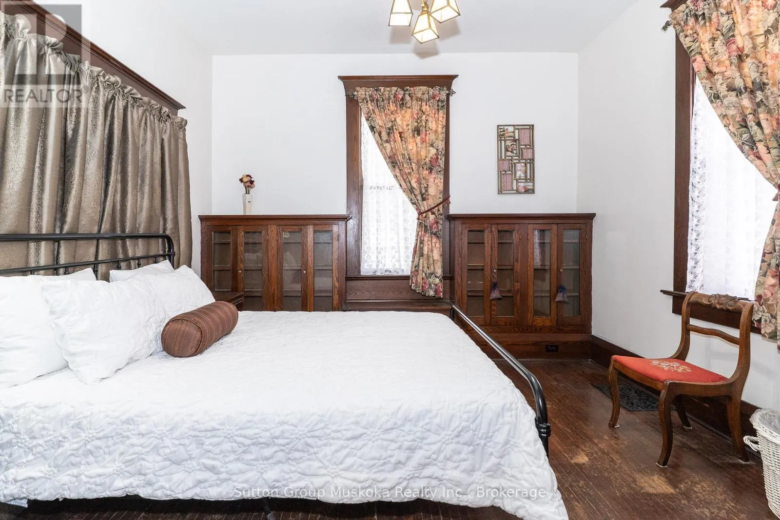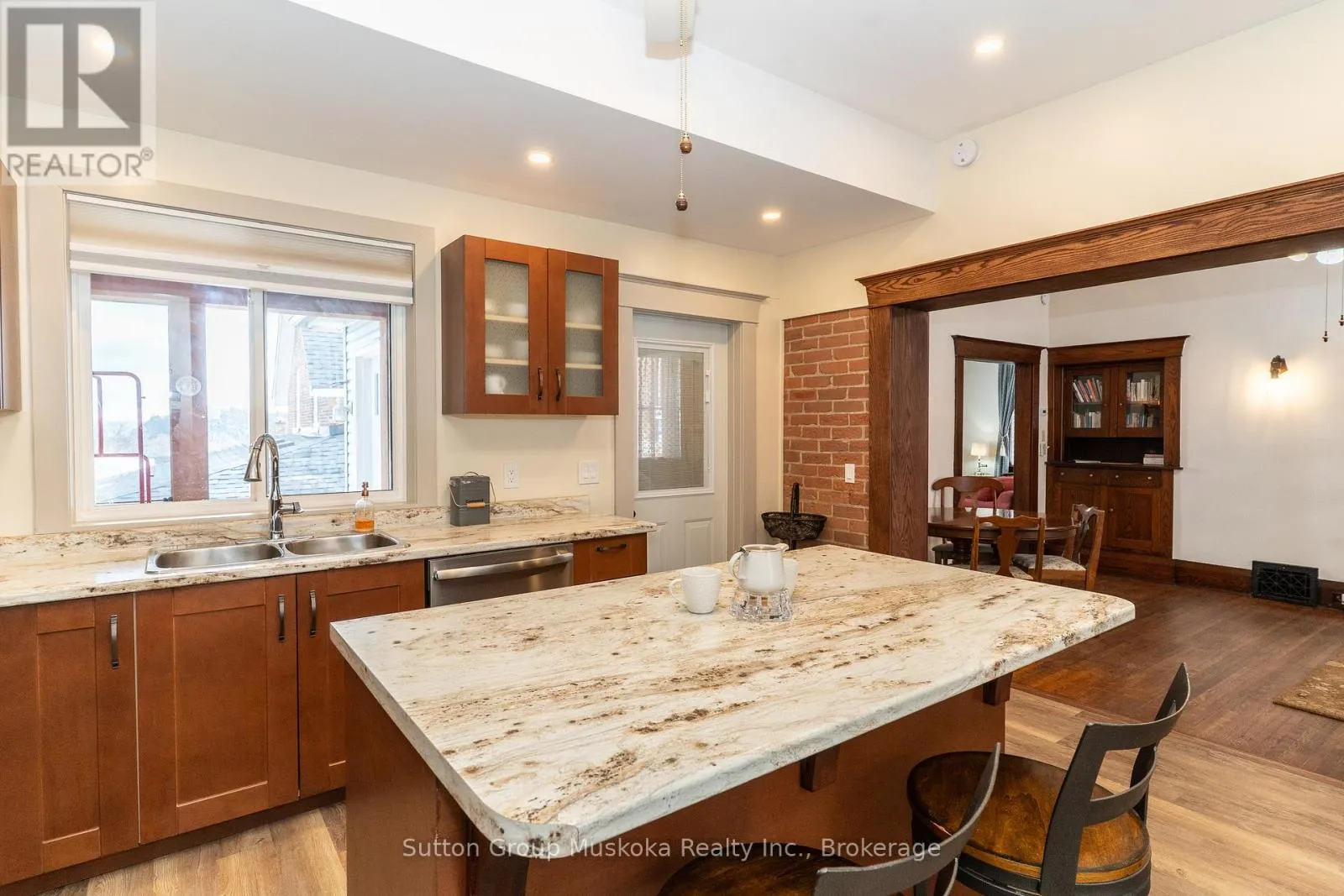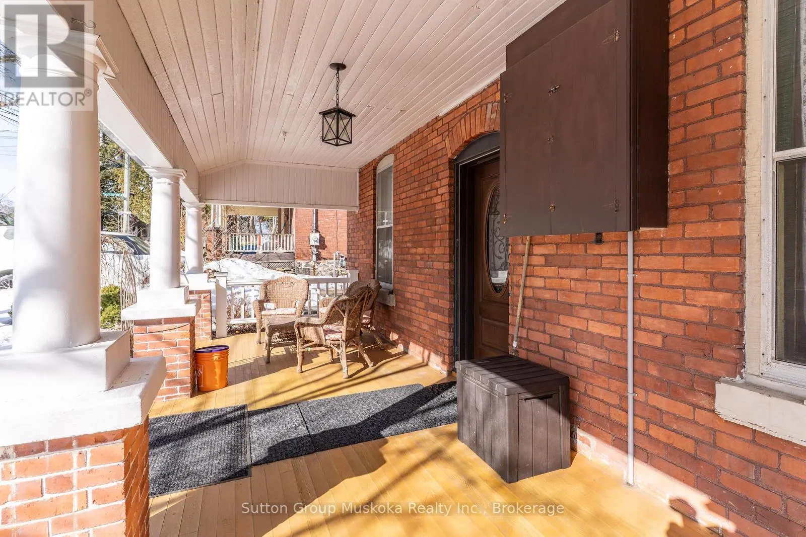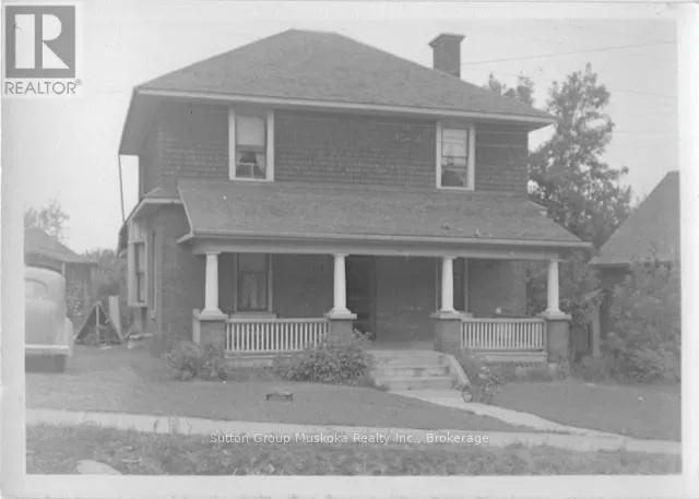 Cross Streets: Lorne St and Mary St W. ** Directions: Main St to Lorne St S to Mary St W to Sign on Property. Step up to this Circa 1910 elegant home, & admire the sophisticated craftsmanship of yesteryear's original woodwork, skilled stone masonry two-storey design. Main front foyer opens to 9' ceilings throughout, featuring built-in oak bookshelves with glass doors, oak flooring, evoking nostalgic memories of the "good ole days". Main floor bedroom boasts of antique built-ins; a 4-piece bathroom, & an oak door that can lead to the upper unit, if the original oak stairs (stored) are re-installed. Living room's gas fireplace offers ambiance, supplementing 2-stage gas furnace (2025). The huge dining room with 9' bay window speaks of social gatherings of the elite. Continuing to the expansive kitchen, upgraded maple cabinetry with glass door uppers, SS chimney range hood, easy to care for counter tops, stainless steel appliances, walk-in pantry, plus entry to the main floor laundry room. A separate private entrance leads to the upper two-bedroom, 3-piece bathroom, living room apartment, boasting its own eat-in kitchen, SS appliances & walk-in pantry with maple hardwood flooring throughout. The larger bedroom has a unique feature: a gabled storage space that was once a play room! This spacious home offers two covered porches (front and the back), with tongue & groove wood flooring (hemlock at front). The wrap-around back porch also displays 8"x8" Douglas Fir posts, pine D-channel siding; creating a poetic tranquil setting with view of Lion's Lookout. Additional features, original garage with loft, built-in workbench, aluminum roofing, extending over expanded garage. The potential of developing a carriage home. Asphalt roof, cedar shake accents & original locally-produced brick add to the magnificent appeal of this home. This legal duplex an excellent income producer but also perfect for a two-generation home. Asphalt driveway offers plenty of parking. 5-minute walk to downtown Huntsville's vibrant life: restaurants, shops, arts & outdoor sports for which Muskoka is famous. (id:27476)