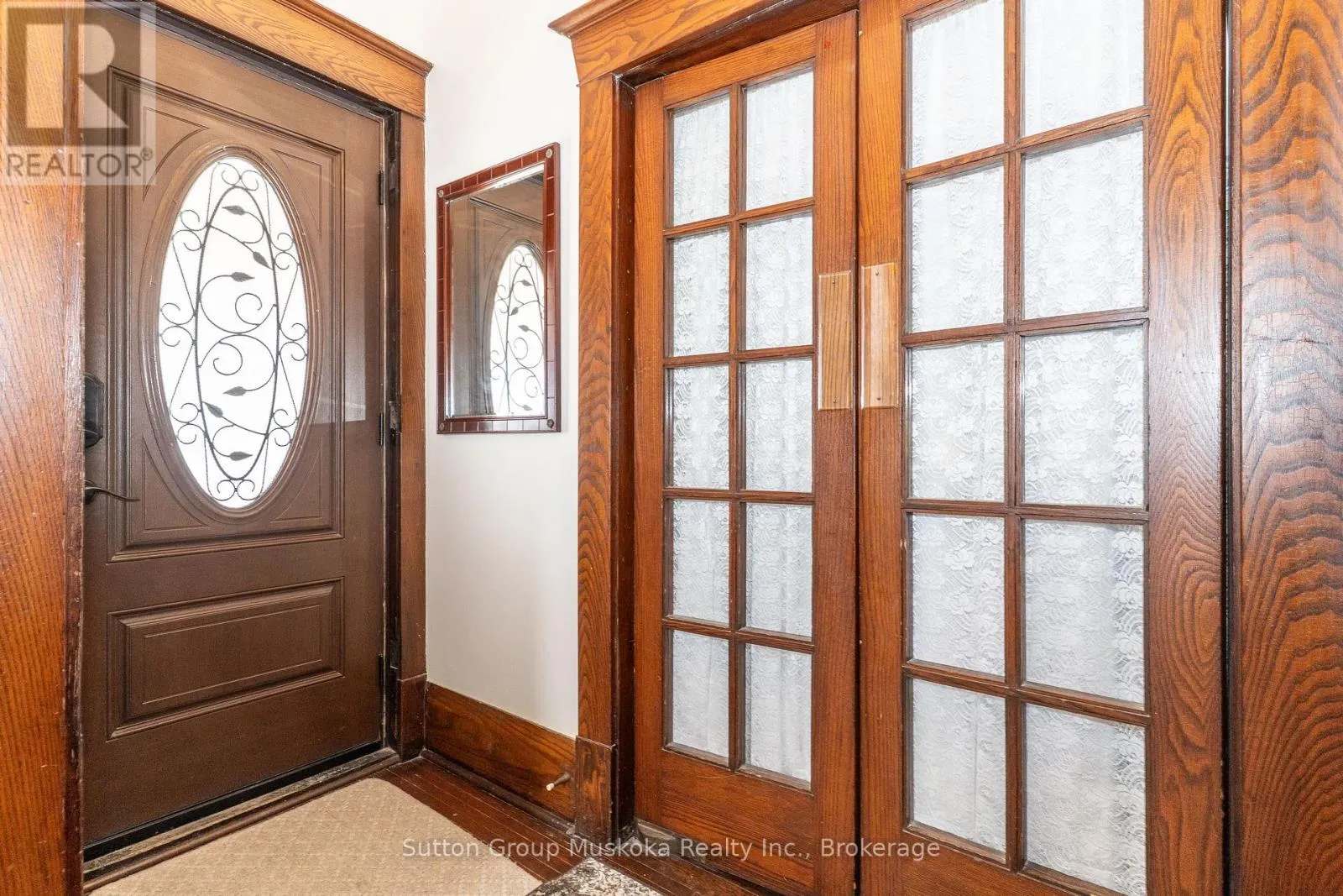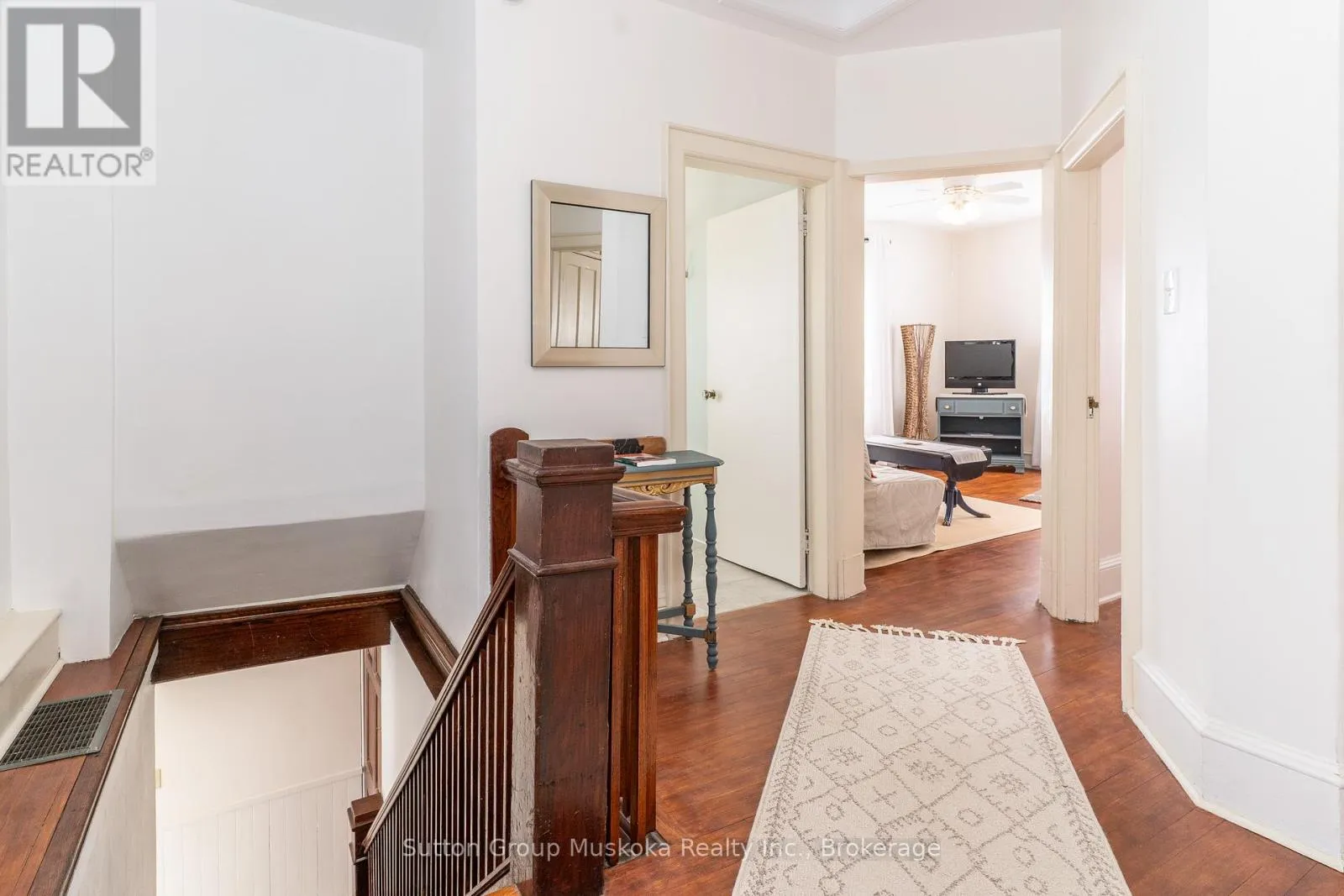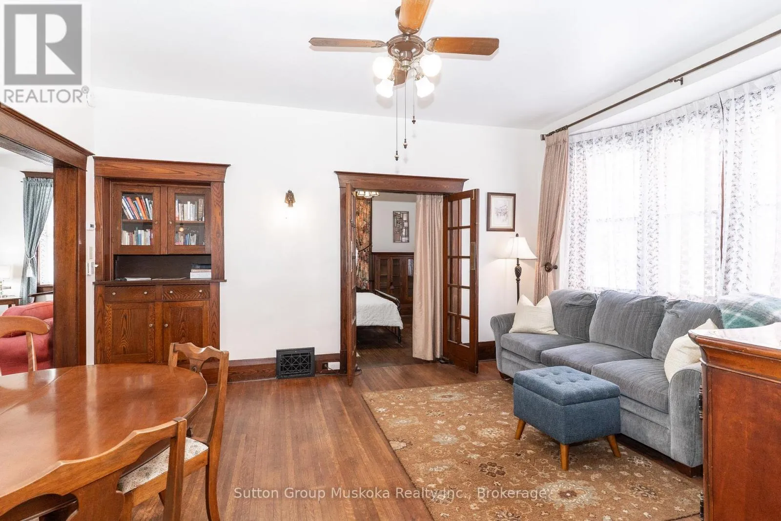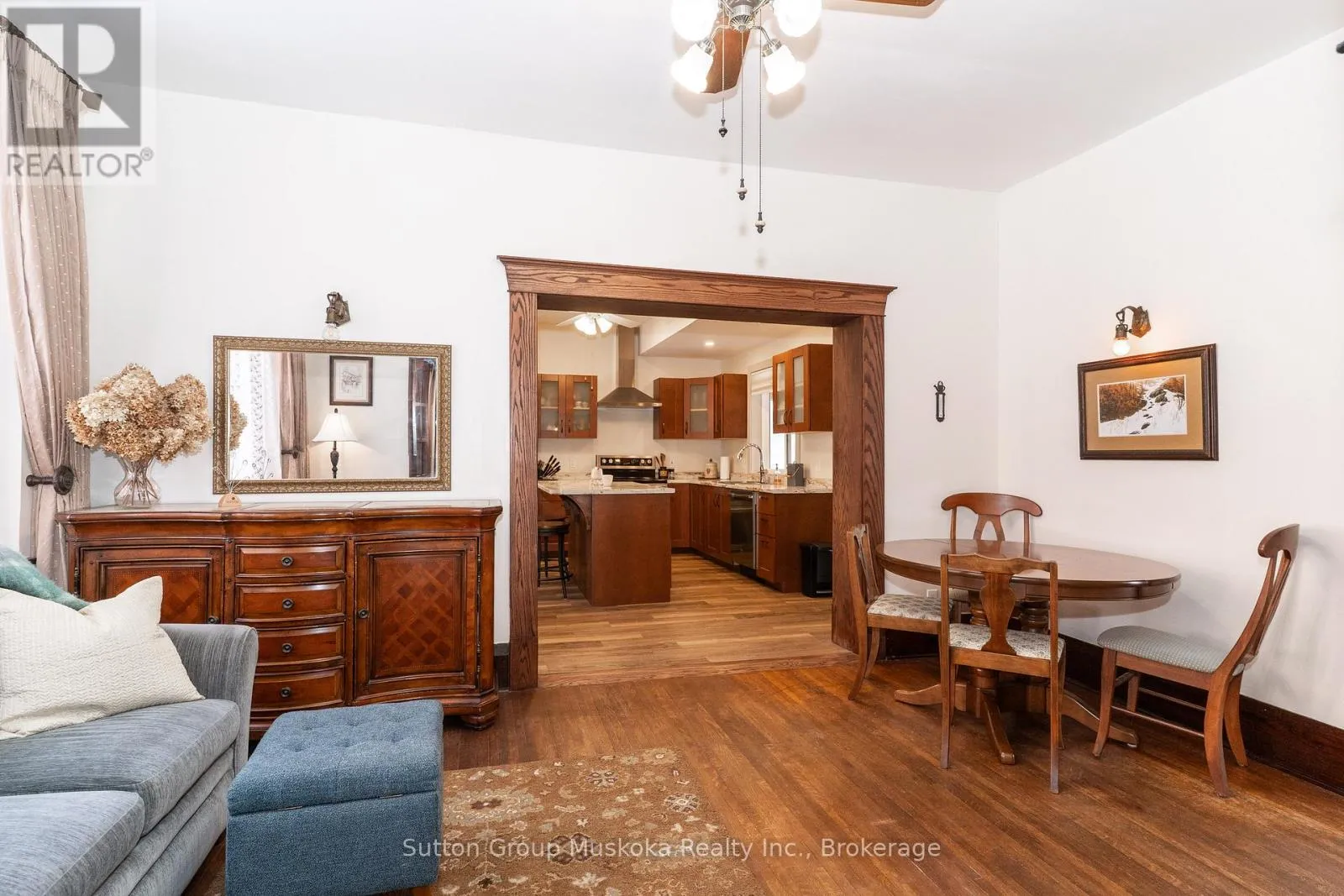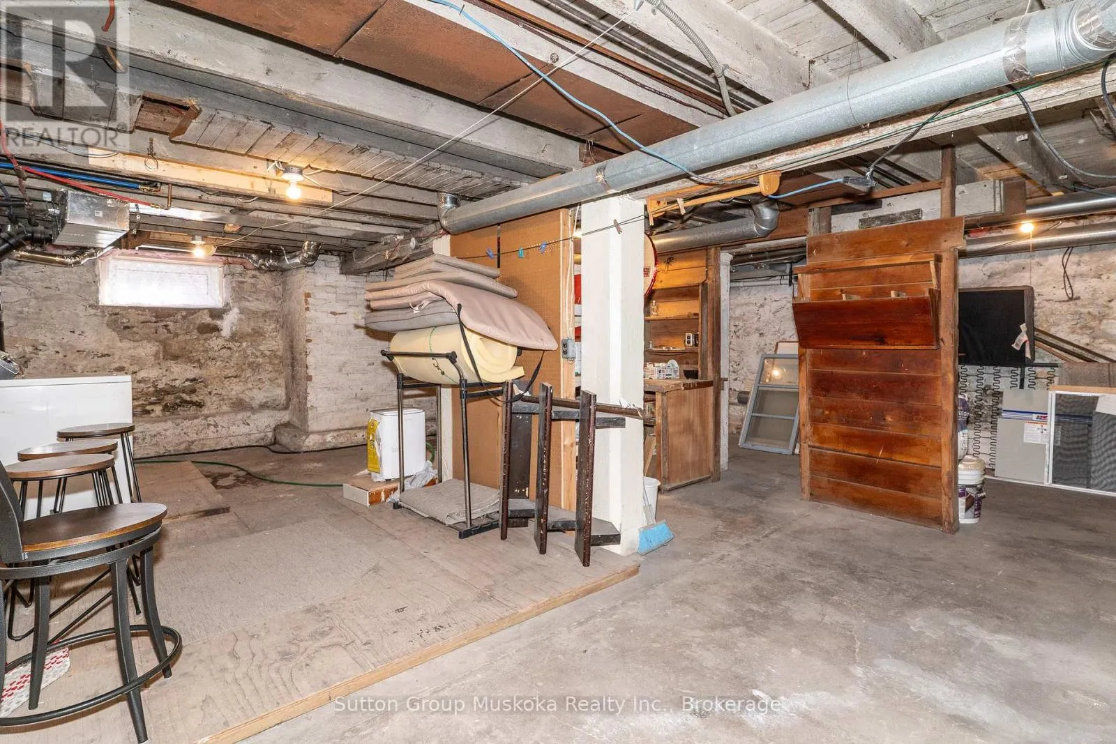 Cross Streets: Lorne St and Mary St W. ** Directions: Main St to Lorne St S to Mary St W to Sign on Property. Step up to this Circa 1910 elegant home, & admire the sophisticated craftsmanship of yesteryear's original woodwork, skilled stone masonry two-storey design. Main front foyer opens to 9' ceilings throughout, featuring built-in oak bookshelves with glass doors, oak flooring, evoking nostalgic memories of the "good ole days". Main floor bedroom boasts of antique built-ins; a 4-piece bathroom, & an oak door that can lead to the upper unit, if the original oak stairs (stored) are re-installed. Living room's gas fireplace offers ambiance, supplementing 2-stage gas furnace (2025). The huge dining room with 9' bay window speaks of social gatherings of the elite. Continuing to the expansive kitchen, upgraded maple cabinetry with glass door uppers, SS chimney range hood, easy to care for counter tops, stainless steel appliances, walk-in pantry, plus entry to the main floor laundry room. A separate private entrance leads to the upper two-bedroom, 3-piece bathroom, living room apartment, boasting its own eat-in kitchen, SS appliances & walk-in pantry with maple hardwood flooring throughout. The larger bedroom has a unique feature: a gabled storage space that was once a play room! This spacious home offers two covered porches (front and the back), with tongue & groove wood flooring (hemlock at front). The wrap-around back porch also displays 8"x8" Douglas Fir posts, pine D-channel siding; creating a poetic tranquil setting with view of Lion's Lookout. Additional features, original garage with loft, built-in workbench, aluminum roofing, extending over expanded garage. The potential of developing a carriage home. Asphalt roof, cedar shake accents & original locally-produced brick add to the magnificent appeal of this home. This legal duplex an excellent income producer but also perfect for a two-generation home. Asphalt driveway offers plenty of parking. 5-minute walk to downtown Huntsville's vibrant life: restaurants, shops, arts & outdoor sports for which Muskoka is famous. (id:27476)