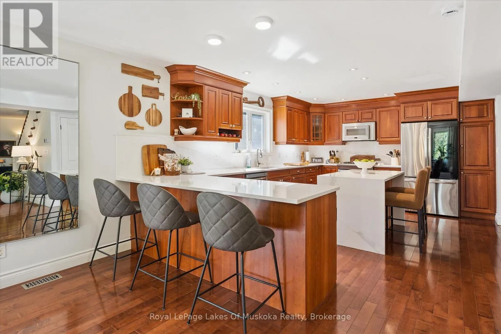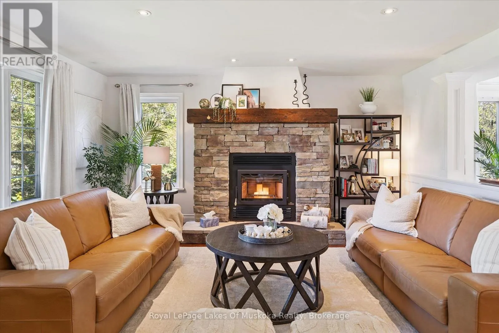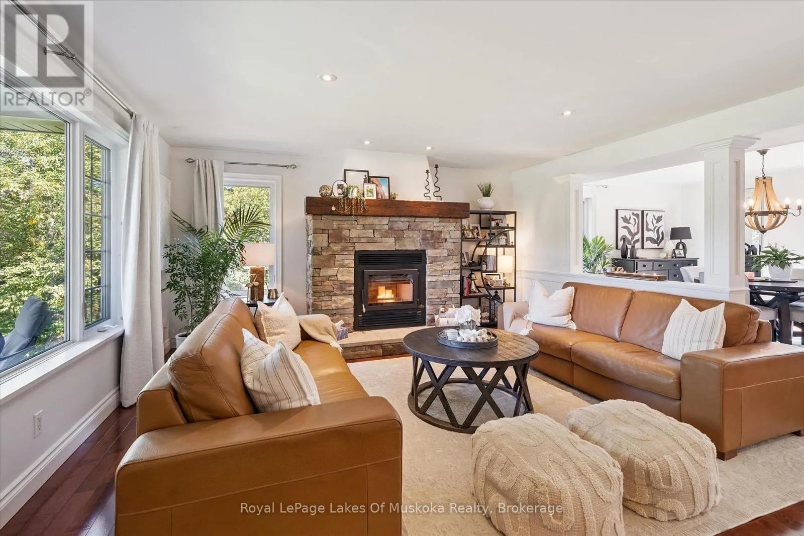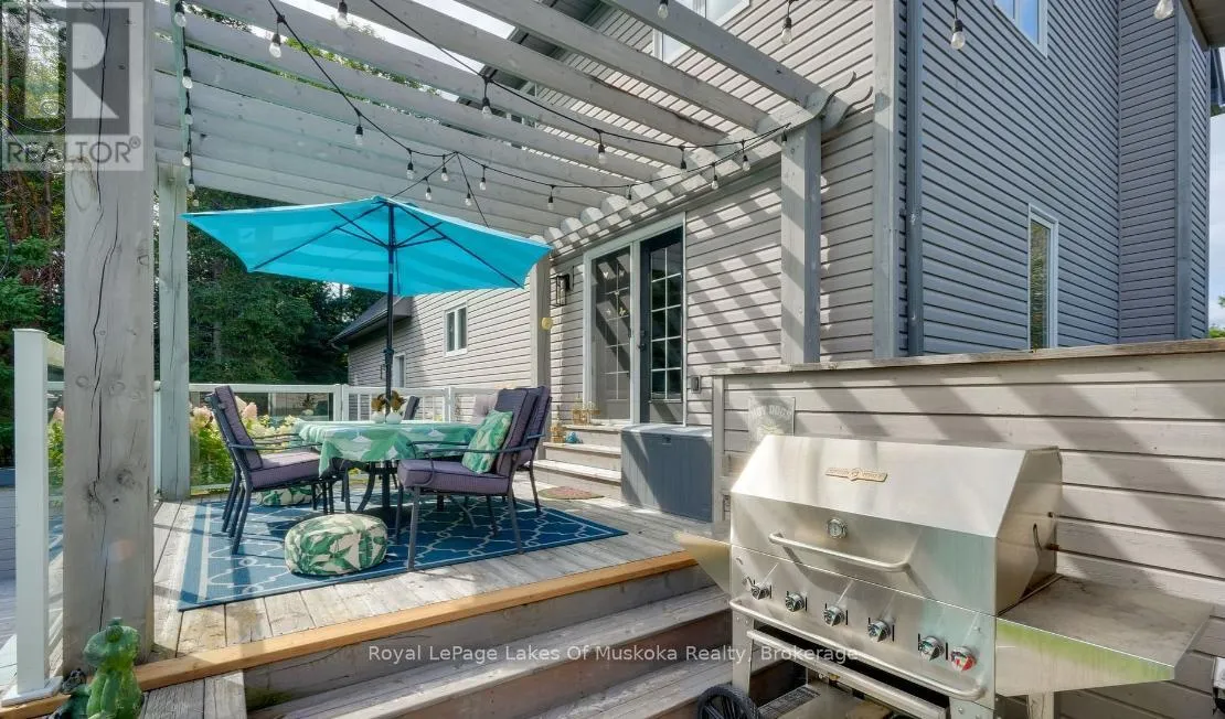 Cross Streets: Brunel and Renwick. ** Directions: Brunel Rd to Renwick Dr to Thomas. It starts with the drive in. Just minutes from Huntsville's downtown, you arrive in Riverview Estates, where the pace slows and nature feels close. The Muskoka River winds nearby, connecting Fairy Lake to Mary Lake, quietly shaping the lifestyle around it. A granite walkway leads you to the front porch, the kind of place where mornings begin with coffee and evenings end watching deer pass through. Inside, the home opens into a warm, connected living and dining space, anchored by a stone, wood-burning fireplace. Hardwood floors lead into a kitchen that's both stylish and functional, with new quartz countertops, a gas oven, a large island, and views into the wooded backyard. Upstairs offers three generous bedrooms, including a primary suite with ensuite and double sinks, plus updated bathrooms throughout. The lower level adds even more room to live, with a finished basement featuring a rec room, bedroom, office space, and full bath. Above the garage, a bonus room with its own heat creates the perfect space for movie nights, a playroom, or a quiet office. Out back, privacy takes over. A tree-lined yard, pool with a new heater, large deck, and screened-in shed set the stage for summer days and relaxed evenings. With major updates already done, including A/C, roof, Generac system, and hot water on demand, the focus stays on living, not maintaining. Being just across from Riverside Public School, over 50 acres of trails, plus nearby boat launches, complete the picture. This is where everyday life starts to feel like Muskoka. (id:27476)