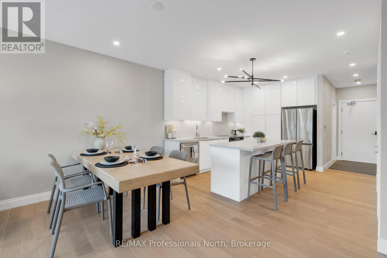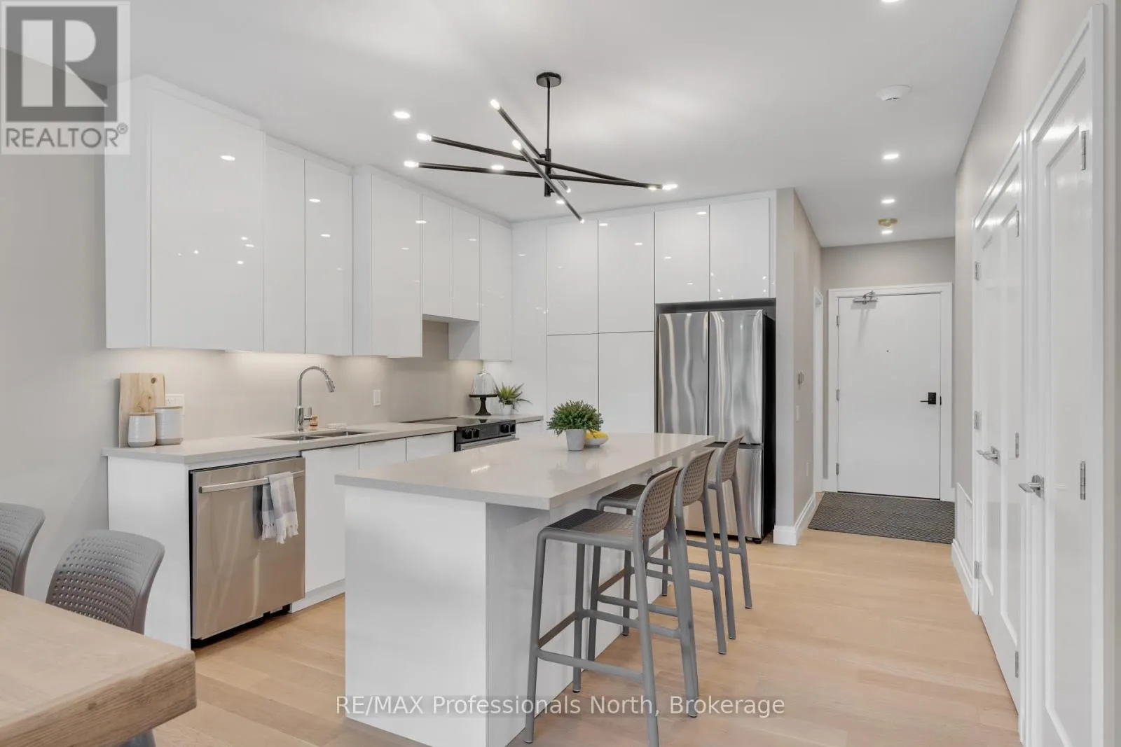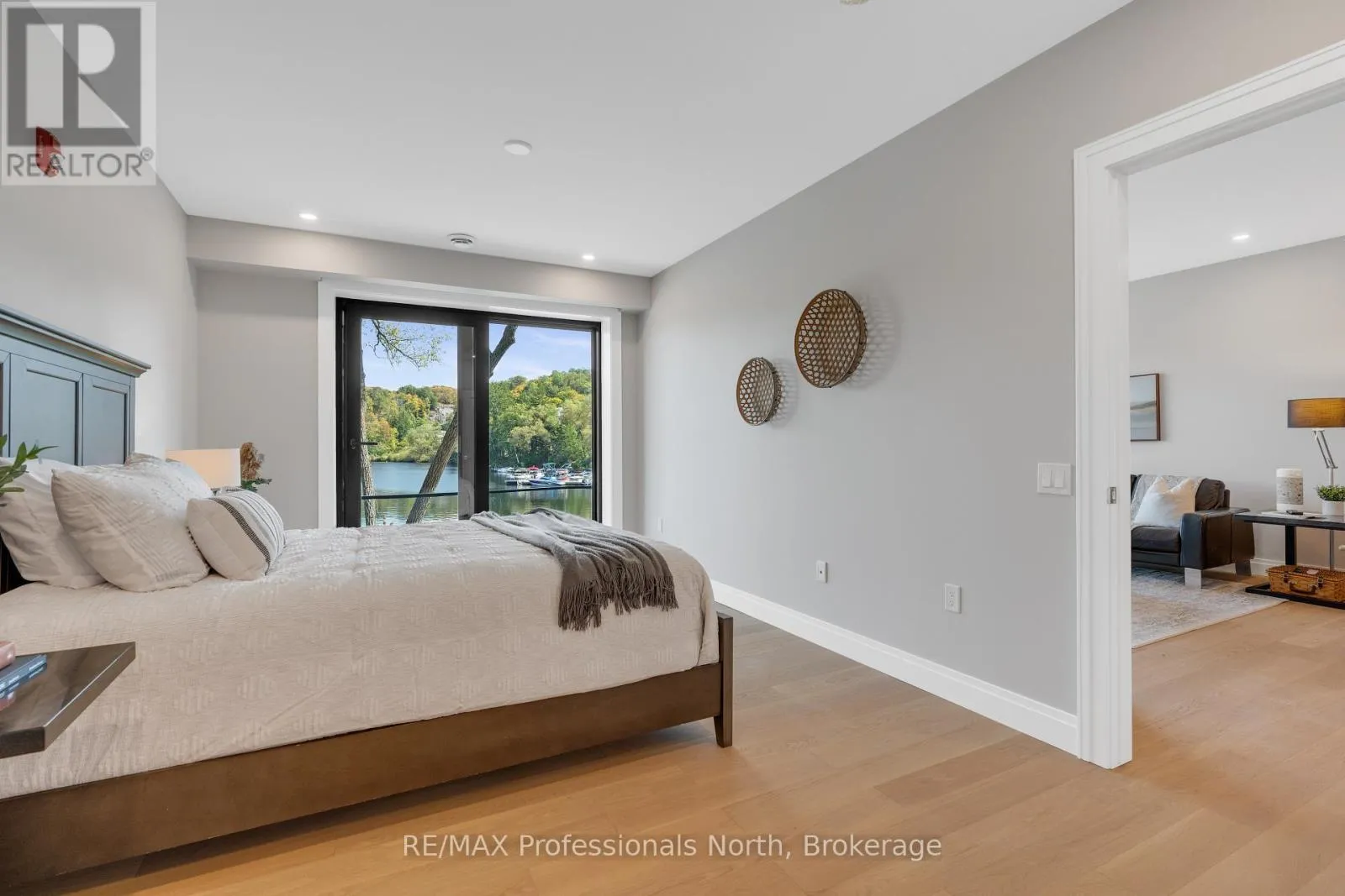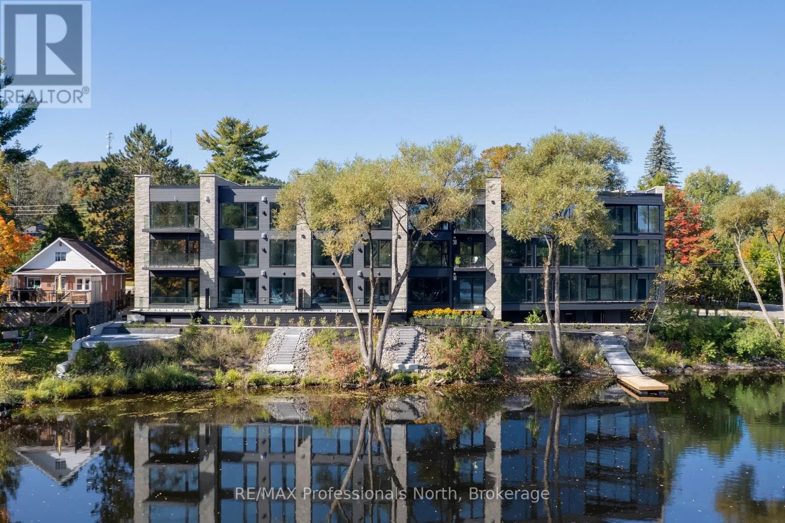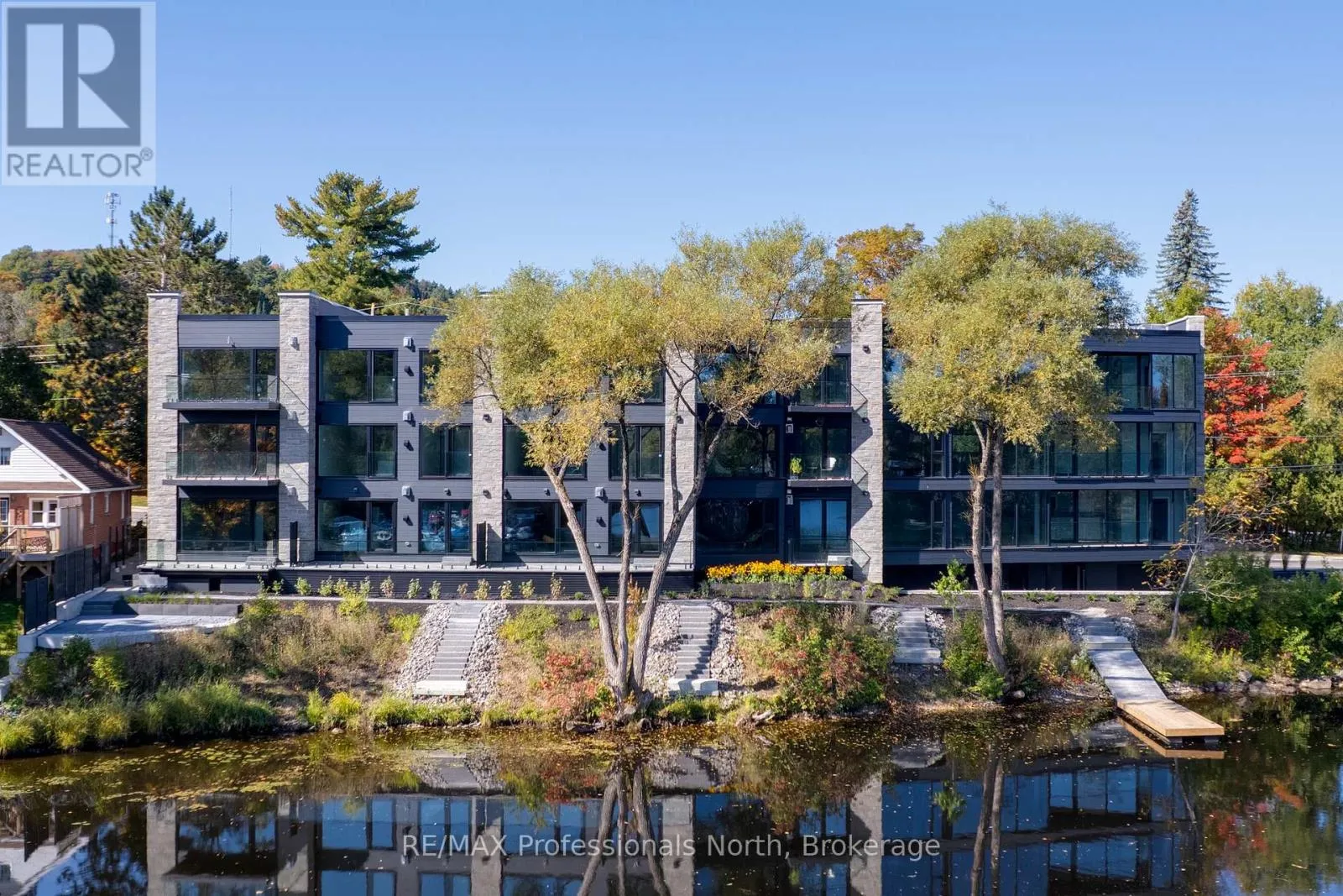 Cross Streets: Brunel and Veterans Way. ** Directions: Brunel Road to Property. Welcome to Muskoka Riverbend Condominiums at 32 Brunel Road in Huntsville. This beautifully appointed 1-bedroom plus den suite offers first floor convenience with an exceptional blend of comfort, style, and waterfront tranquility in an exclusive boutique building of just 15 residences.Suite 104 features a spacious open-concept layout with a modern kitchen, generous living and dining areas, and a private large balcony overlooking the Muskoka River-perfect for relaxing or entertaining. The versatile den provides an ideal space for a home office or guest area.Enjoy upscale finishes throughout, including custom cabinetry, engineered wide plank hardwood flooring, large format tile in the bathroom, and premium plumbing fixtures.Located just a short walk to vibrant Main Street Huntsville, you'll have convenient access to shops, dining, and everyday amenities while enjoying the serenity of riverside living.The unit includes one underground parking space and is available soon for a minimum one-year lease.Experience refined Muskoka living in one of Huntsville's most desirable condominium communities. (id:27476)