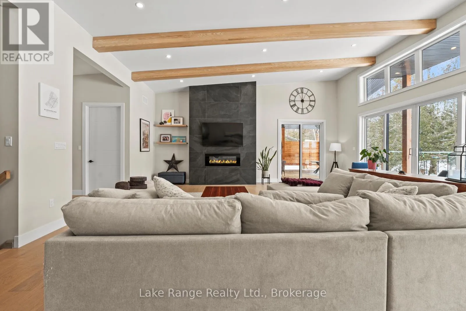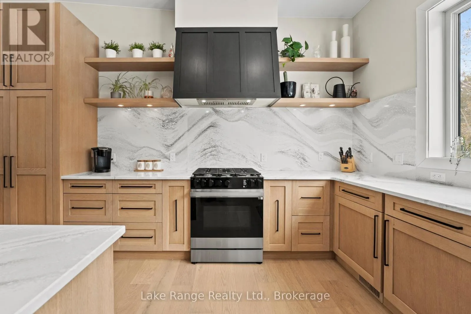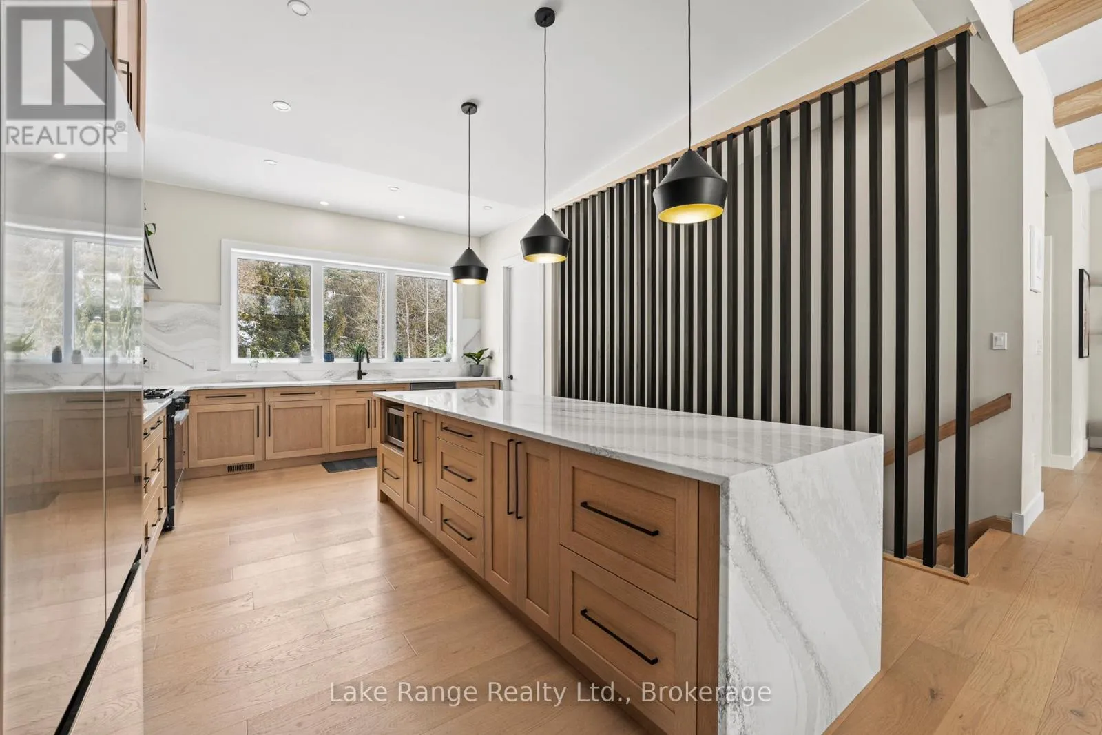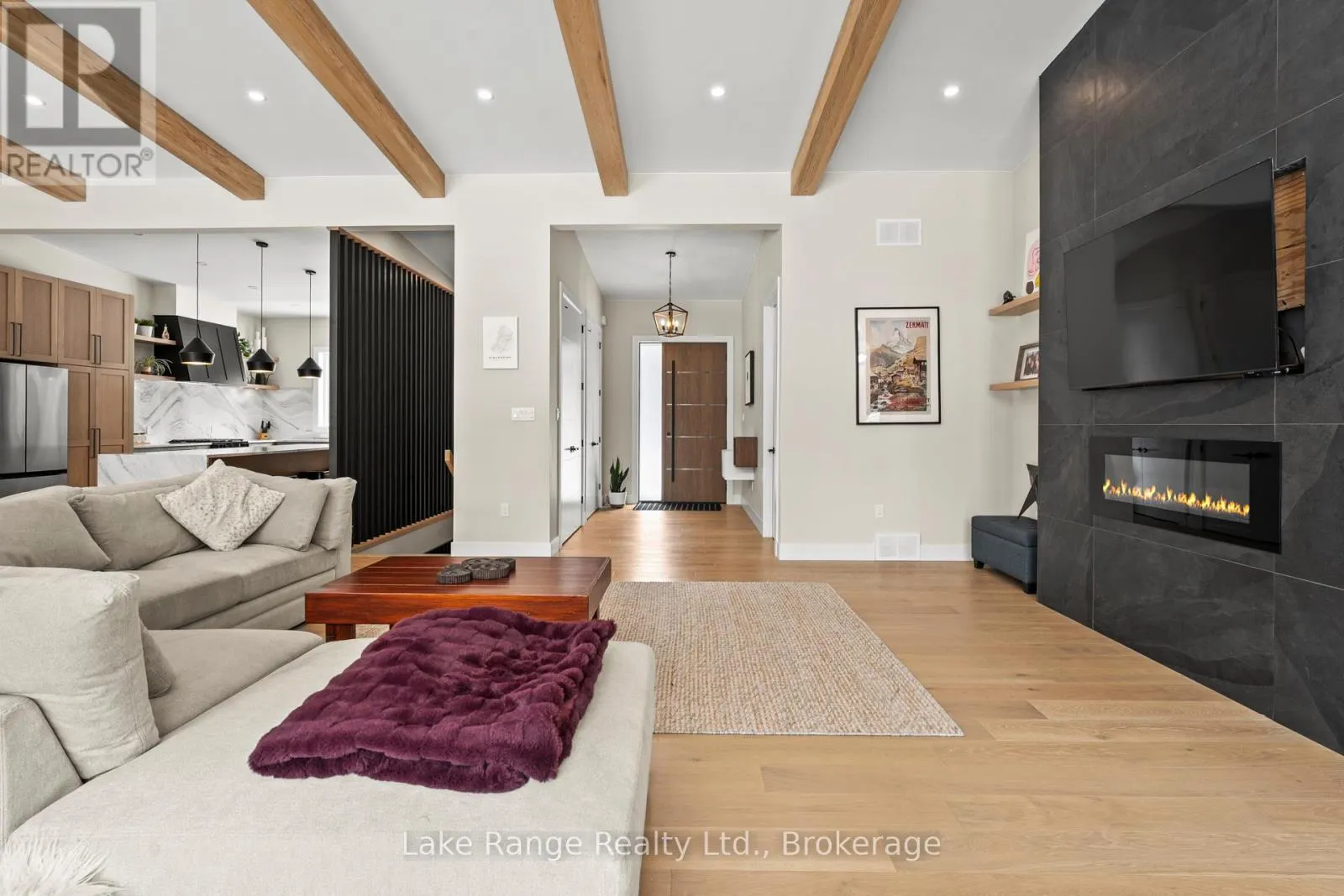Cross Streets: lake range and bell drive. ** Directions: Lake Range then right on Bell Drive, then right on Blairs Trail then left on Green Brae. Welcome to this warm and modern custom-built 2024 home, ideally located just steps from the beach in the sought-after community of Blairs Grove. This one-of-a-kind residence features soaring 14-foot vaulted ceilings with exposed beams in the open-concept living and dining area, complemented by expansive windows and sliding glass doors that flood the space with natural light and offer serene forest views. Ten-foot ceilings extend throughout the three main-floor bedrooms, including a spacious primary suite with a walk-in closet featuring custom shelving and a spa-inspired ensuite with heated floors. The stunning kitchen showcases an 11-foot quartz island, white oak cabinetry, waterfall accents, and sleek modern finishes. Engineered hardwood floors flow throughout the main level, which also includes a five-piece bathroom, modern fireplace, and three sliding doors leading to a 56-foot covered back deck with beautiful 16 foot Douglas Fir posts. The fully finished lower level offers 3 additional bedrooms and ample storage space with 9 foot ceilings throughout and a 1,200 sq. ft. custom-finished rec room, perfect for family time or entertaining. The striking exterior combines brick with LP Smart Side board-and-batten siding and backs onto 25 acres of nature trails for added privacy. Located just 160 meters from beach access, this exceptional home offers the best of modern design and beachside living. Contact your Realtor today and come take a look. (id:27476)