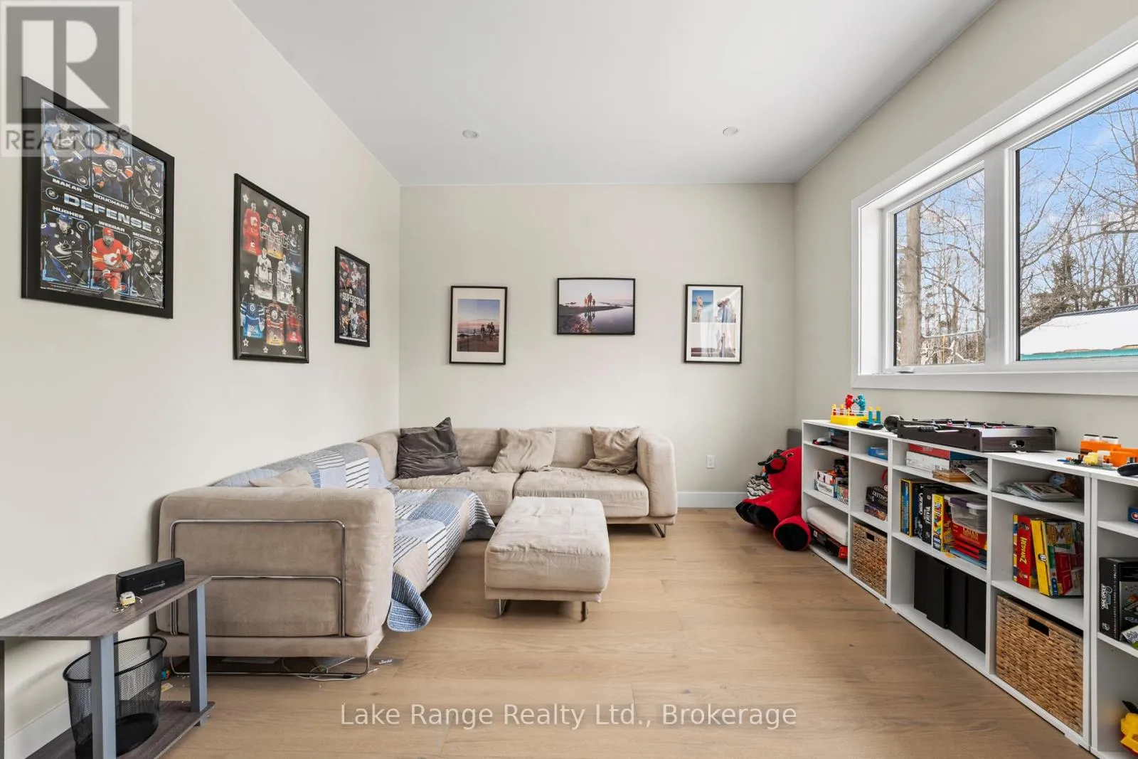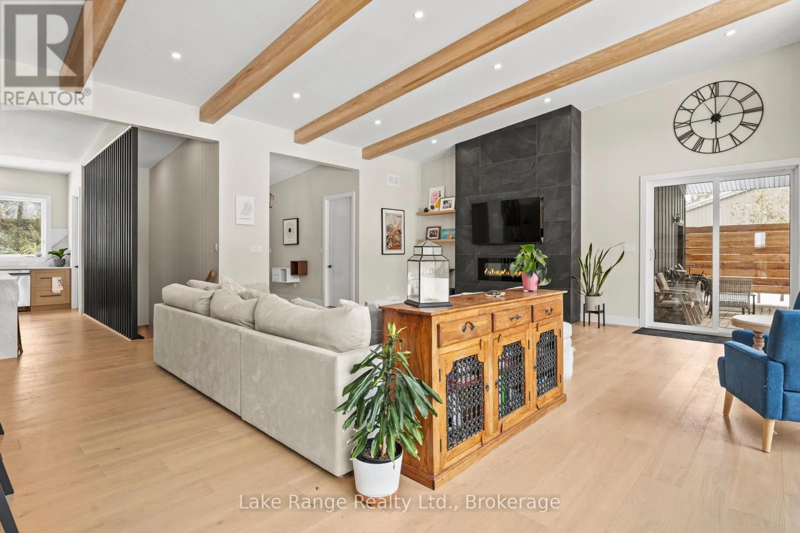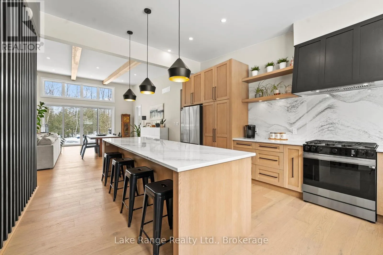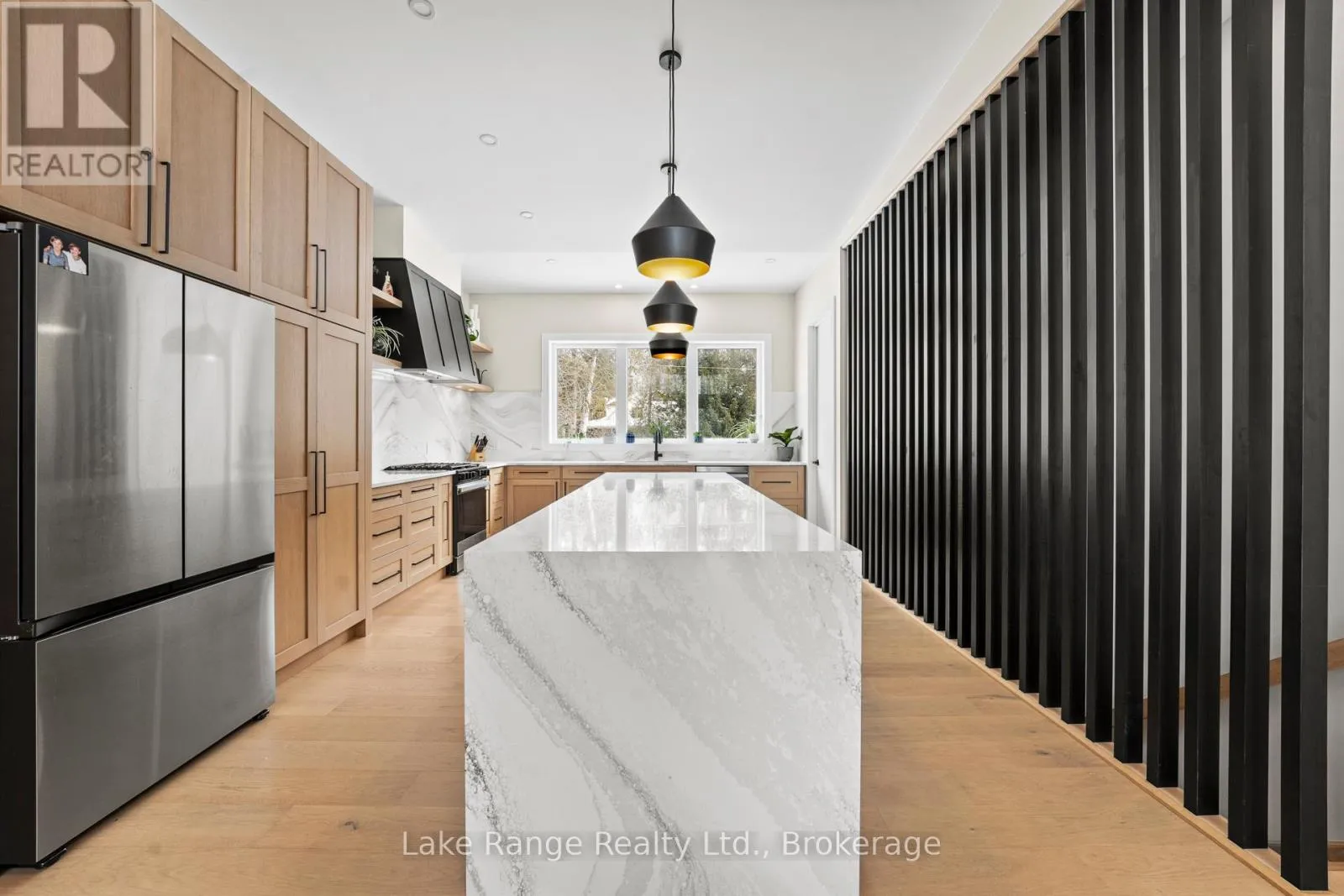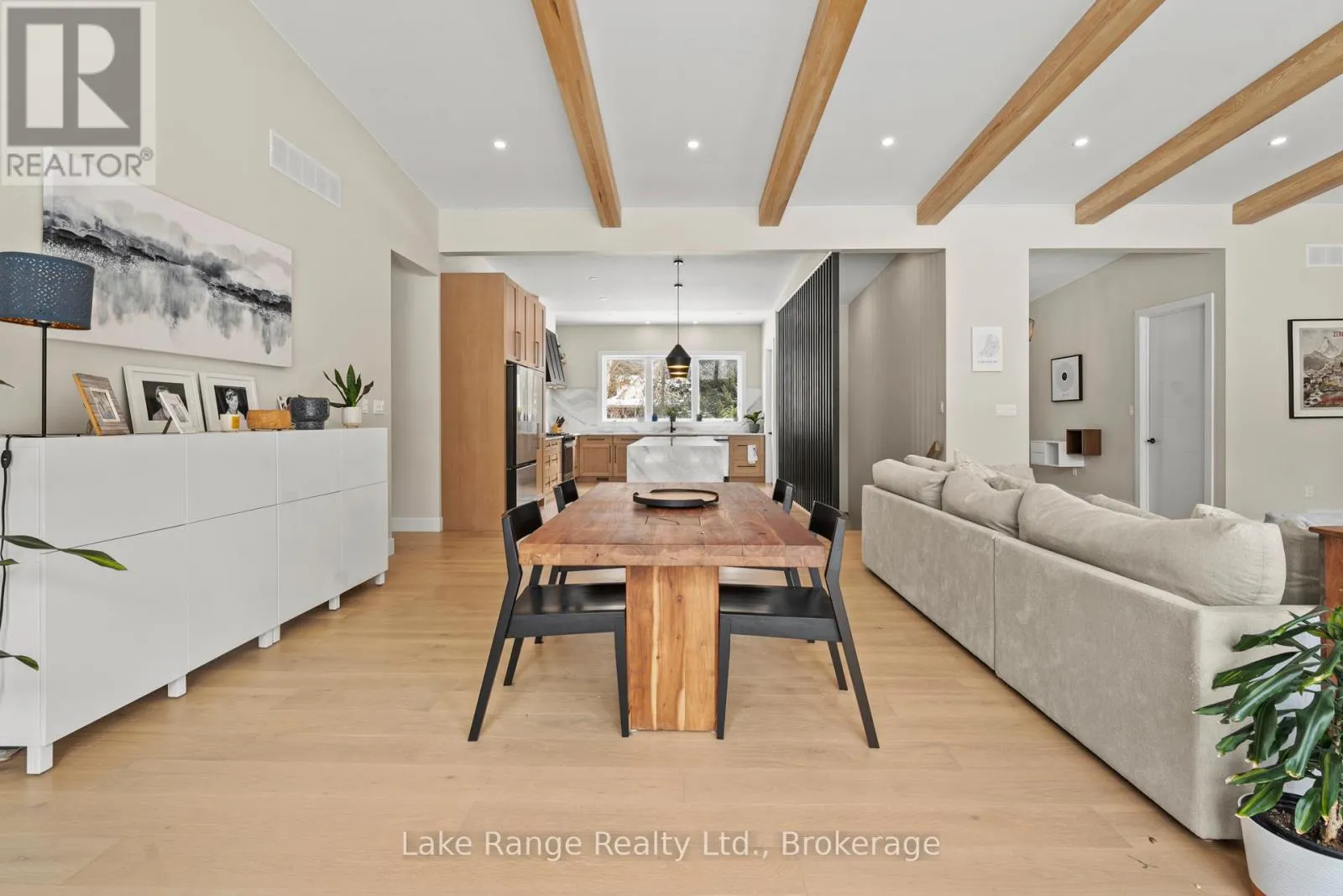 Cross Streets: lake range and bell drive. ** Directions: Lake Range then right on Bell Drive, then right on Blairs Trail then left on Green Brae. Welcome to this warm and modern custom-built 2024 home, ideally located just steps from the beach in the sought-after community of Blairs Grove. This one-of-a-kind residence features soaring 14-foot vaulted ceilings with exposed beams in the open-concept living and dining area, complemented by expansive windows and sliding glass doors that flood the space with natural light and offer serene forest views. Ten-foot ceilings extend throughout the three main-floor bedrooms, including a spacious primary suite with a walk-in closet featuring custom shelving and a spa-inspired ensuite with heated floors. The stunning kitchen showcases an 11-foot quartz island, white oak cabinetry, waterfall accents, and sleek modern finishes. Engineered hardwood floors flow throughout the main level, which also includes a five-piece bathroom, modern fireplace, and three sliding doors leading to a 56-foot covered back deck with beautiful 16 foot Douglas Fir posts. The fully finished lower level offers 3 additional bedrooms and ample storage space with 9 foot ceilings throughout and a 1,200 sq. ft. custom-finished rec room, perfect for family time or entertaining. The striking exterior combines brick with LP Smart Side board-and-batten siding and backs onto 25 acres of nature trails for added privacy. Located just 160 meters from beach access, this exceptional home offers the best of modern design and beachside living. Contact your Realtor today and come take a look. (id:27476)
