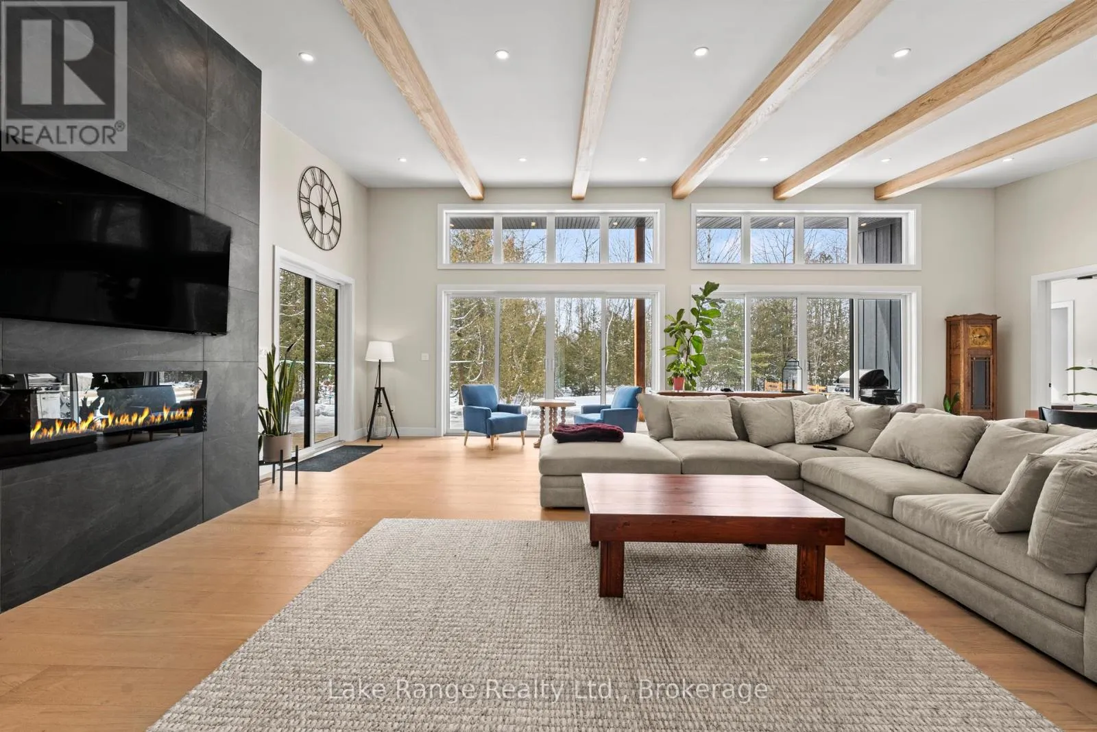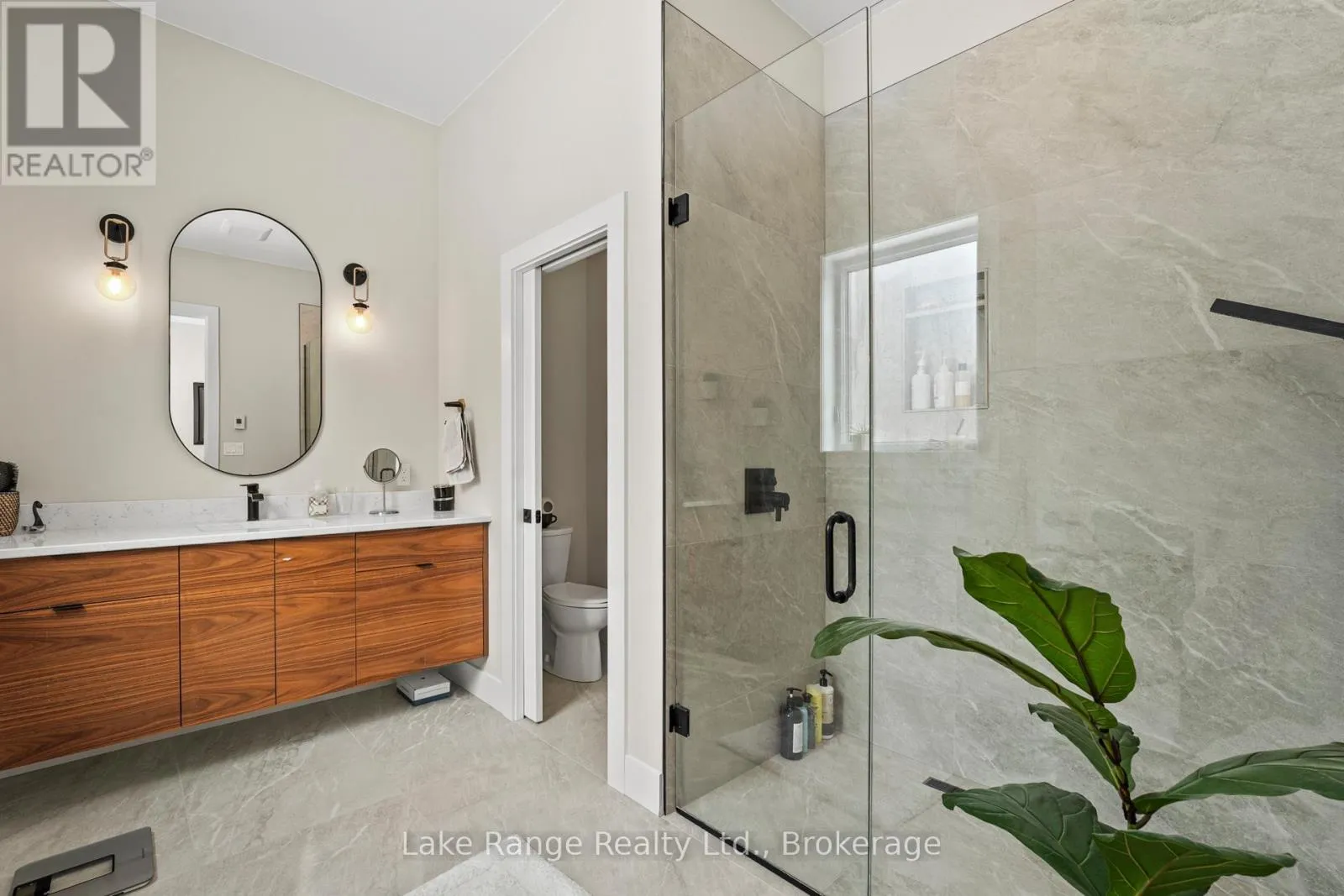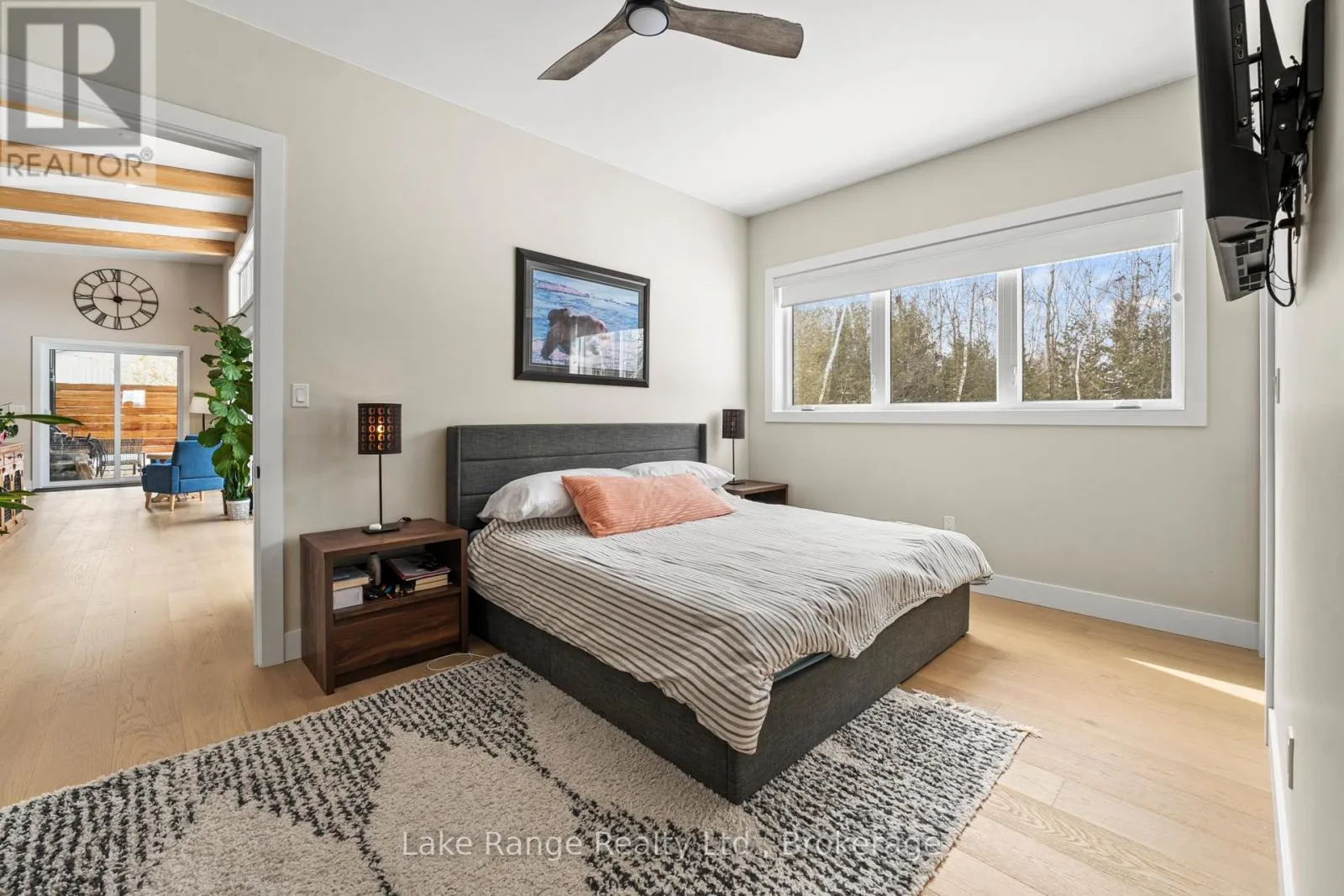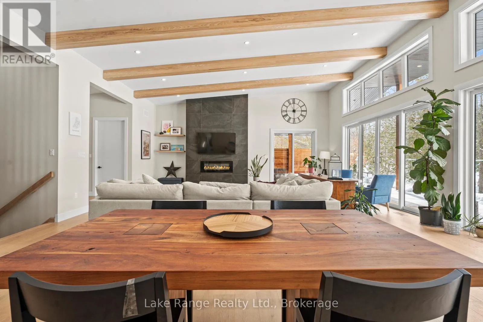 Cross Streets: lake range and bell drive. ** Directions: Lake Range then right on Bell Drive, then right on Blairs Trail then left on Green Brae. Welcome to this warm and modern custom-built 2024 home, ideally located just steps from the beach in the sought-after community of Blairs Grove. This one-of-a-kind residence features soaring 14-foot vaulted ceilings with exposed beams in the open-concept living and dining area, complemented by expansive windows and sliding glass doors that flood the space with natural light and offer serene forest views. Ten-foot ceilings extend throughout the three main-floor bedrooms, including a spacious primary suite with a walk-in closet featuring custom shelving and a spa-inspired ensuite with heated floors. The stunning kitchen showcases an 11-foot quartz island, white oak cabinetry, waterfall accents, and sleek modern finishes. Engineered hardwood floors flow throughout the main level, which also includes a five-piece bathroom, modern fireplace, and three sliding doors leading to a 56-foot covered back deck with beautiful 16 foot Douglas Fir posts. The fully finished lower level offers 3 additional bedrooms and ample storage space with 9 foot ceilings throughout and a 1,200 sq. ft. custom-finished rec room, perfect for family time or entertaining. The striking exterior combines brick with LP Smart Side board-and-batten siding and backs onto 25 acres of nature trails for added privacy. Located just 160 meters from beach access, this exceptional home offers the best of modern design and beachside living. Contact your Realtor today and come take a look. (id:27476)